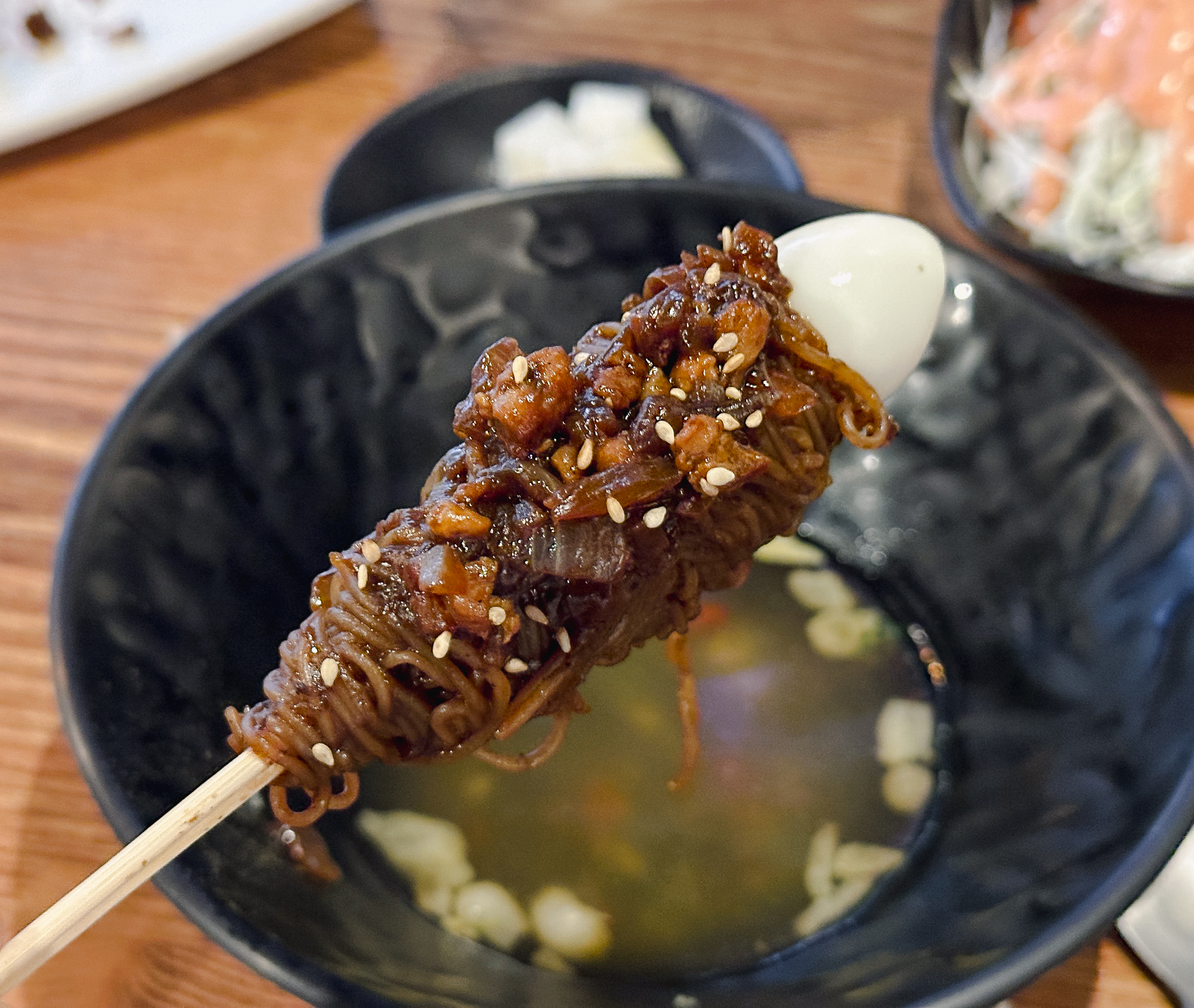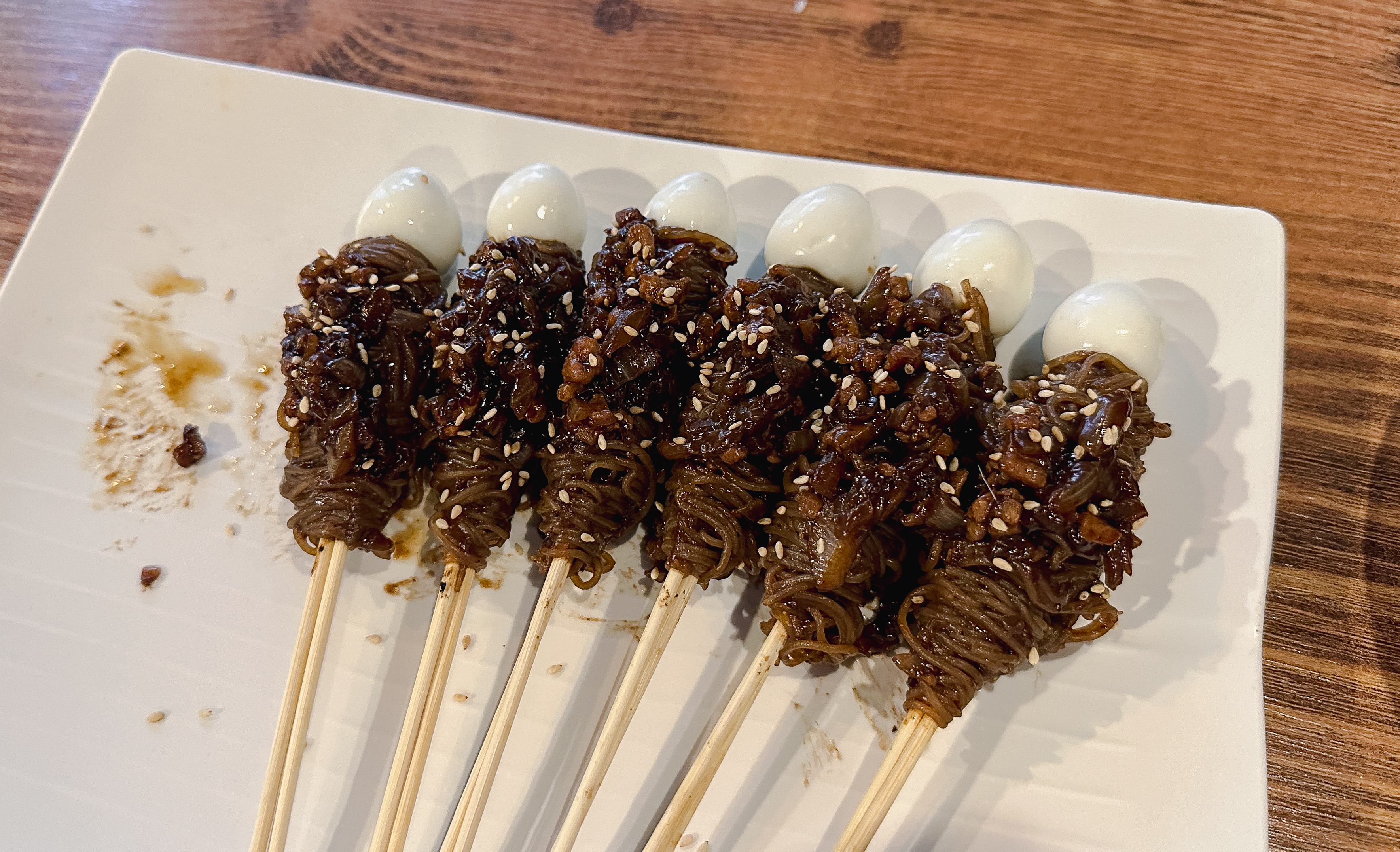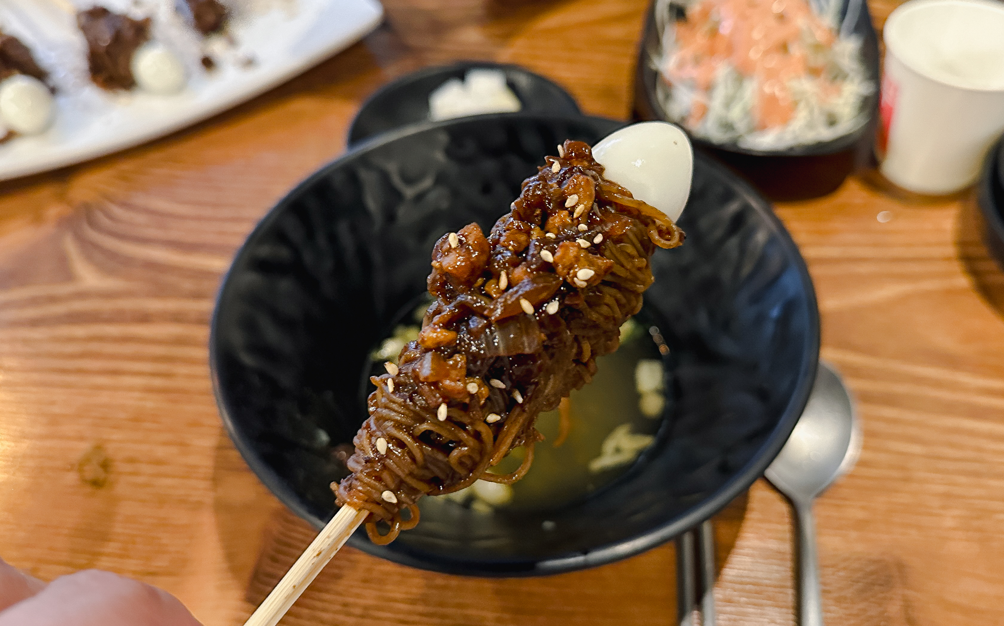 짜장냉면꼬치는 위와 같이 메추리알과 짜장냉면(?)을 꼬치에 꽂아서 만들어주셨습니다. 사이드로 양배추샐러드와 어묵이 함께 나왔습니다. 짜장냉면꼬치에 대해 자세히 살펴보시죠.