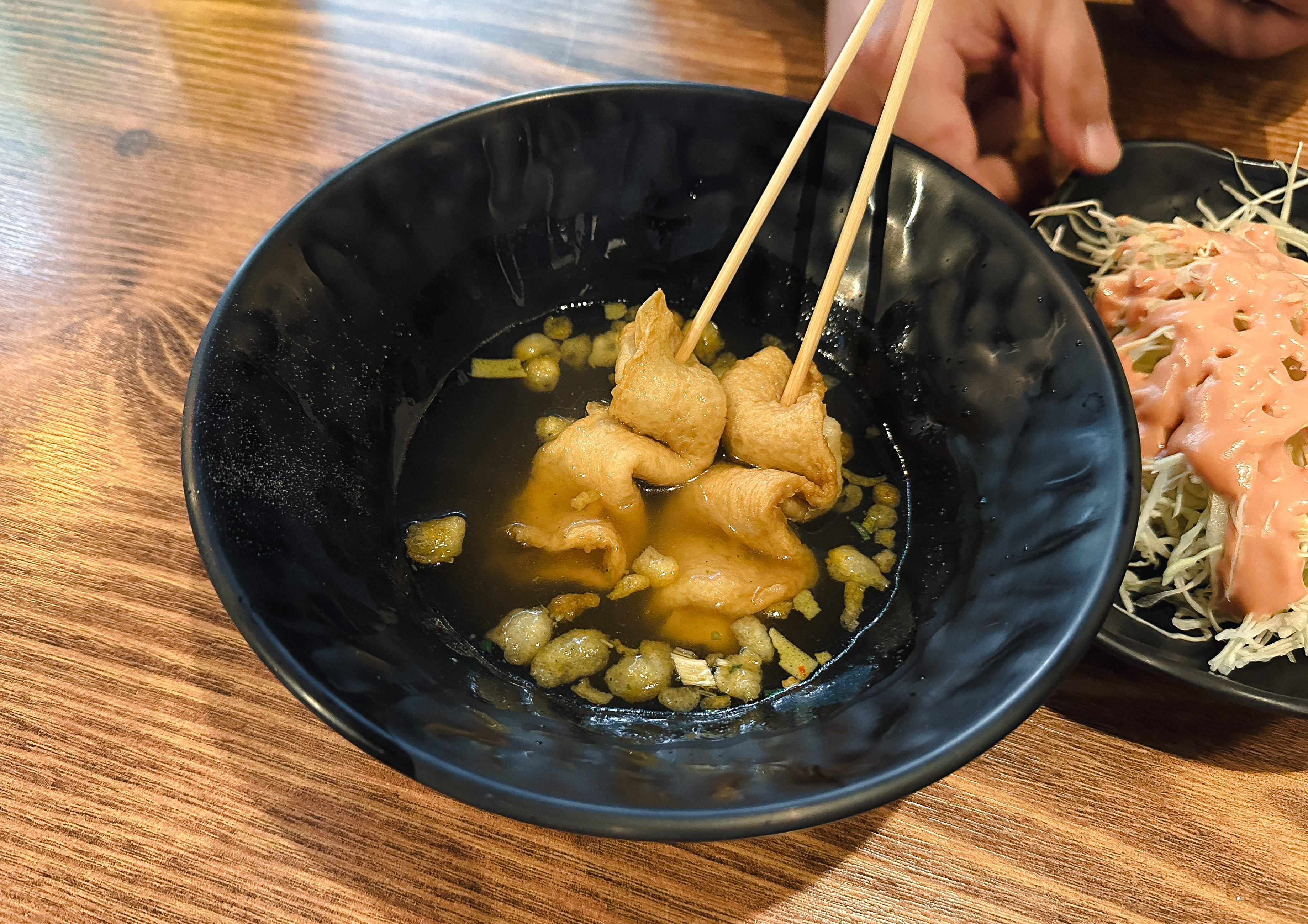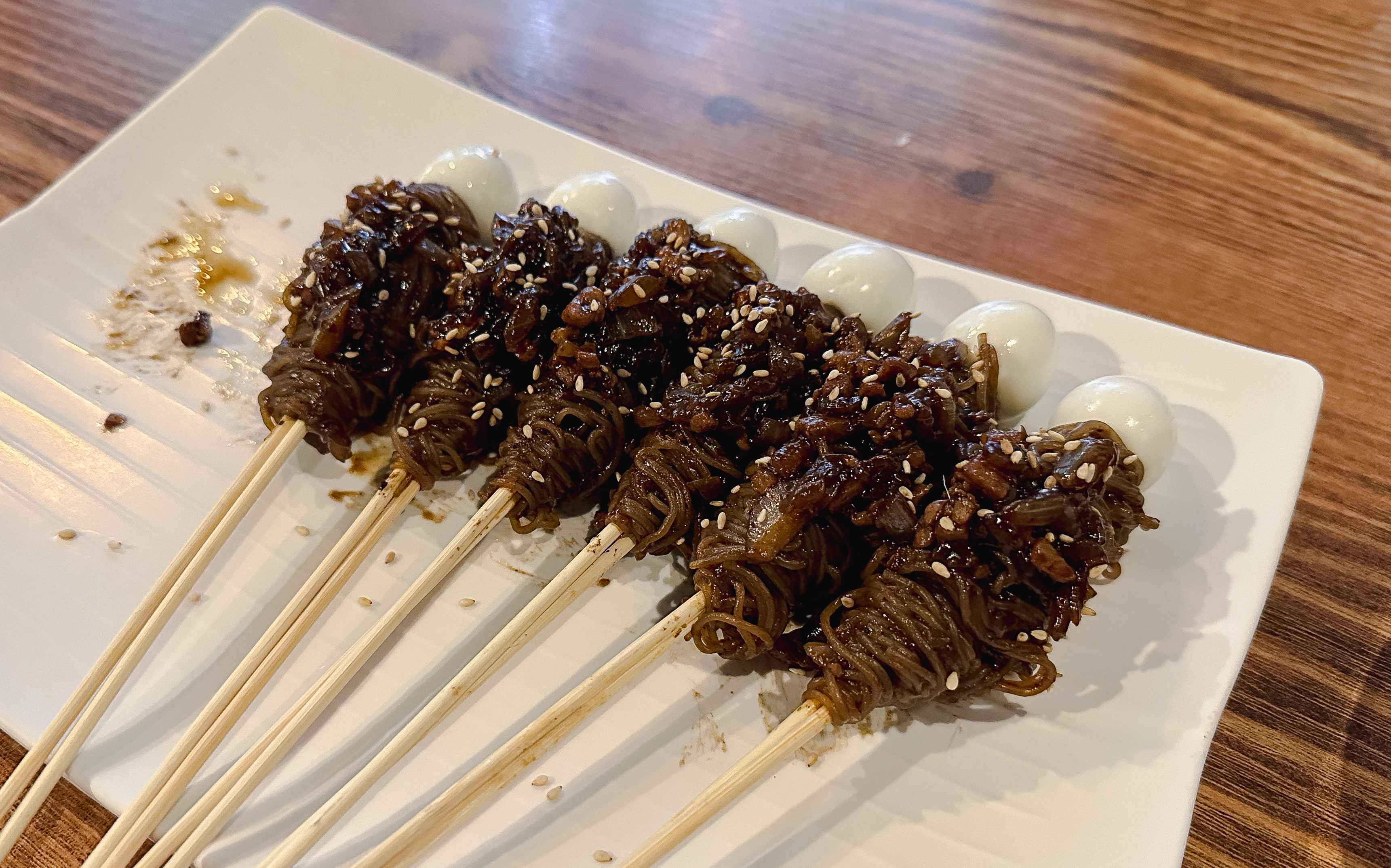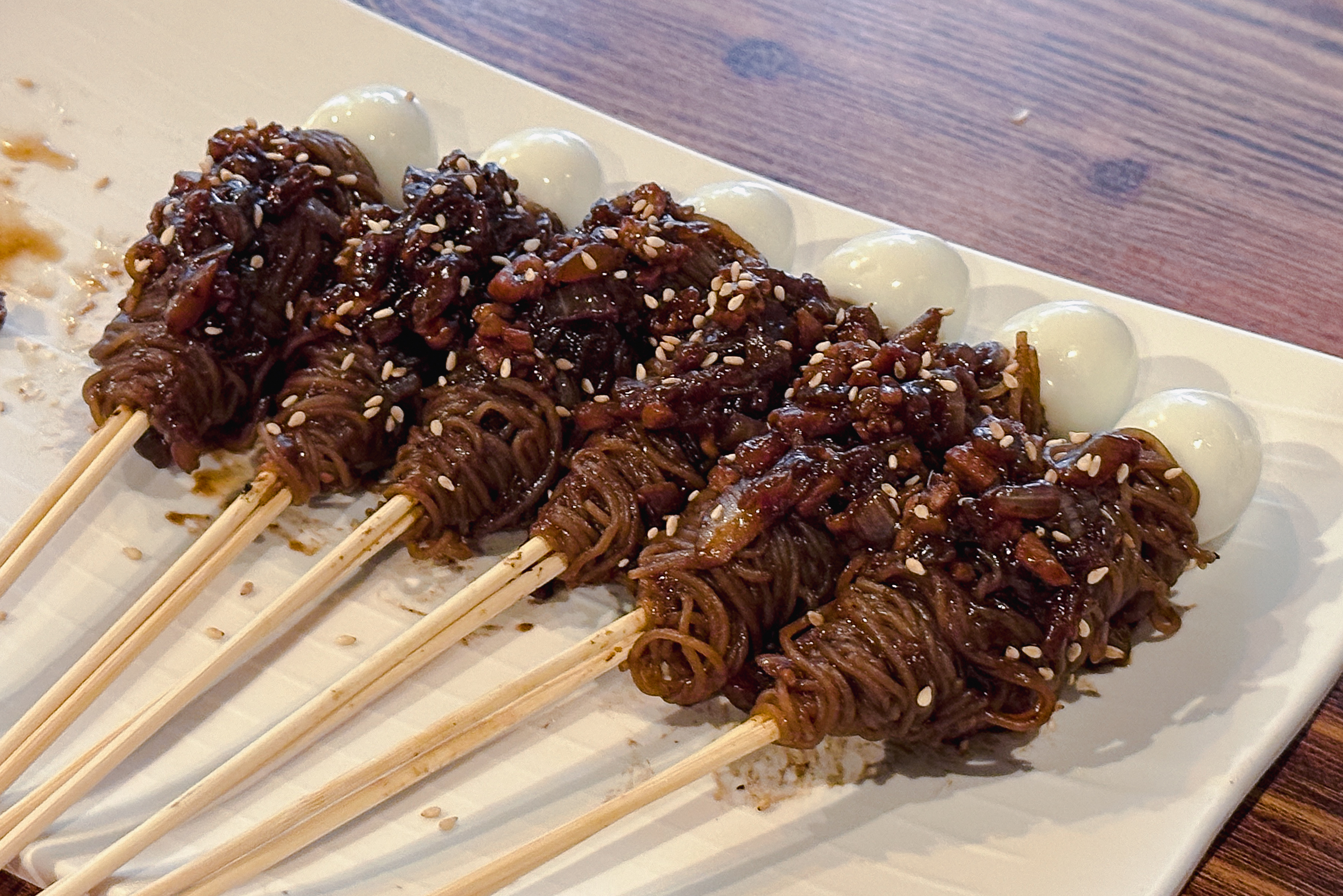 짜장냉면꼬치는 위와 같이 메추리알과 짜장냉면(?)을 꼬치에 꽂아서 만들어주셨습니다. 사이드로 양배추샐러드와 어묵이 함께 나왔습니다. 짜장냉면꼬치에 대해 자세히 살펴보시죠.