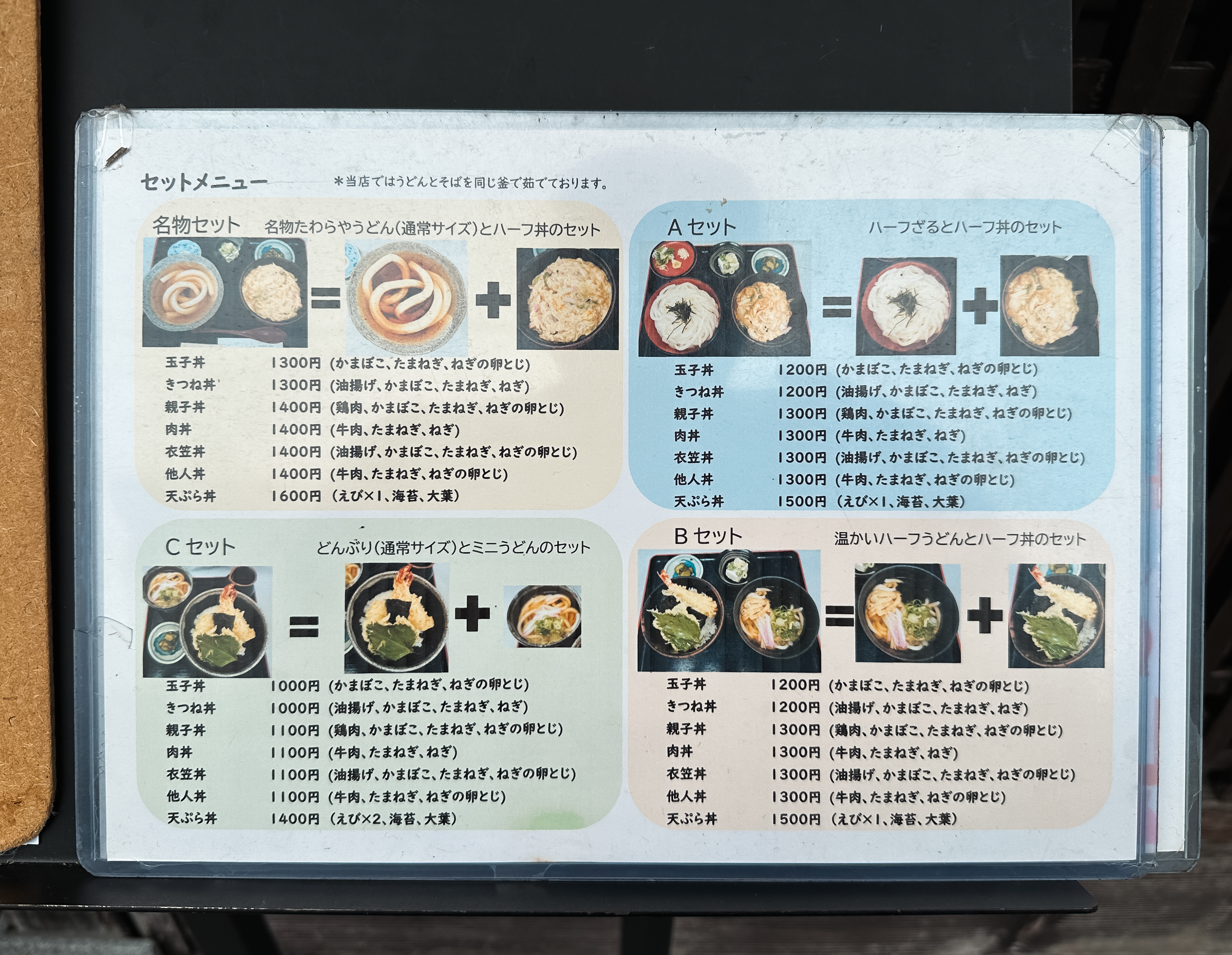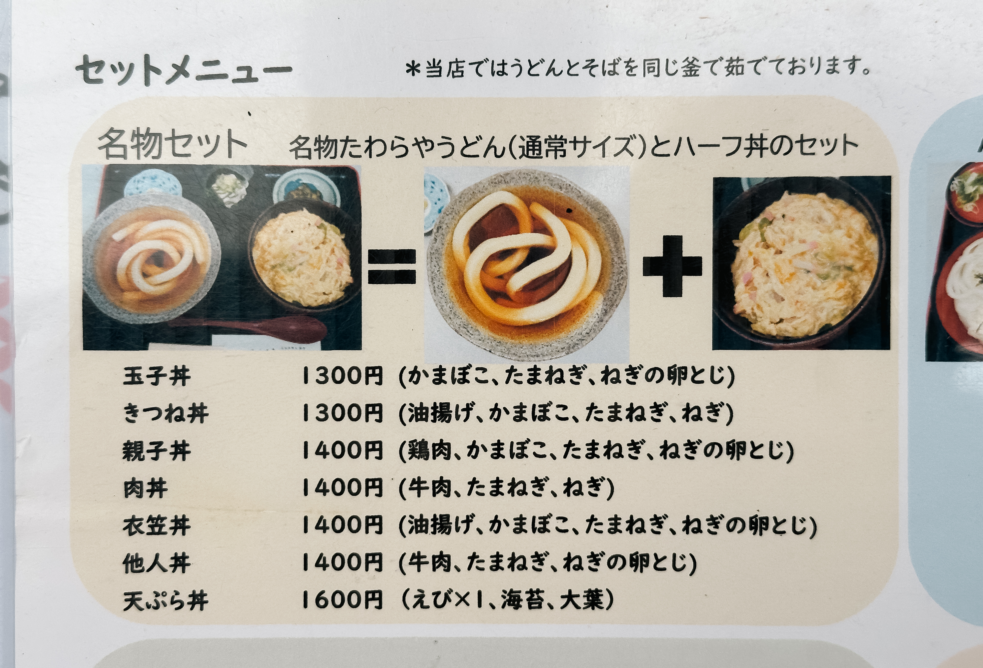 たわらや 메뉴는 우동, 소바, 덮밥, 세트, 튀김, 주먹밥 등이 있었습니다. 종류가 굉장히 다양하기 때문에 기호에 따라서 조합해 먹어도 괜찮았는데요, 저는 세트메뉴를 선택해서 먹었습니다.