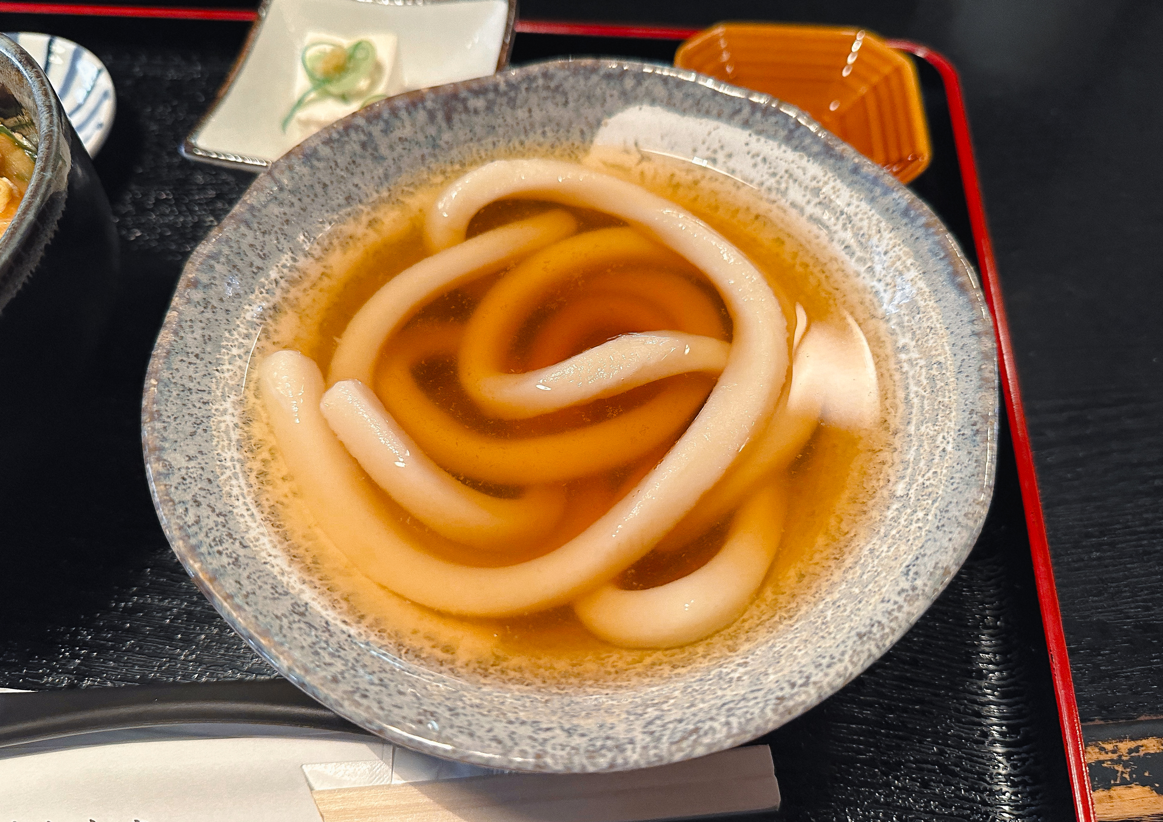 교토 타와라야(たわらや)의 세트메뉴는 위와 같이 나왔습니다. 우동과 덮밥 외에 반찬 몇 가지가 나왔는데, 가장 궁금하던 굵은 우동을 실제로 마주하니 기대감이 많이 되더라고요.
