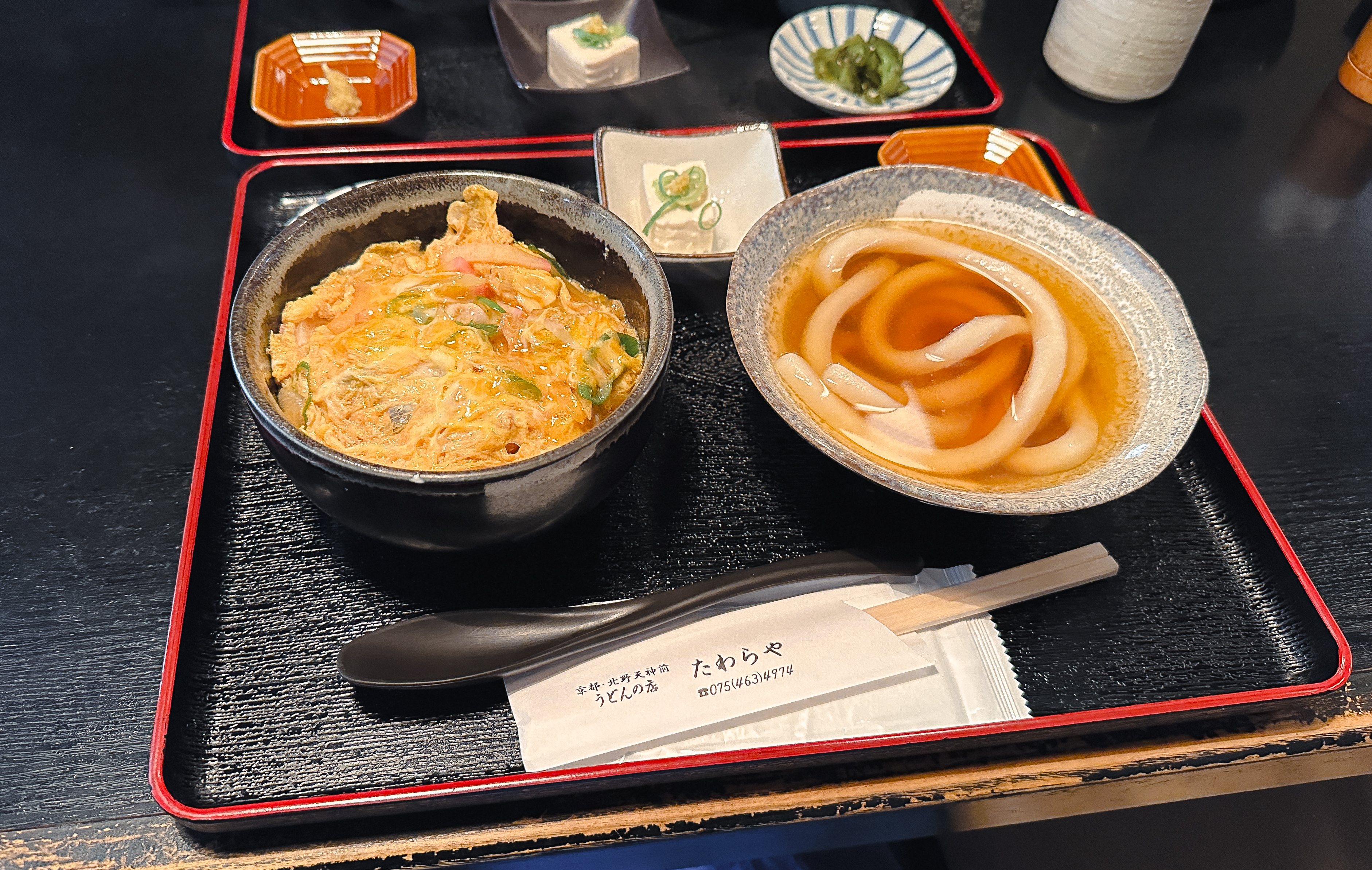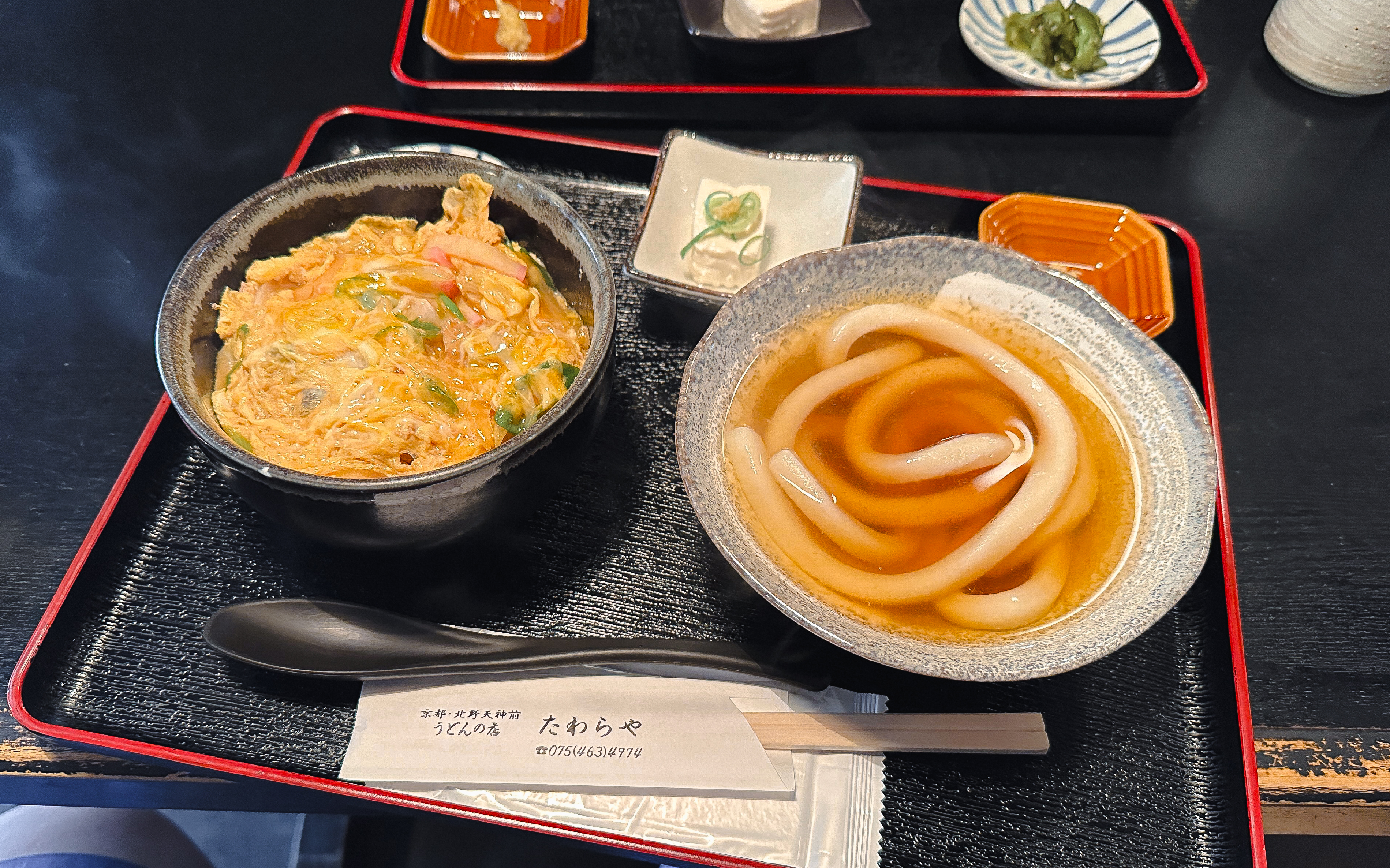 교토 타와라야(たわらや)의 세트메뉴는 위와 같이 나왔습니다. 우동과 덮밥 외에 반찬 몇 가지가 나왔는데, 가장 궁금하던 굵은 우동을 실제로 마주하니 기대감이 많이 되더라고요.