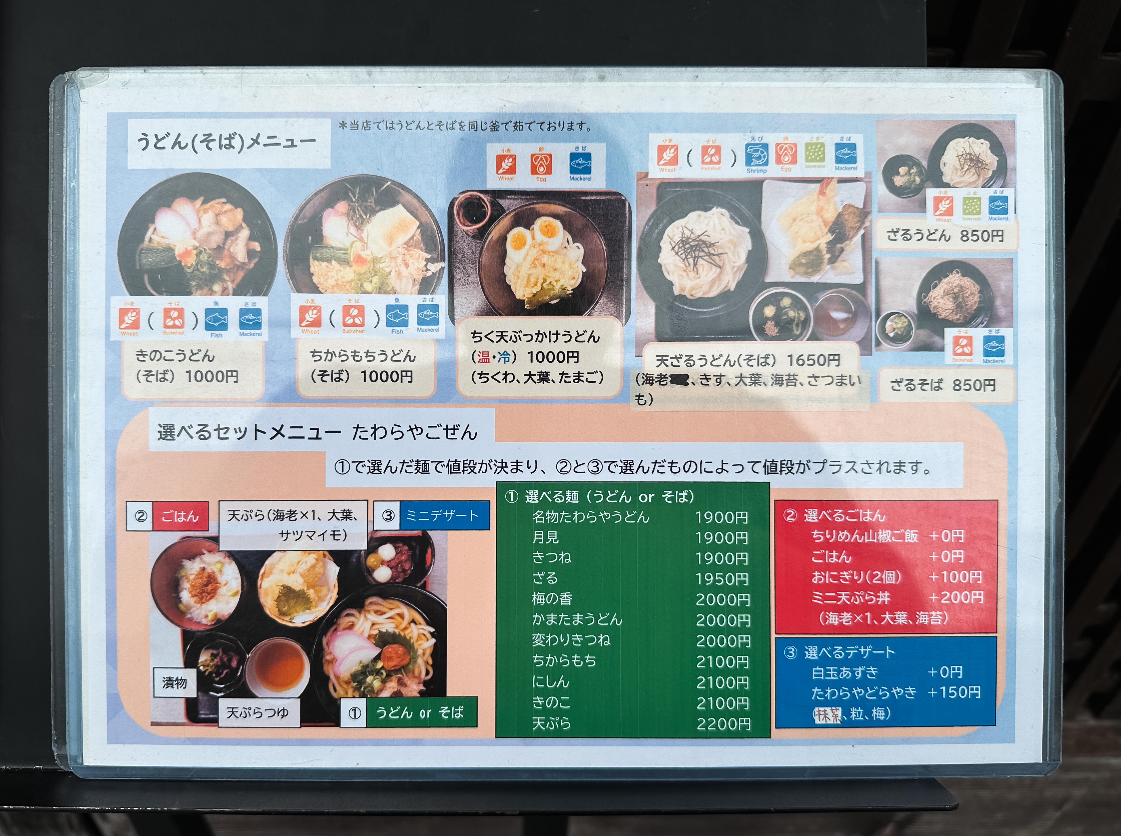 たわらや 메뉴는 우동, 소바, 덮밥, 세트, 튀김, 주먹밥 등이 있었습니다. 종류가 굉장히 다양하기 때문에 기호에 따라서 조합해 먹어도 괜찮았는데요, 저는 세트메뉴를 선택해서 먹었습니다.