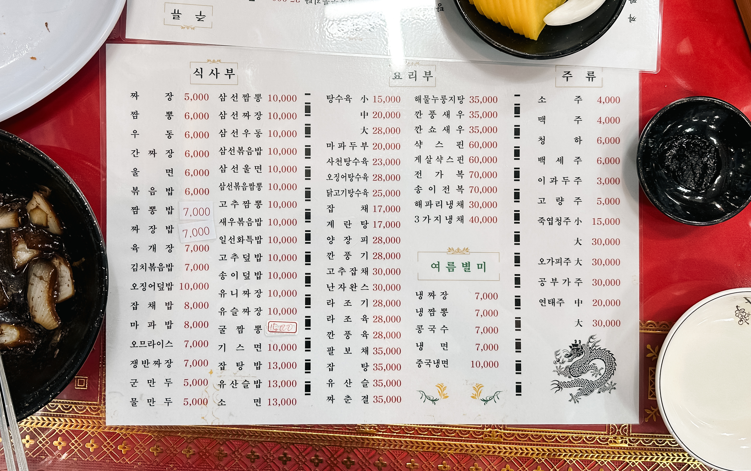 신길동 일선화 메뉴는 식사부, 요리부, 여름별미 등 대략 6~70 가지 메뉴가 있었습니다. 그중에 특이한 메뉴는 닭고기탕수육, 오징어탕수육, 냉짜장, 냉짬뽕이 있었습니다. 저희는 기본 짜장면과 냉짜장, 군만두를 주문했습니다.