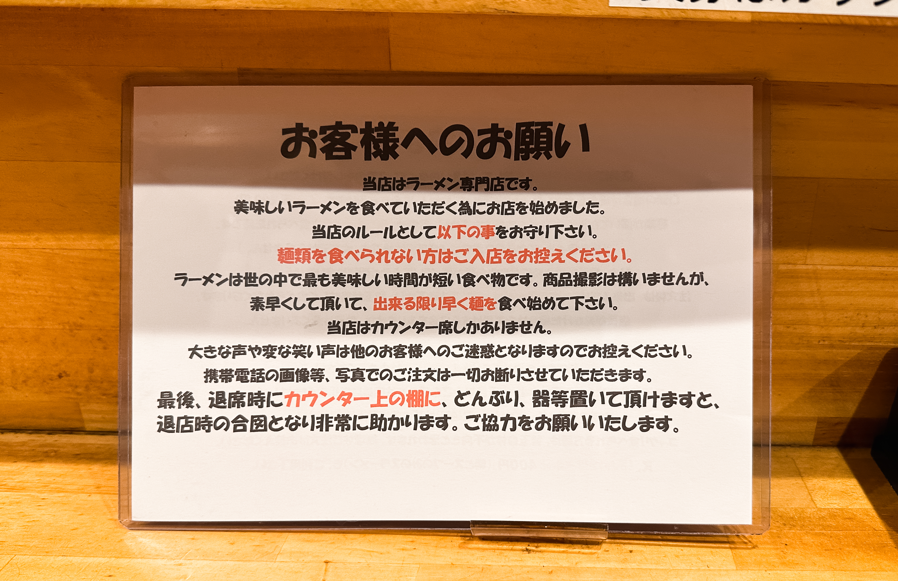 메뉴를 소개하기 전 이 가게에 대해 조금 더 설명하자면, 일본 현지인 분들도 '불쾌하다'라고 느끼시는 분들이 많던데, 곳곳에 붙어있는 안내문 으로 불편함을 많이 느끼고 있었습니다. 사실 제가 느끼기에도 가게의 메뉴에 대한 자신감이 너무 높은 나머지 뭔가 손님들한테 훈계하듯 안내를 한다는 점입니다.