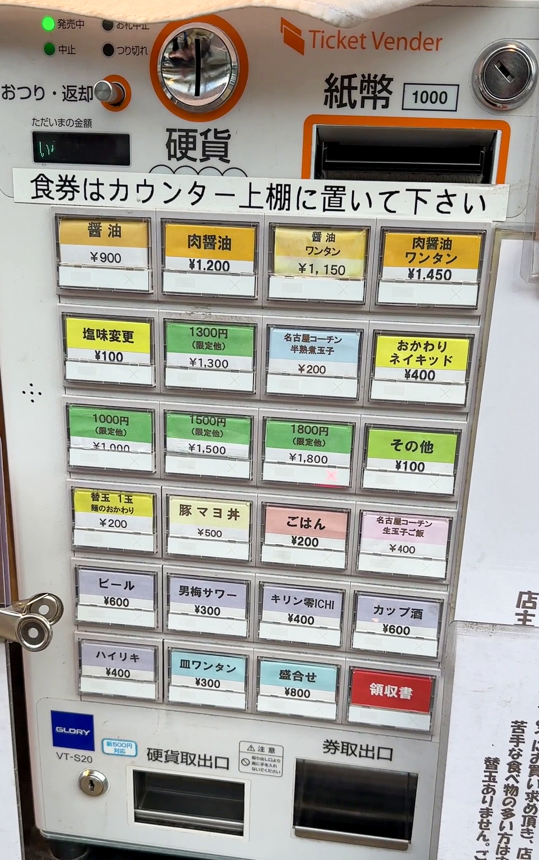 '大阪 麺哲' 의 메뉴는 여느 일본의 라멘집처럼 메뉴 자판기를 통해 주문할 수 있었습니다. 제가 주문하려는 '山' 메뉴는 자판기에 보이지 않아서, 직원분의 안내에 따라 주문했는데 자판기에서 山의 가격에 맞게 1,400円을 결제하면 되었습니다. 처음에 1,300+100円 으로 결제를 시범적으로 보여주셨는데, 그냥 1,000+400円으로 결제해서 보여드려도 메뉴를 만들어주셨습니다.