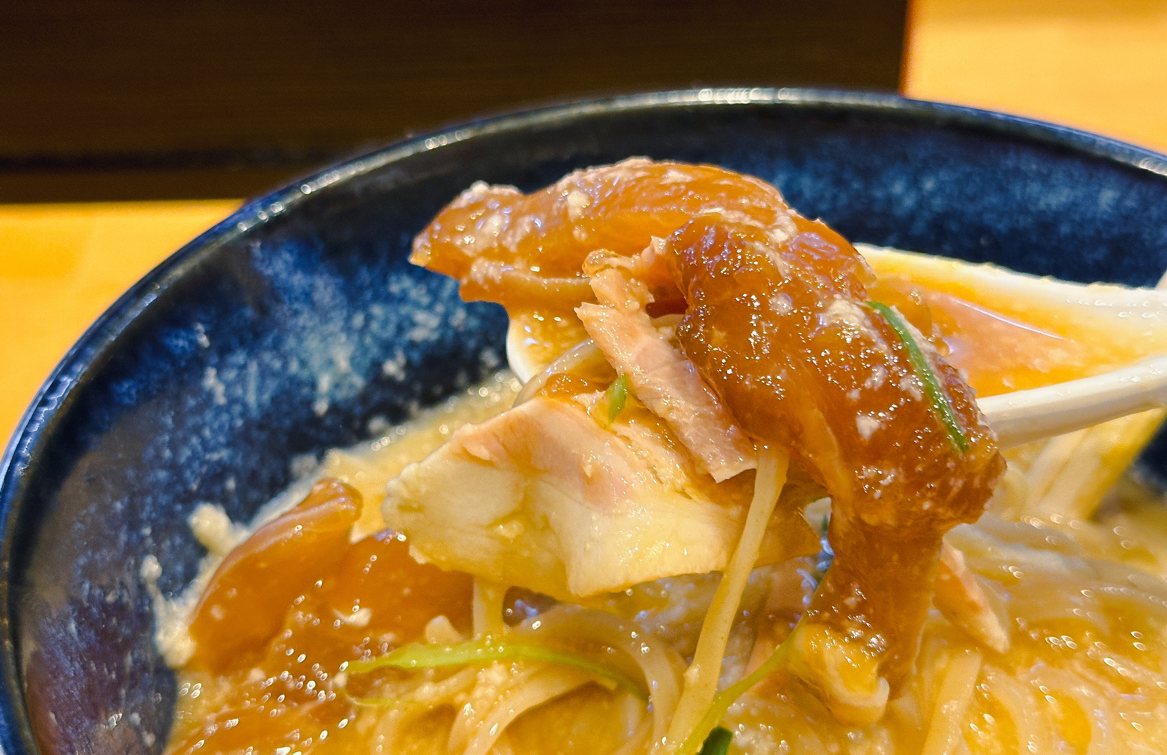 특히 얇은 차슈와 쫀득한 식감의 '간장에 절인 닭고기'가 있어서 식감이 특이했습니다. (추측이지만) 이 닭고기는 생닭을 절여서 만들었는지 족발의 껍데기나 젤리 같은 식감을 갖고 있었습니다. 일부 리뷰에서도 '생닭고기'라고 하는 것을 보면 아마 예상이 맞지 않을까 합니다. 전체적으로 시원하게 먹기 좋은 메뉴였지만, 미끌미끌 거리며 끈적이는 식감을 가진 간마나 낫또를 좋아하는 일본인과는 입맛이 달라서 그런지 썩 호감 가는 메뉴는 아니었습니다.