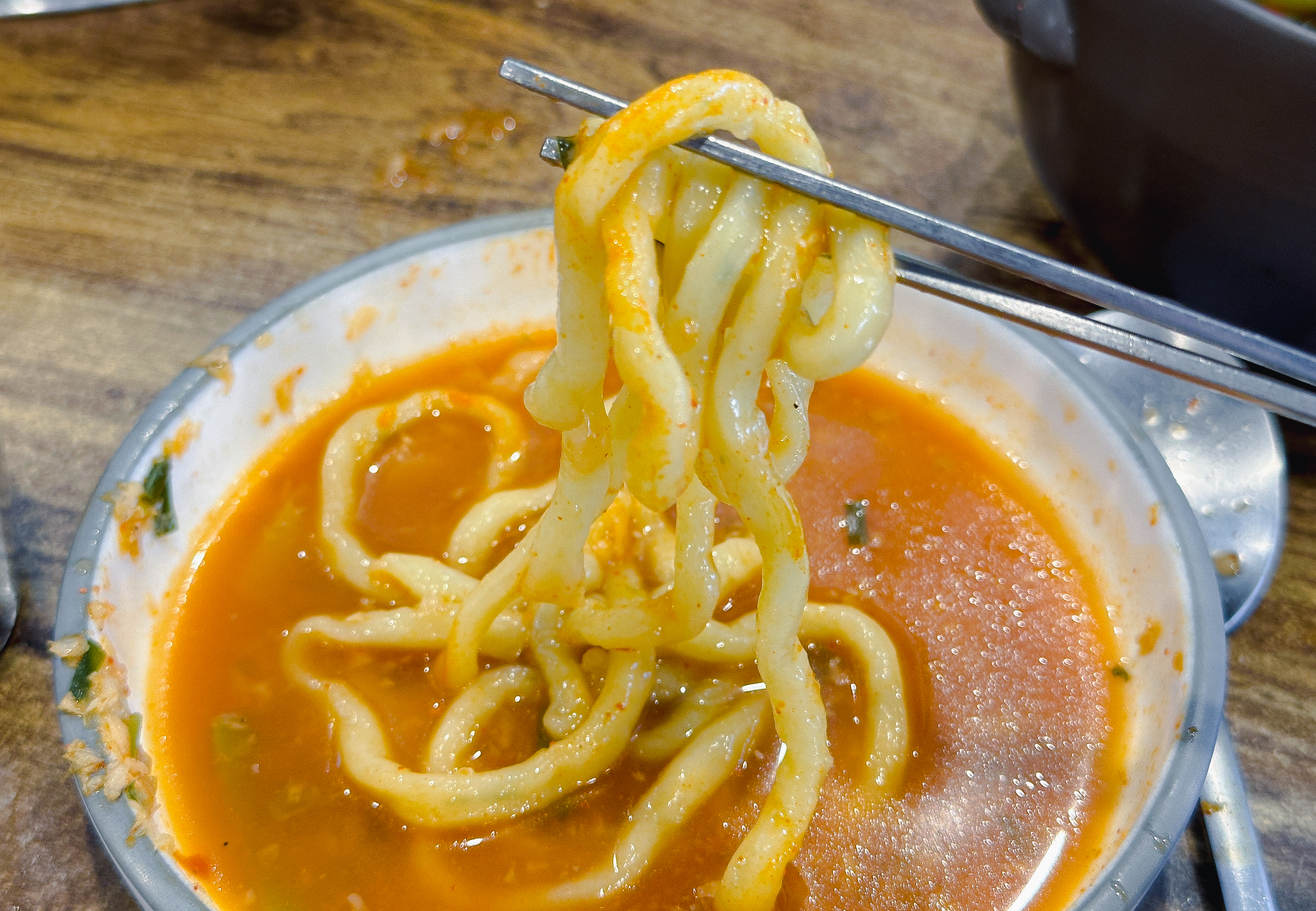 국물을 어느 정도 먹은 뒤 가게 직원에게 말하면 칼국수도 함께 내어주고 있었습니다. 칼국수는 적당한 두께감이 있었고 아마 가게 이름에서 처럼 '홍두깨를 이용해 면을 반죽'하지 않았을까 생각합니다. 전체적으로 깔끔한 매운맛이었는데, 만두가 터지면서 안의 내용물이었던 마늘 등이 국물에 풀어져 나중에는 약간 텁텁한 맛이 있었습니다. 전반적으로 무난한 편이었는데, 이곳에 찾아가서 까지 먹으라고는 말하기 어렵고 태안에서 일하시거나, 동네에 계신 분이라면 한 번 드셔보실 수 있을 정도(?)