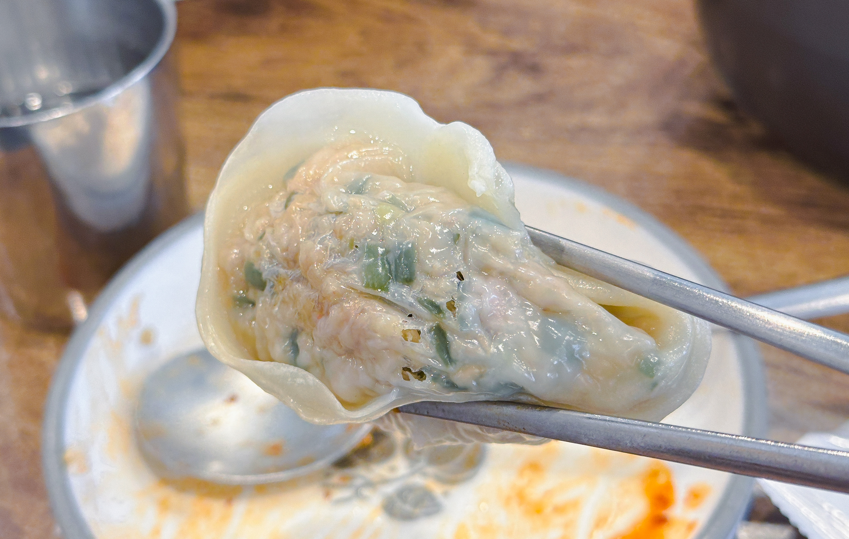동문리 홍두깨칼국수의 얼큰한 만두전골이 나왔습니다. 빨간 국물에서부터 얼큰한 느낌이 났고, 만두와 함께 굴, 바지락, 미더덕 등의 해산물이 들어있었습니다. 따로 주문한 찐만두와 만두 전골속 만두가 같은 만두가 제공되고 있었는데, 만두는 전체적으로 마늘이 많이 들어가 있어서 향이 많이 강한 편이었습니다.