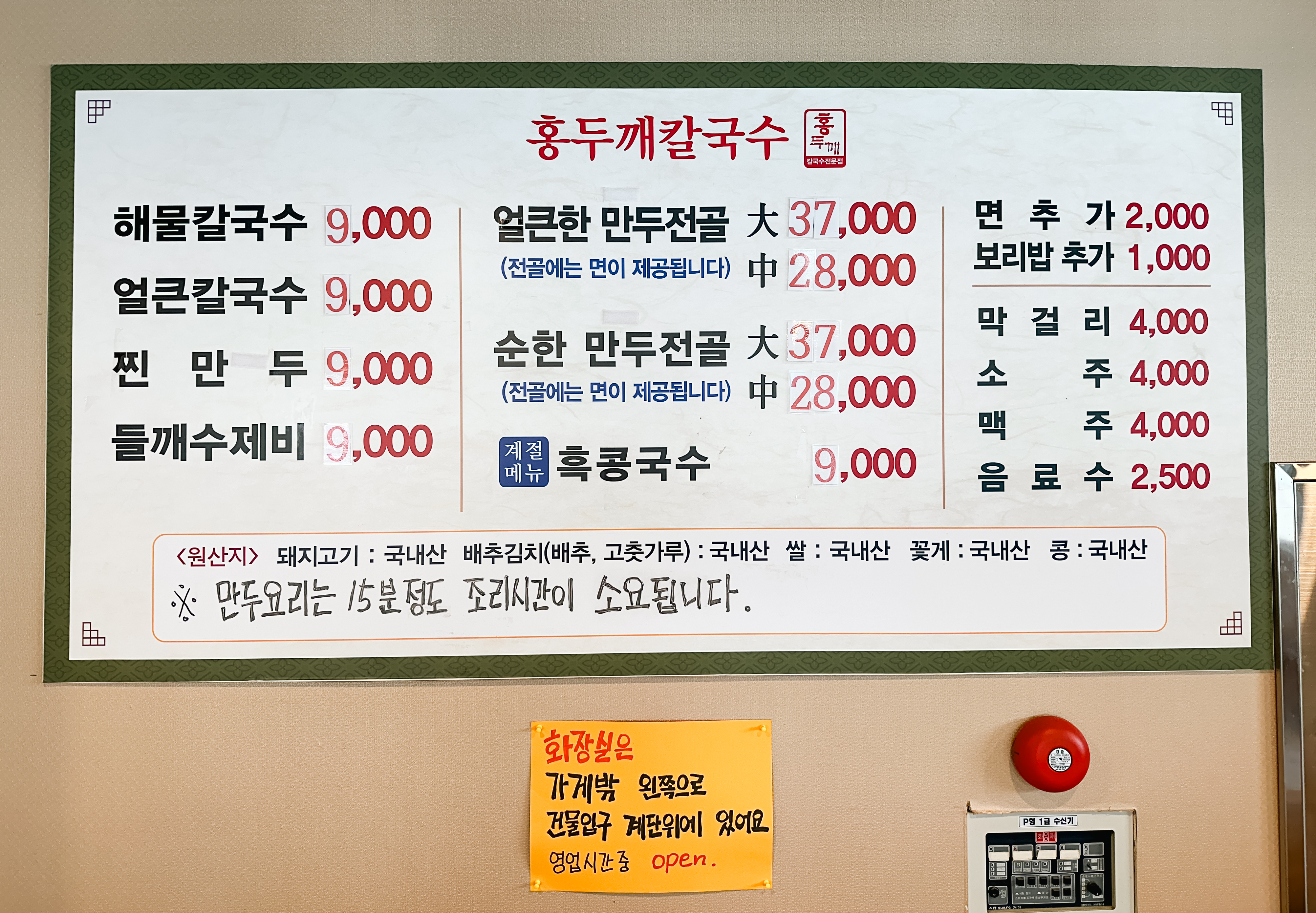 홍두깨칼국수의 메뉴는 위와 같았습니다. 홍두깨칼국수, 얼큰칼국수, 찐만두, 들깨수제비, 얼큰한만두전골, 순한만두전골, 흑콩국수 등이 있었고, 저희는 '얼큰한 만두전골'과 '찐만두'를 주문했습니다.