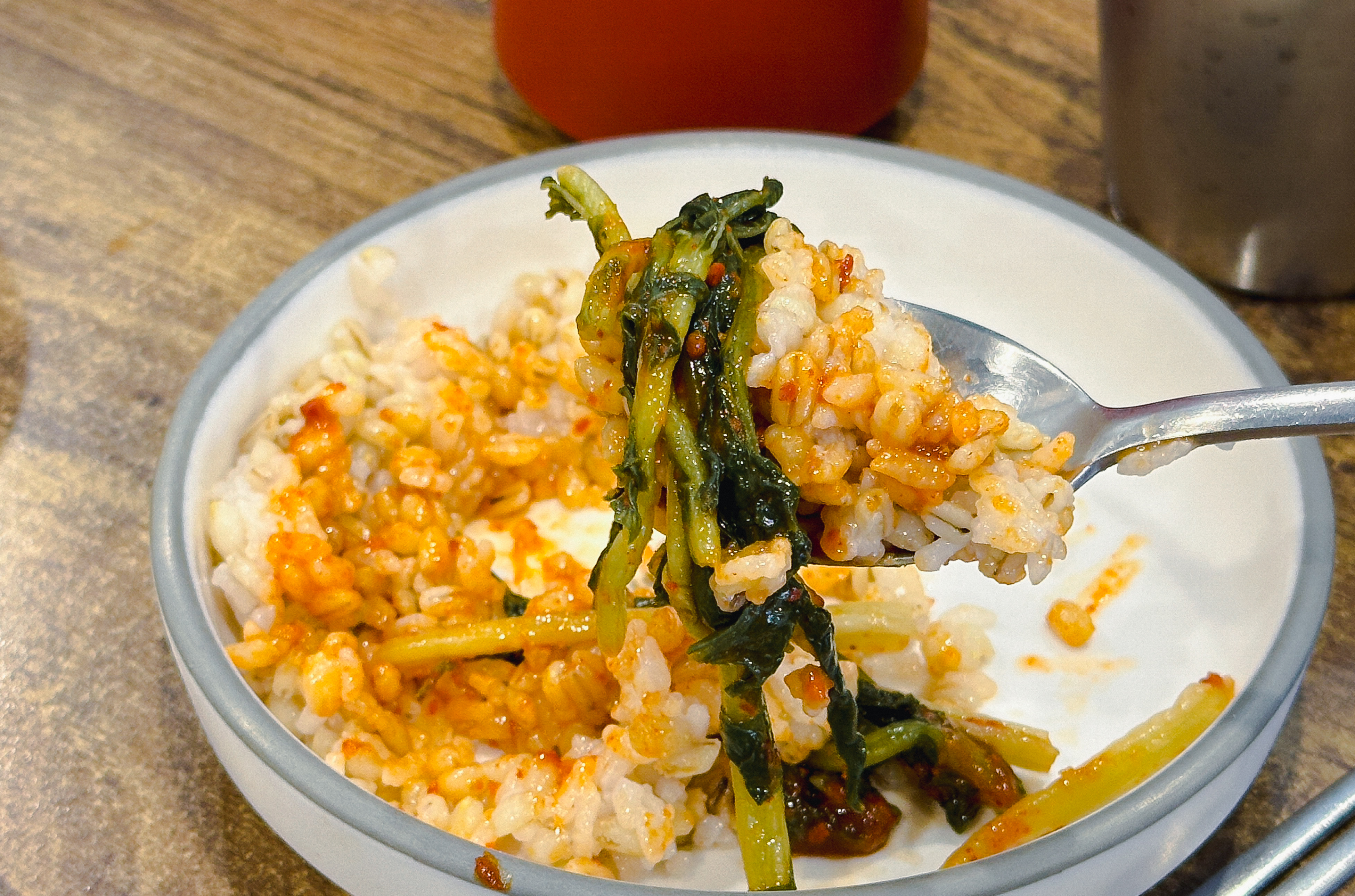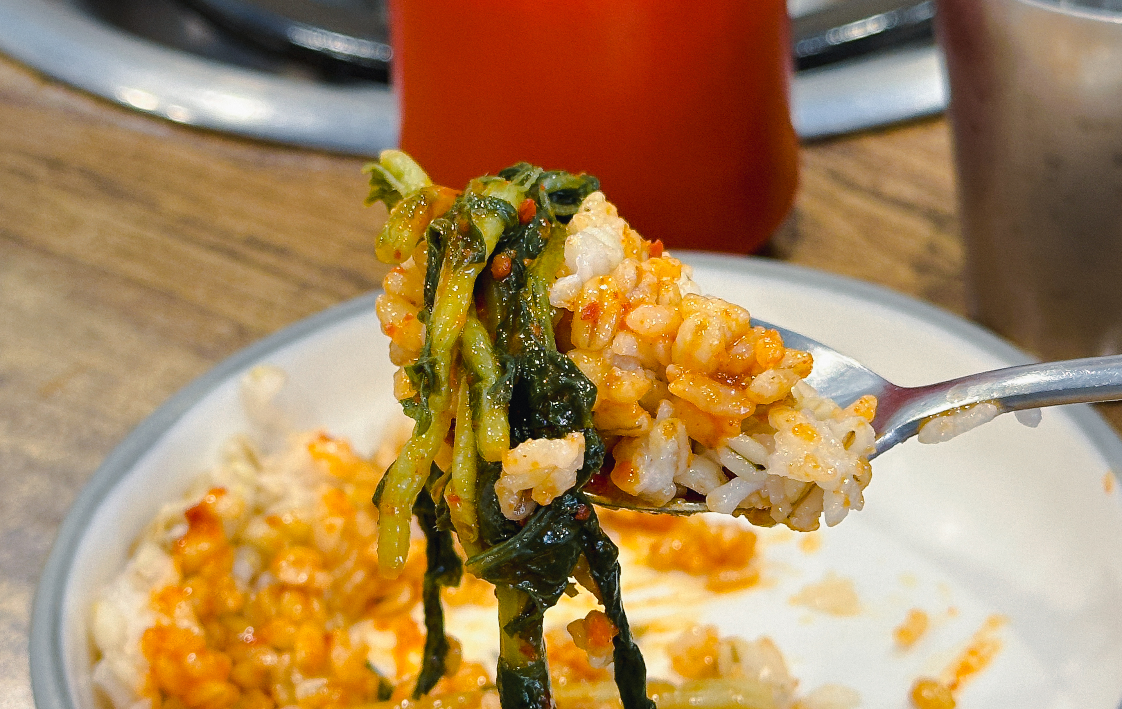 만두전골을 소개해드리기 전에, 보리밥과 함께 김치가 먼저 나왔습니다. 보리밥은 열무김치와 콩나물 그리고 고추장을 섞어서 비벼먹도록 하고 있었고, 맛은 따로 설명드리지 않아도 모두가 아는 그 맛(?)이었습니다.
