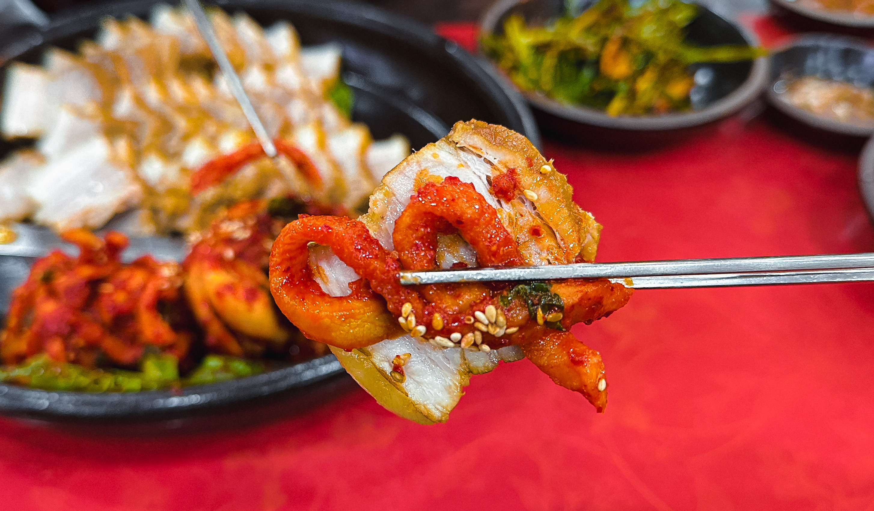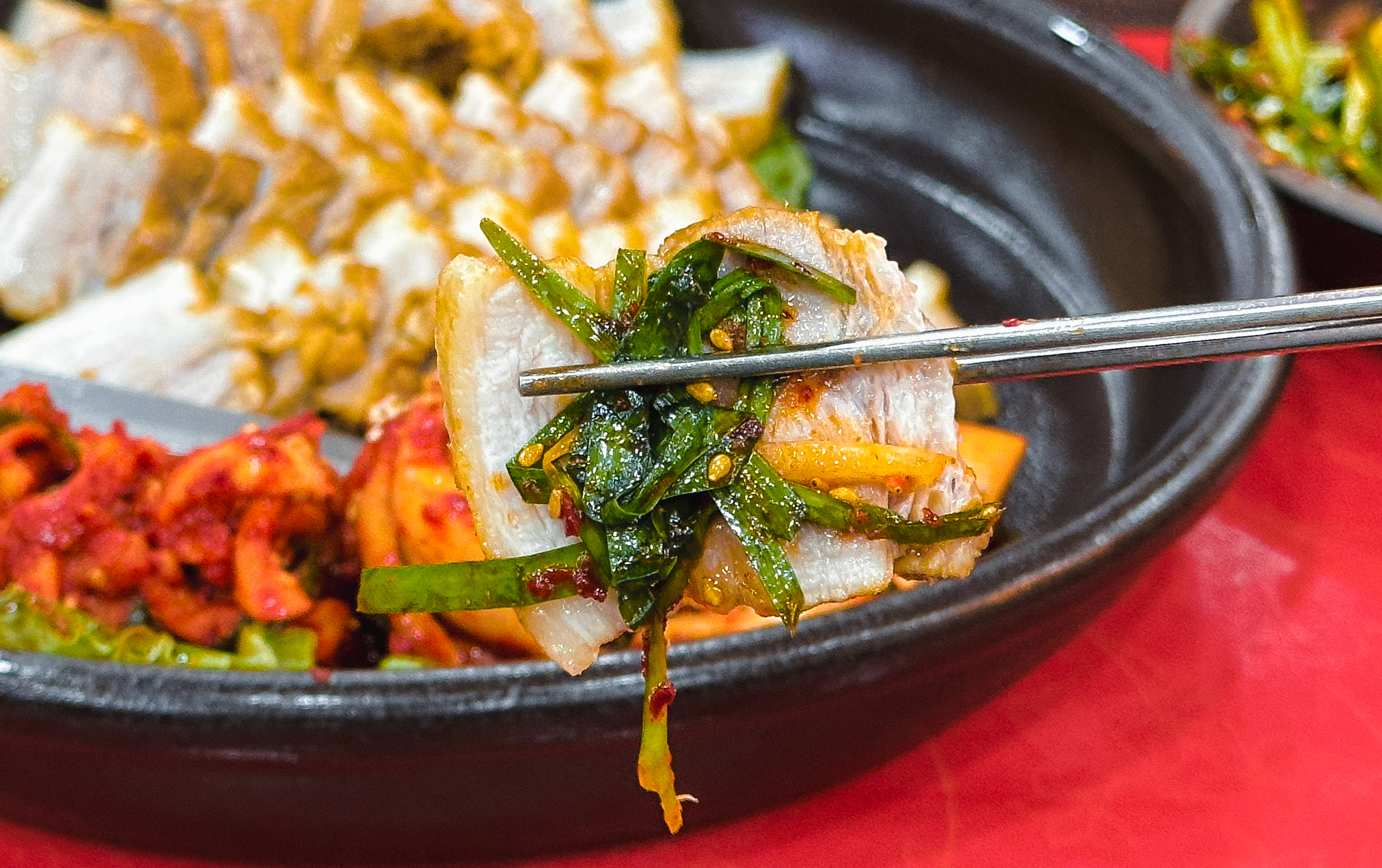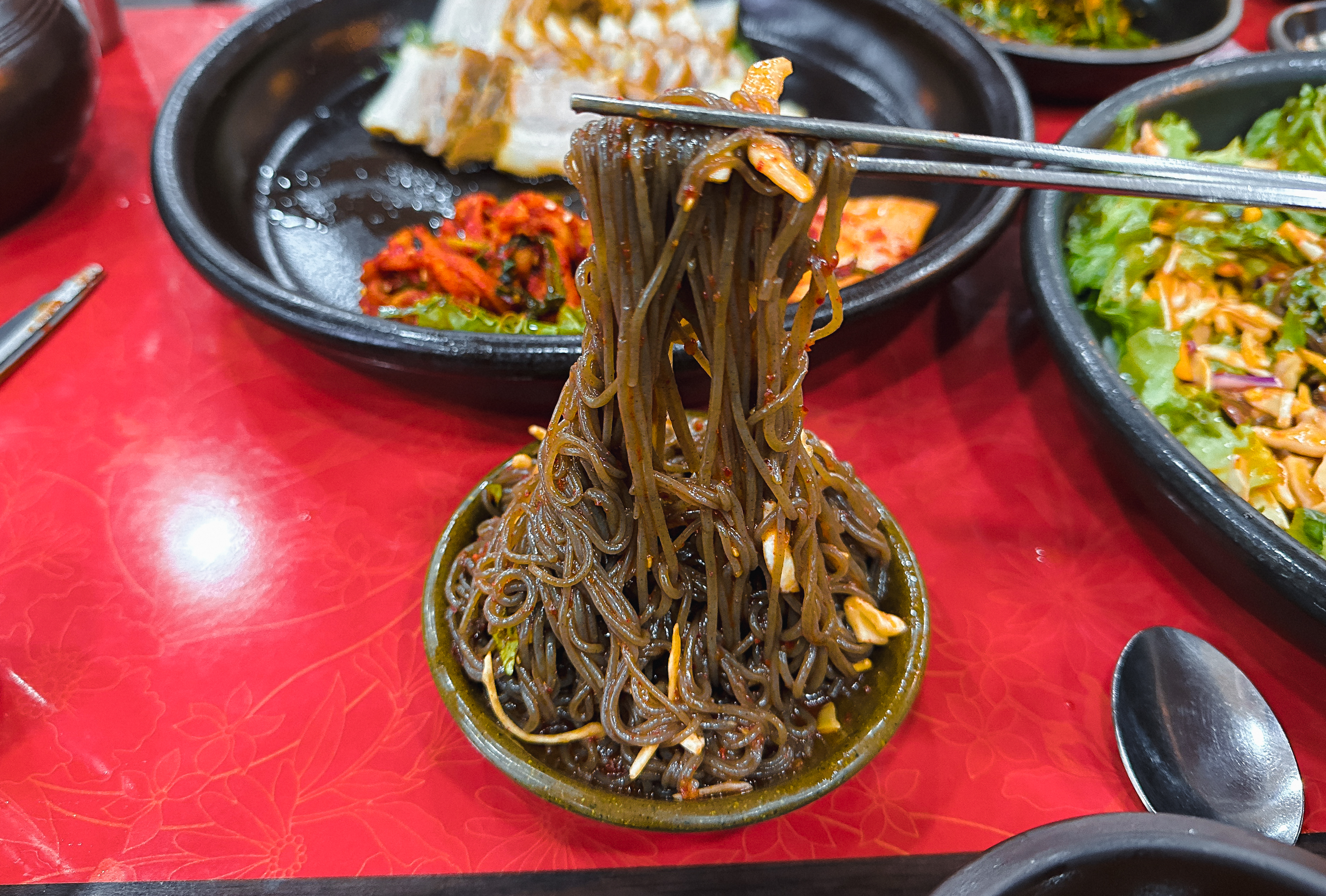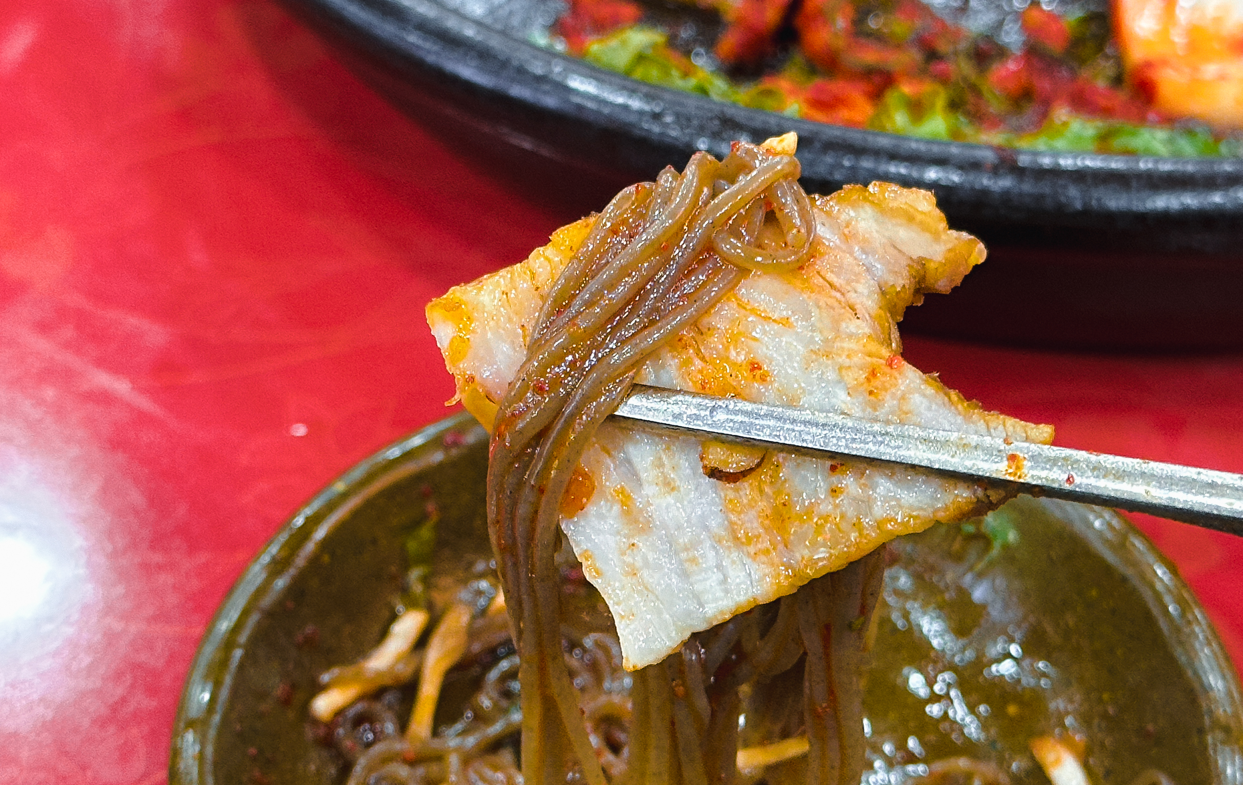 보쌈은 기호에 맞게 무김치와 먹거나 부추무침, 쌈무 등과 곁들여 먹으면 좋았고, 쟁반국수는 각종 채소와 함께 있어서 맛이 좋았습니다. 그래서 막국수와도 한 점 먹었죠.