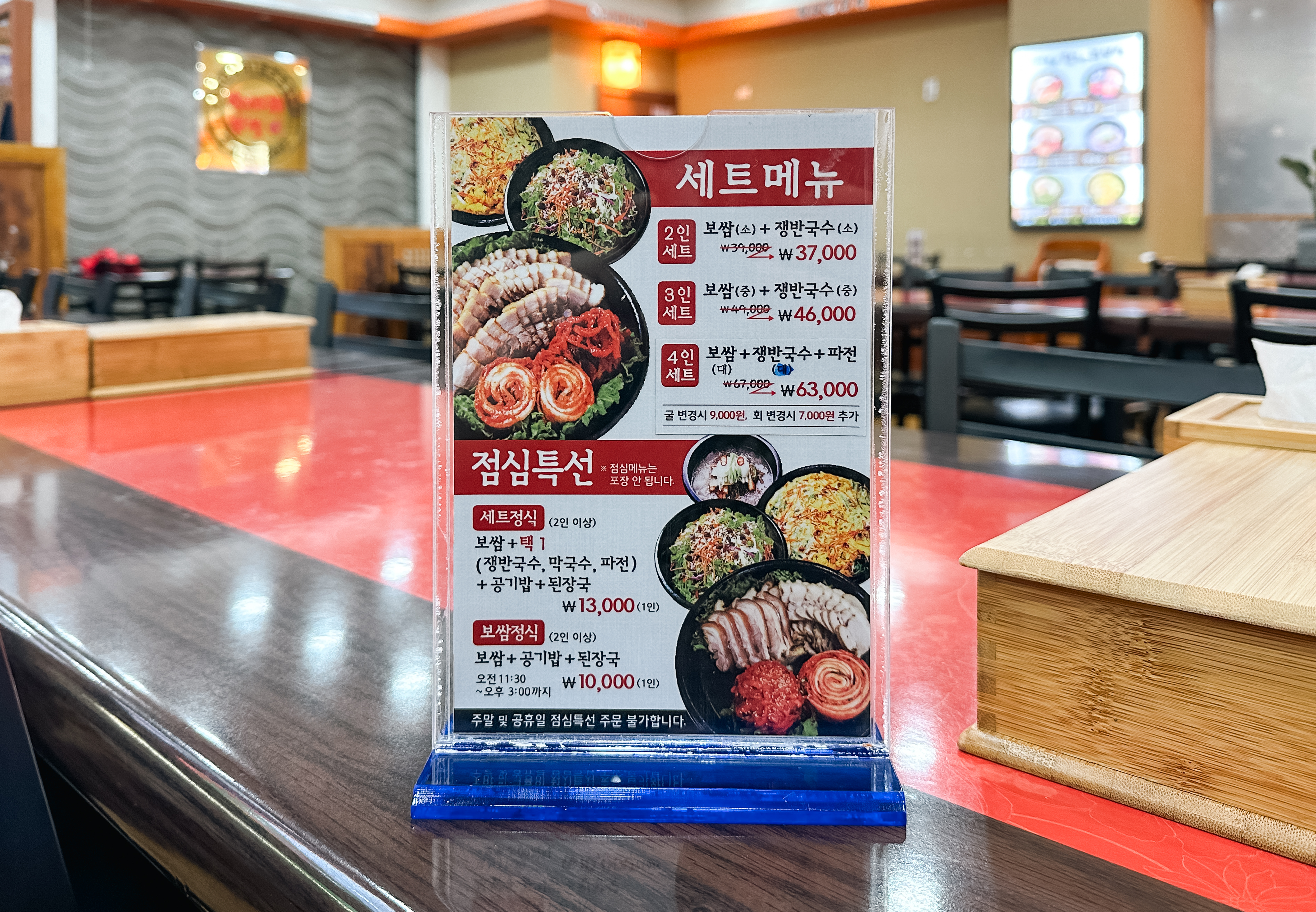 거여동 항아리보쌈의 메뉴는 위와 같습니다. 보쌈, 굴보쌈, 회보쌈, 막국수, 쟁반국수, 파전, 세트메뉴, 점심특선이 있었습니다. 저희는 보쌈과 쟁반국수가 세트로 구성된 메뉴를 주문했습니다.