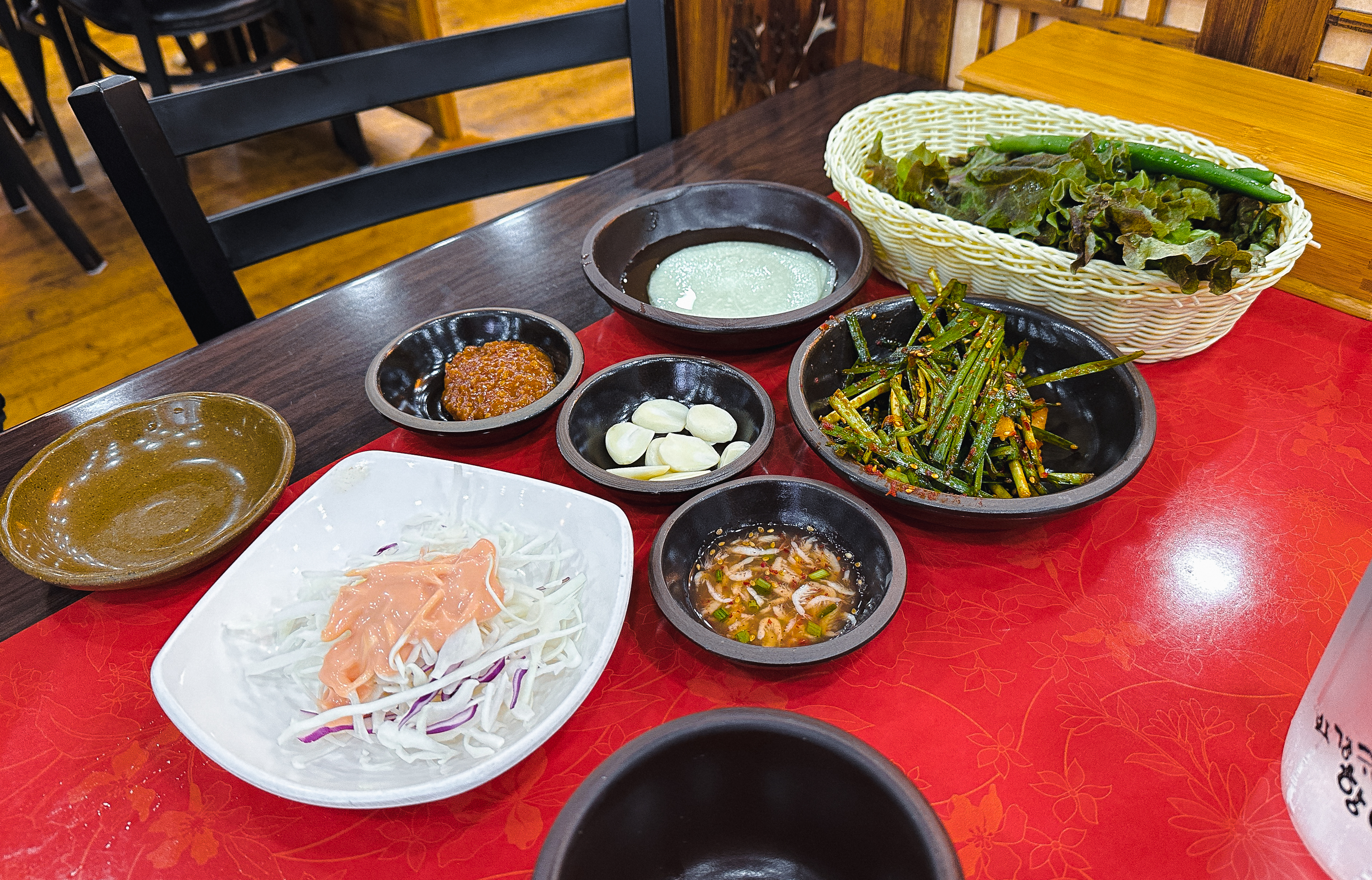 항아리보쌈의 세트메뉴가 나왔습니다. 우선, 보쌈과 함께 된장국, 쌈무, 마늘, 쌈채소, 부추무침, 양배추샐러드 등이 나왔습니다. 이제 보쌈과 막국수에 대해 자세히 알아보시죠.
