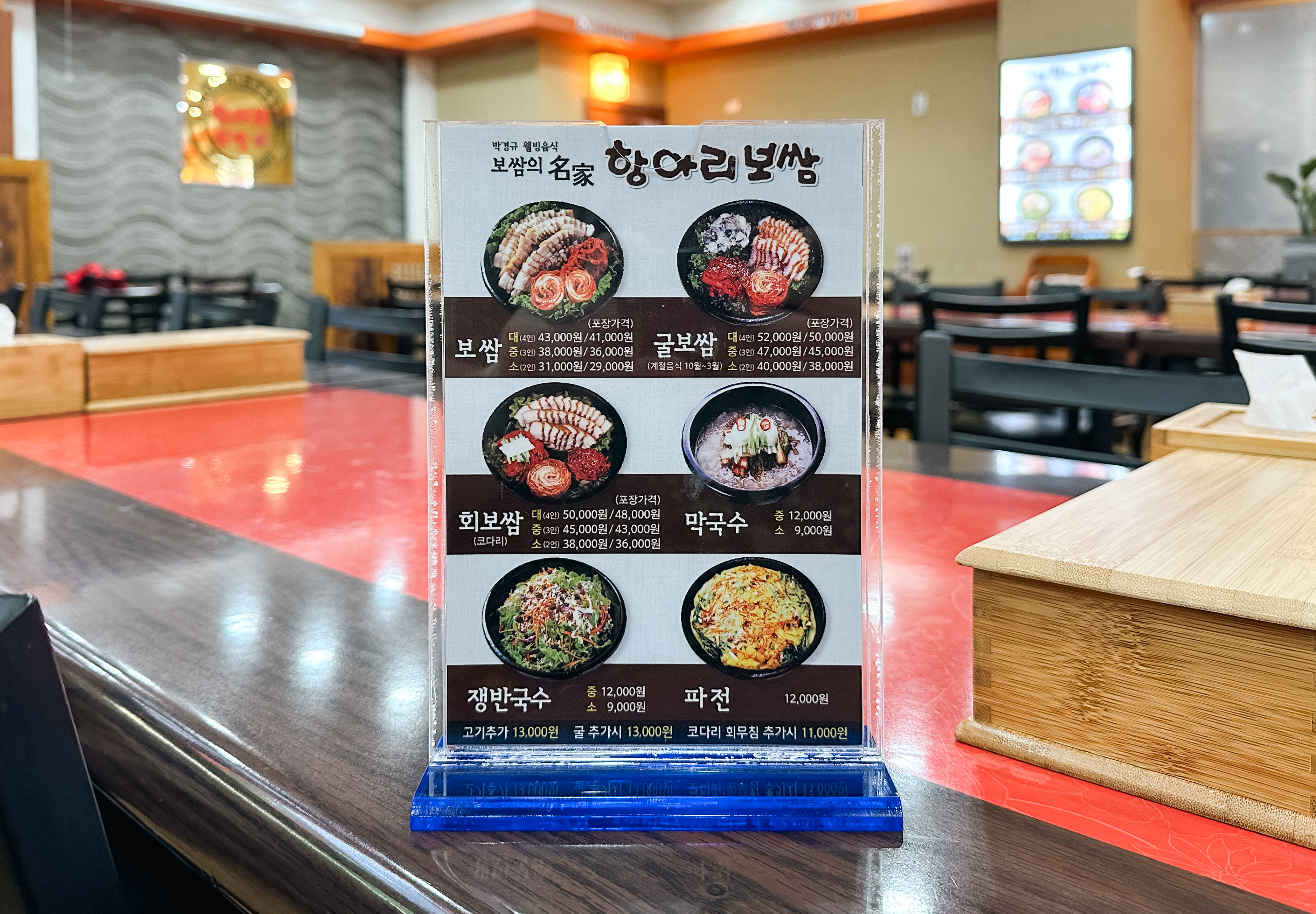 거여동 항아리보쌈의 메뉴는 위와 같습니다. 보쌈, 굴보쌈, 회보쌈, 막국수, 쟁반국수, 파전, 세트메뉴, 점심특선이 있었습니다. 저희는 보쌈과 쟁반국수가 세트로 구성된 메뉴를 주문했습니다.