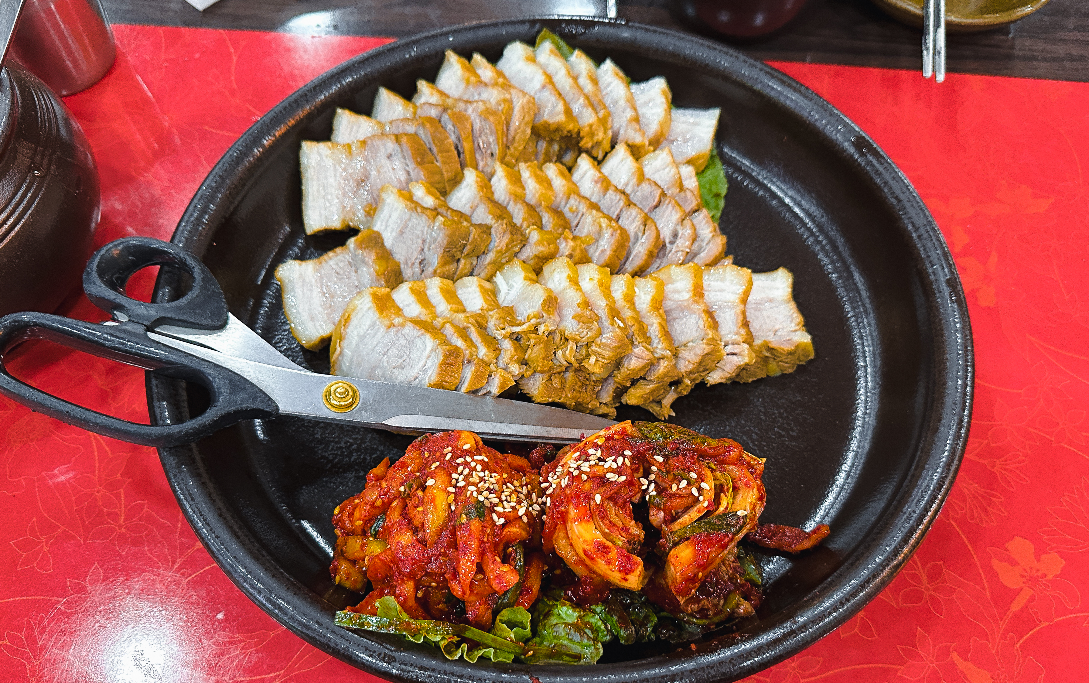 보쌈은 기호에 맞게 무김치와 먹거나 부추무침, 쌈무 등과 곁들여 먹으면 좋았고, 쟁반국수는 각종 채소와 함께 있어서 맛이 좋았습니다. 그래서 막국수와도 한 점 먹었죠.