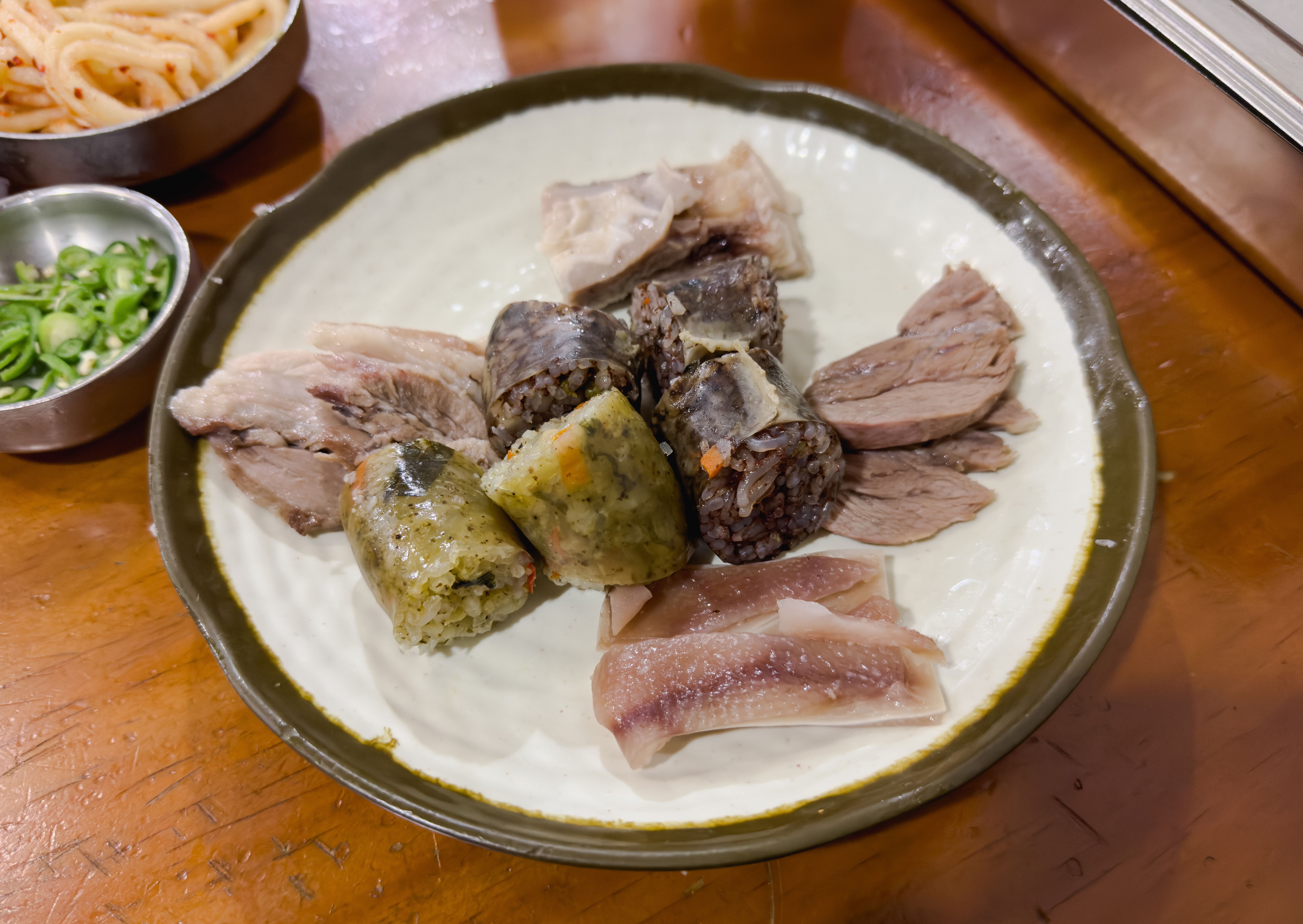 수육은 부위별로 조금씩 차이가 있었고, 기름진 부위에서는 꼬들한 식감과 다른 부위에서는 부드러운 식감이 따로따로 느껴졌습니다. 순대도 종류별로 있었습니다. 순댓국과 같이 곁들이는 메뉴여서 그런지 처음에 볼 때는 양이 좀 적어 보여도 먹다 보면 생각보다 배가 많이 부르더라고요.