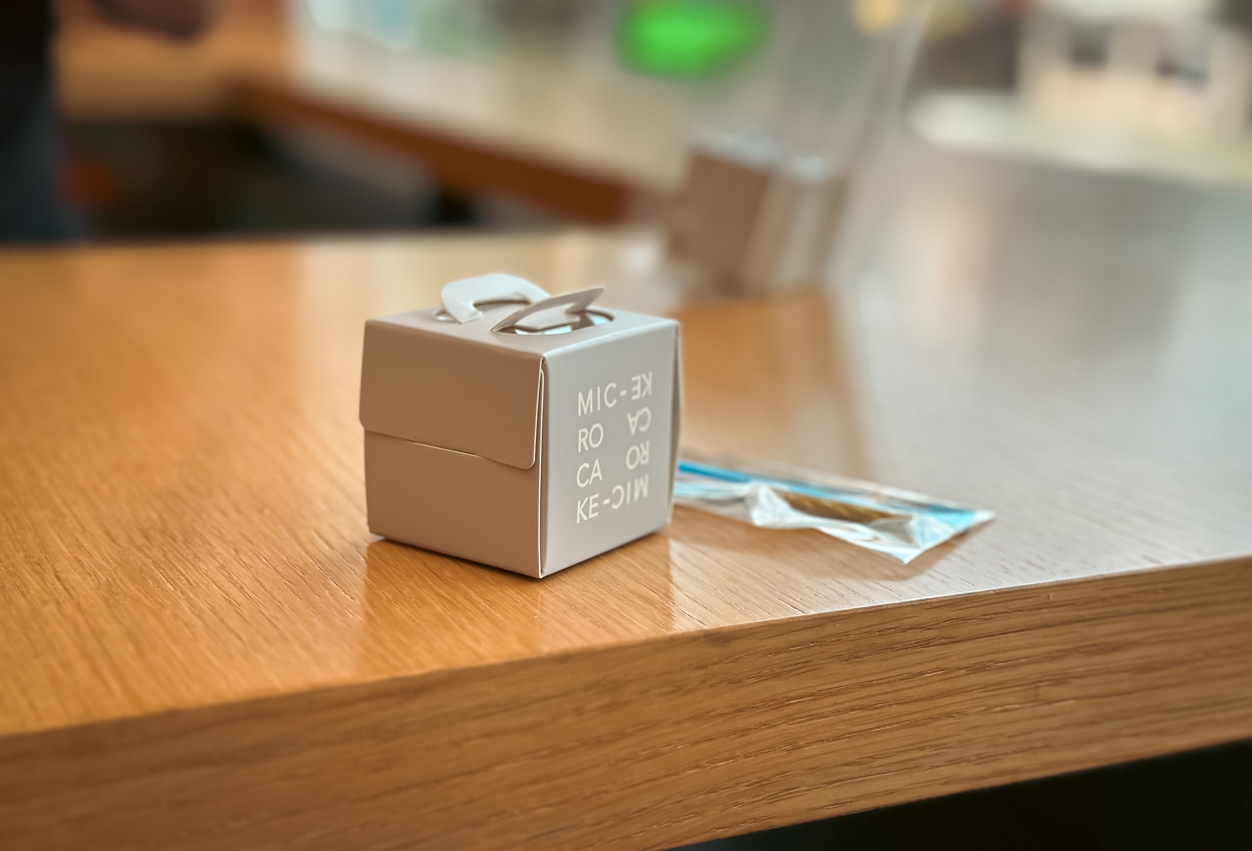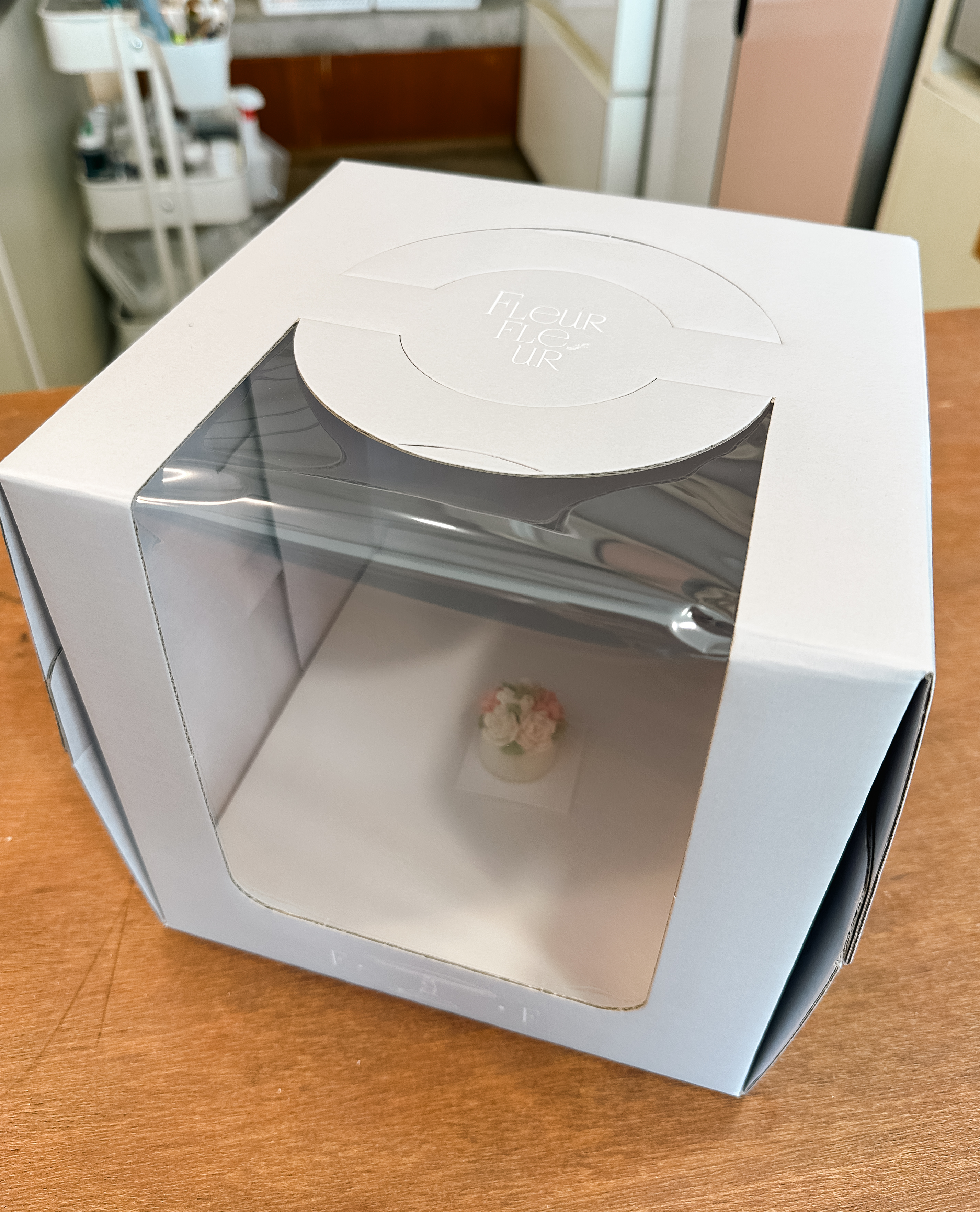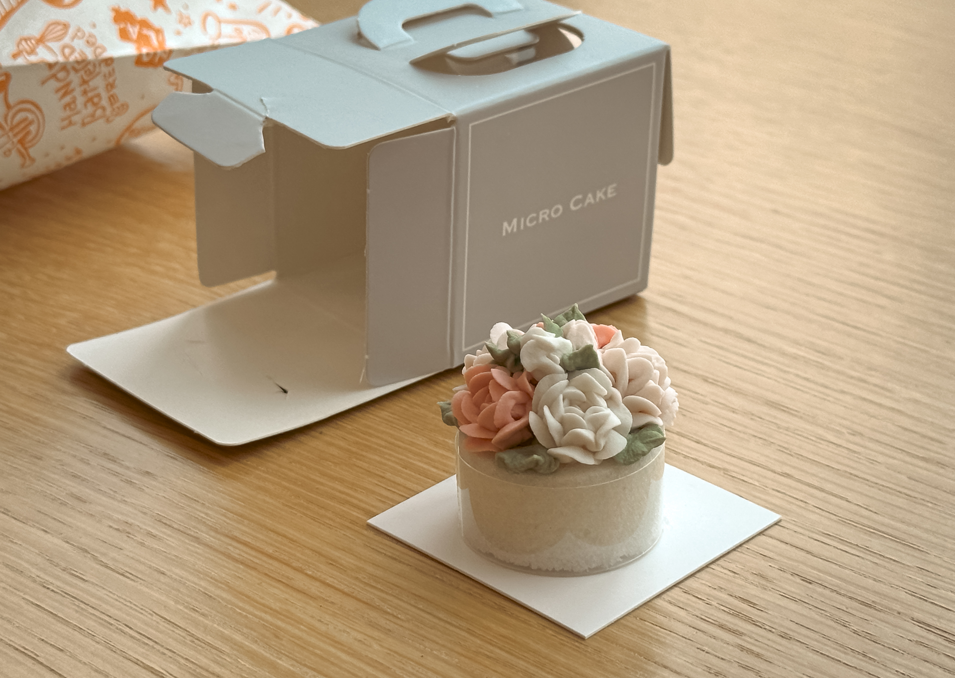 마이크로 케이크의 모습입니다. 위의 사진은 일반 크기의 케이크 상자에 담은 마이크로케이크의 모습이고, 아래 사진은 전용 케이크 상자와 함께 찍은 케이크의 모습입니다. 작은 크기에 오밀조밀 모여있는 디테일이 정말 좋더라고요.
