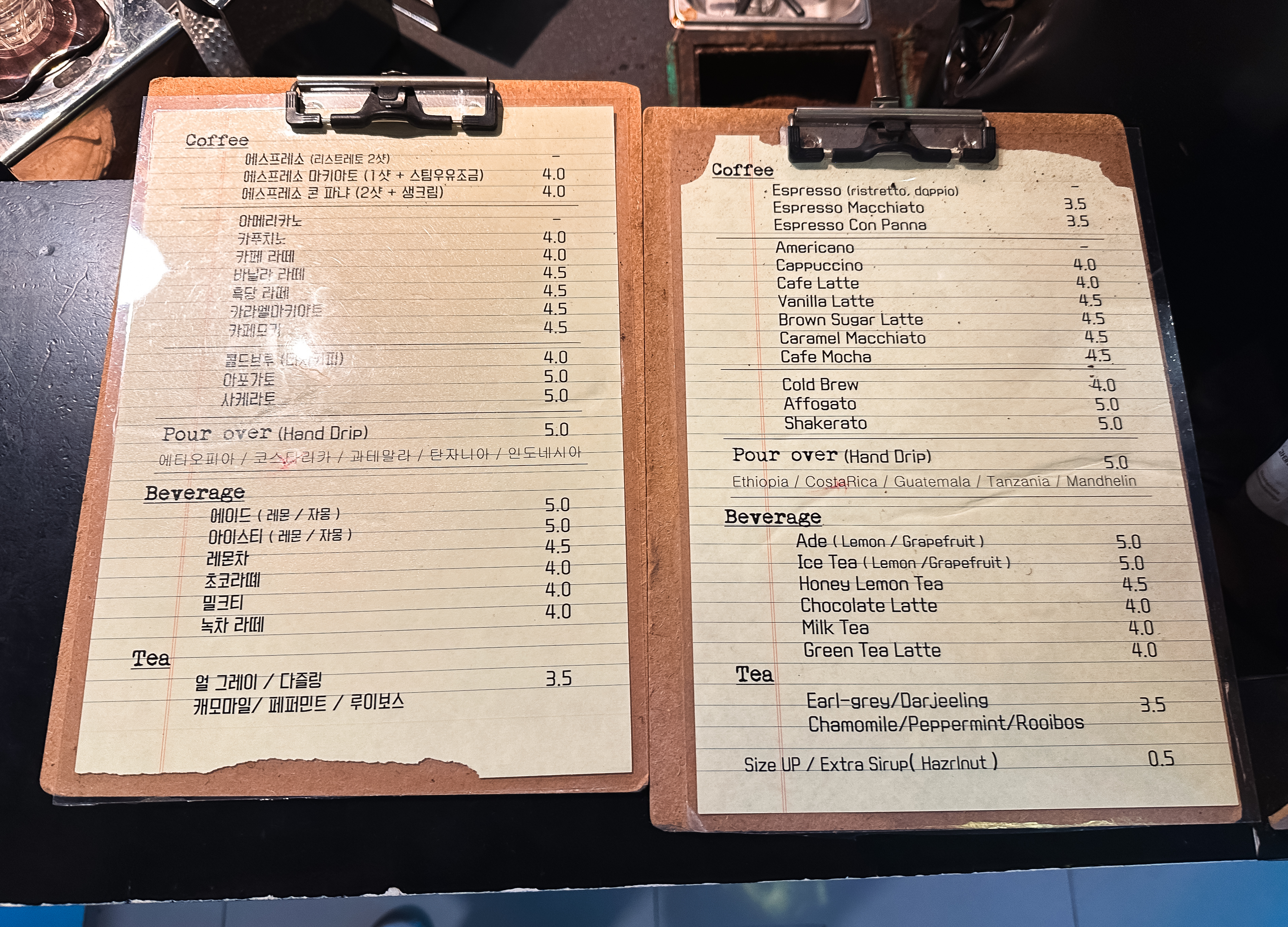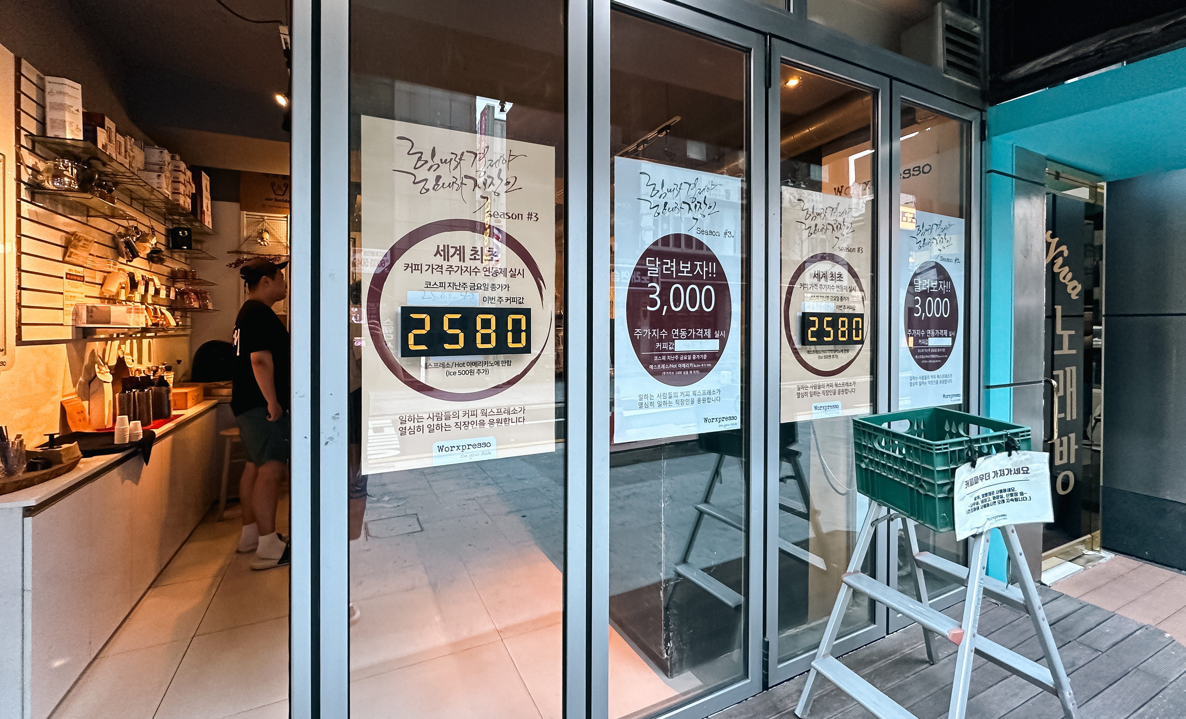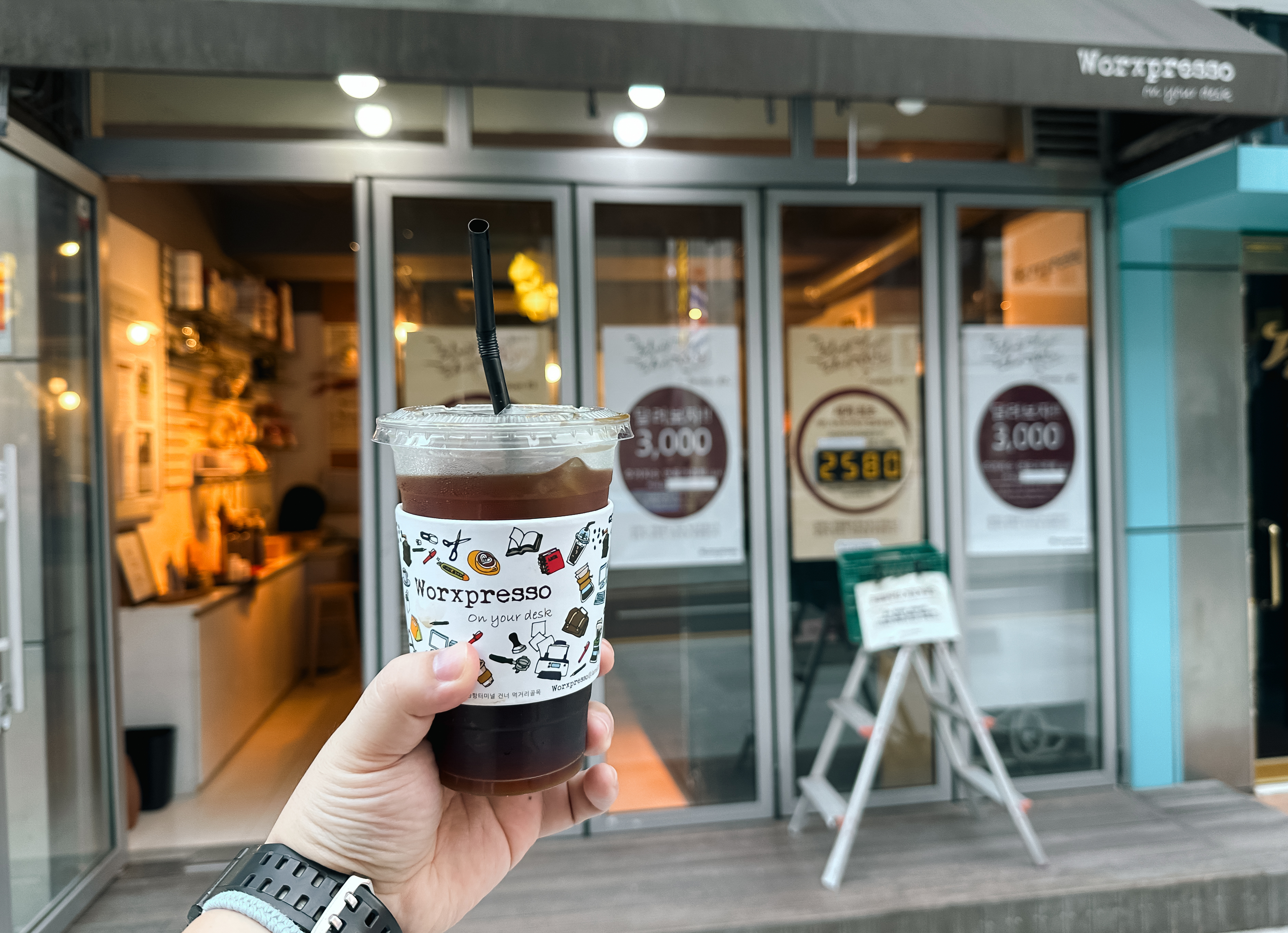 웍스프레소의 위치는 서울 강남구 삼성동 157-13, 1층 에 위치한 가게였습니다. 제가 방문한 날인 2024.08.14. 기준으로 2,580원에 아메리카노를 판매하고 있었습니다. 그럼 왜 2,580원에 책정되었는지 궁금하실 수도 있는데, 사장님께서는 전 주에 코스피 종가로 가격을 책정한다고 알려주셨습니다.