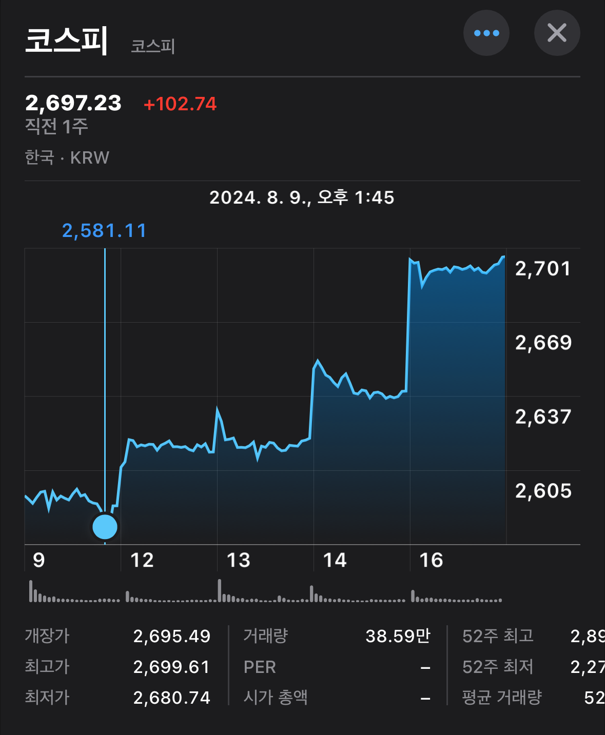 전 주 금요일인 2024.08.09. 종가에 따라서 약 2,580이 되었다고 알려주셨습니다.