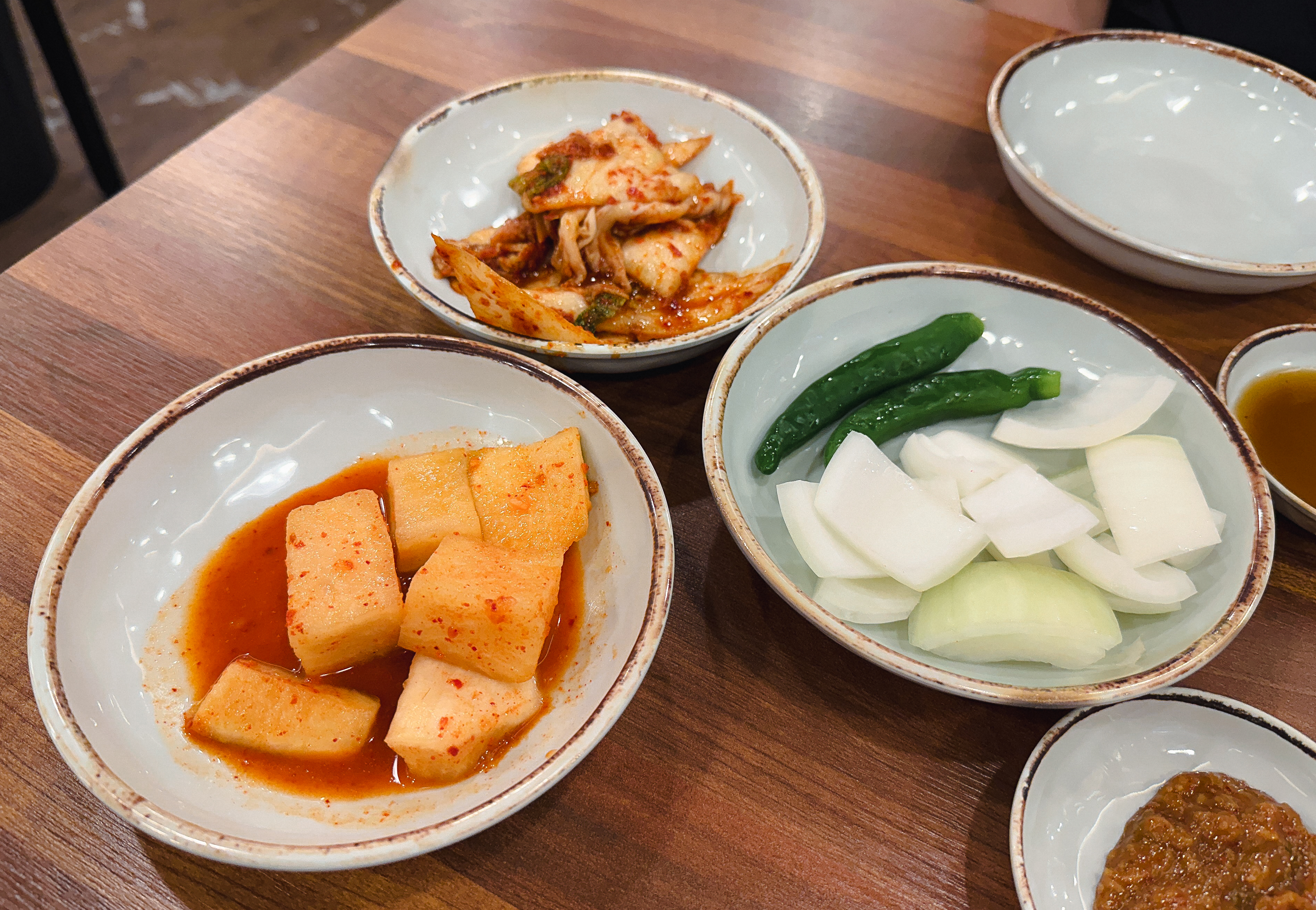 뼈해장국 특 사이즈에는 돈등뼈 3덩이가 들어있었는데 평소 뼈해장국 먹을 때 양이 부족하다고 느끼시는 분은 괜찮게 드실 수 있는 메뉴였습니다. 반찬으로는 배추김치, 무김치, 양파, 고추가 나왔습니다.