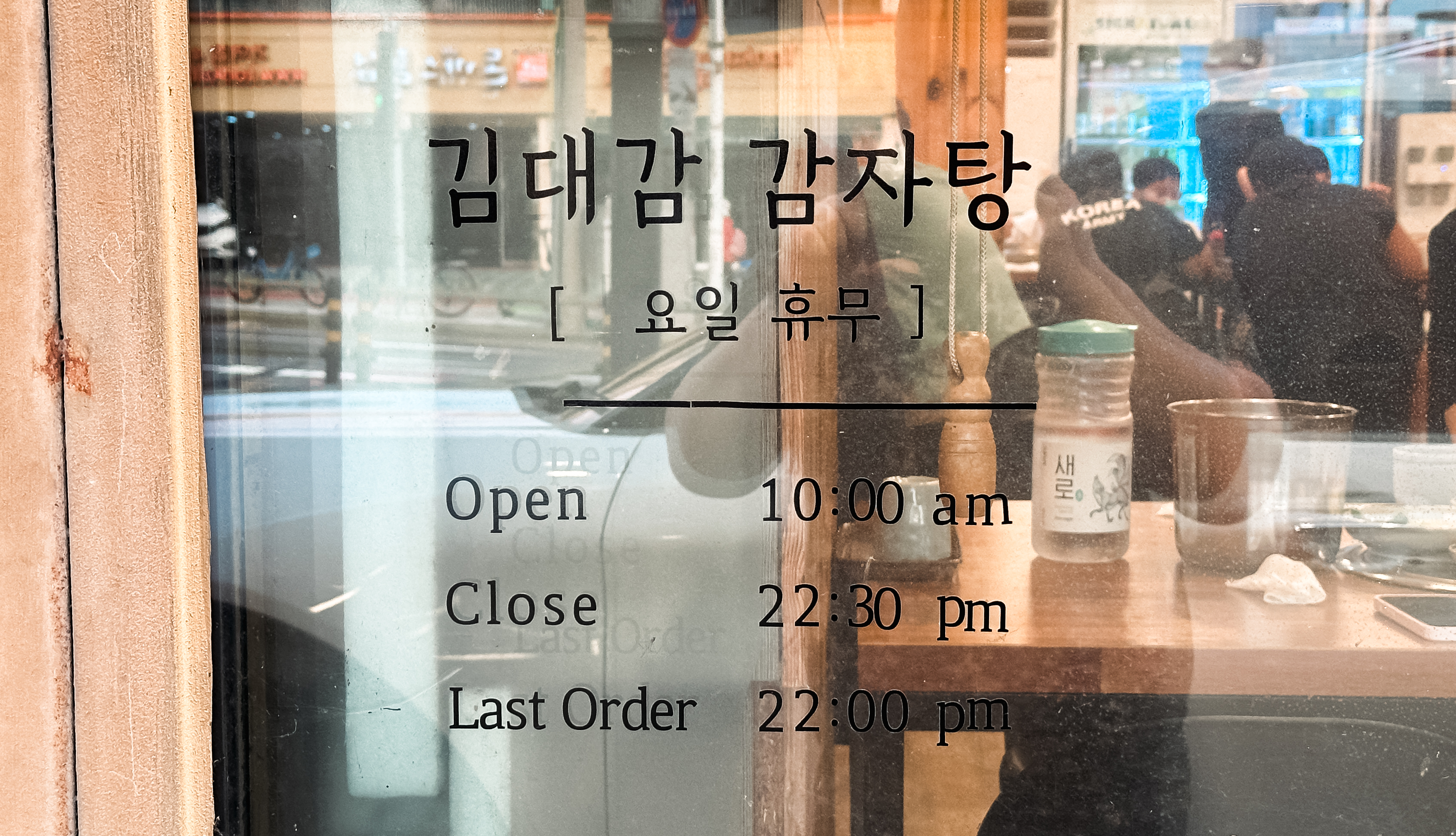 김대감감자탕은 서울 송파구 거여동 42-19, 1층 에 위치해 있었고, 손님들이 많이 찾는 가게였습니다. 가게에는 주차공간이 협소하지만 2대 정도 댈 수 있었는데, 인근에는 불법주차 단속을 하고 있기 때문에 주의해야 했습니다. 영업시간은 10:00~22:30 까지였습니다. 마지막주문은 22:00 까지라고 합니다.