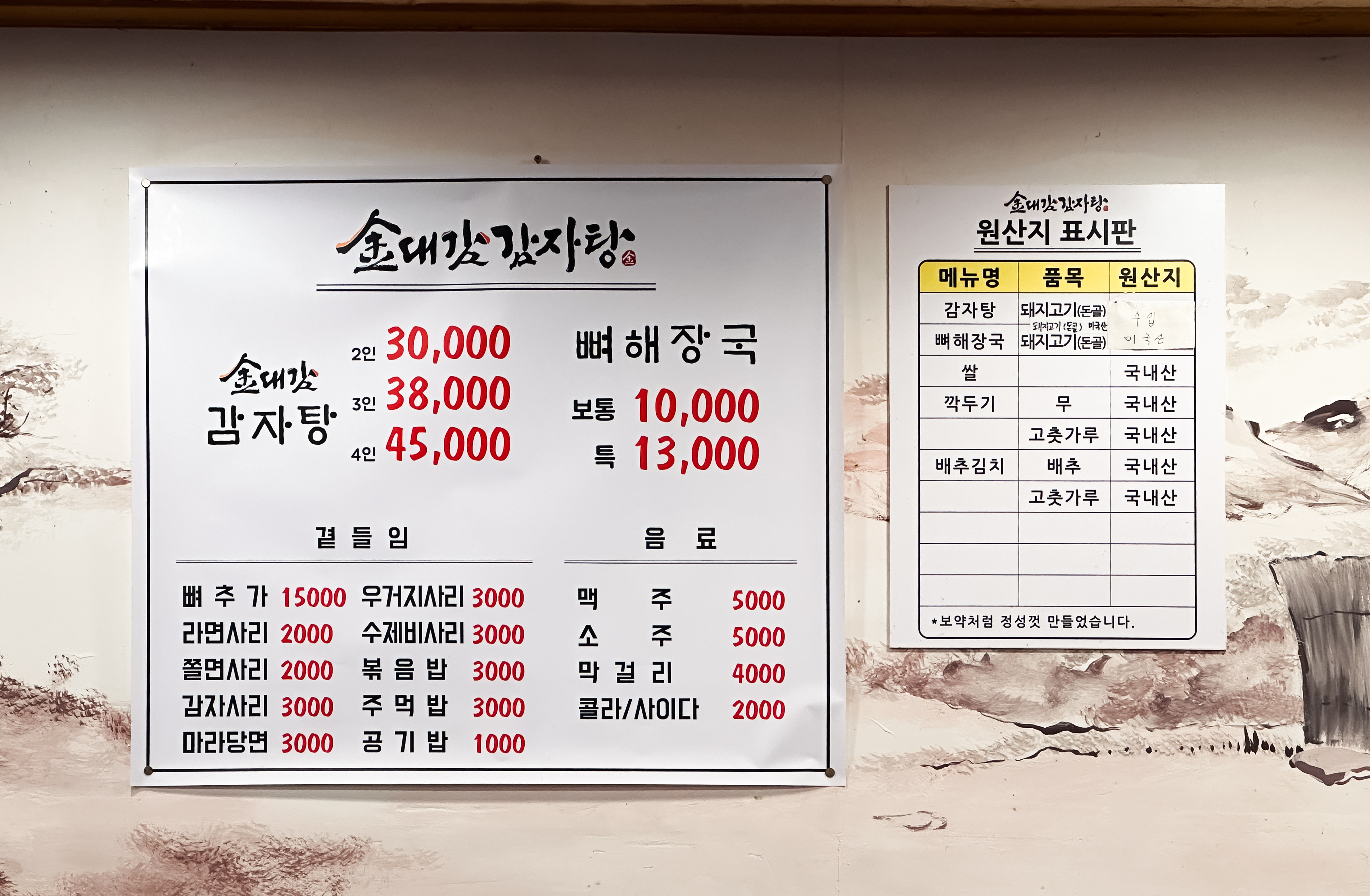 김대감감자탕은 진한 국물의 감자탕 맛집으로, 요즘엔 '송파 4대 감자탕(?)' 이라고 불리더라고요. 저는 솔직히 '송파 4대 감자탕'이라는 타이틀은 좀 억지스럽다고 느끼지만, 나름 맛이 괜찮다고 느끼는 가게이기 때문에 블로그에 올리게 되었습니다.