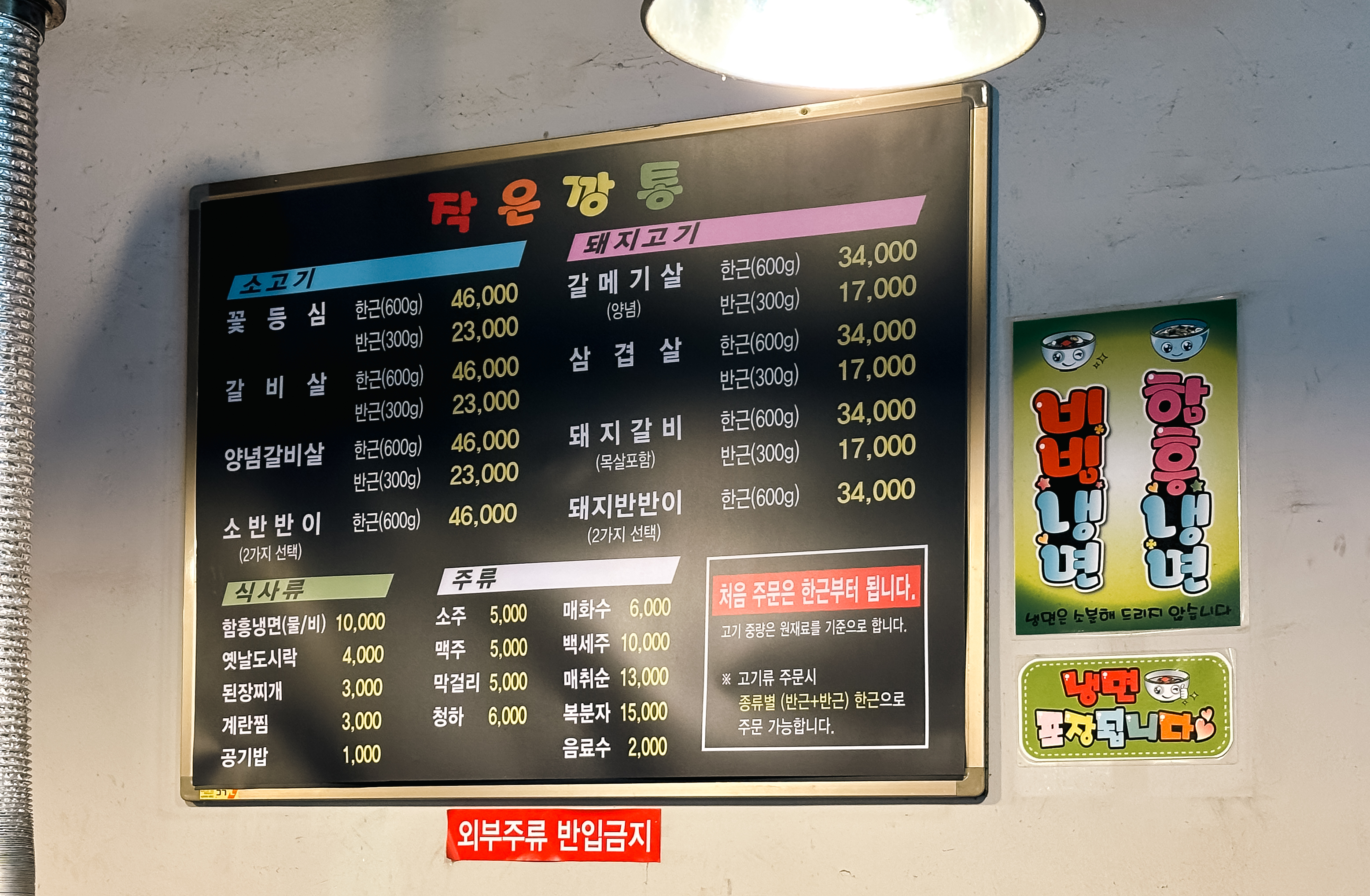 강동구 작은깡통의 메뉴를 보시죠. 꽃등심, 갈비살, 양념갈비살, 소반반이, 갈매기살, 삼겹살, 돼지갈비, 돼지반반이, 함흥냉면, 옛날도시락, 된장찌개, 계란찜 등이 있었습니다. 참고로 이곳은 이전 포스팅(링크)에서도 언급한 것처럼 반찬부터 소스까지 사장님이 직접 만들고 있었습니다.
