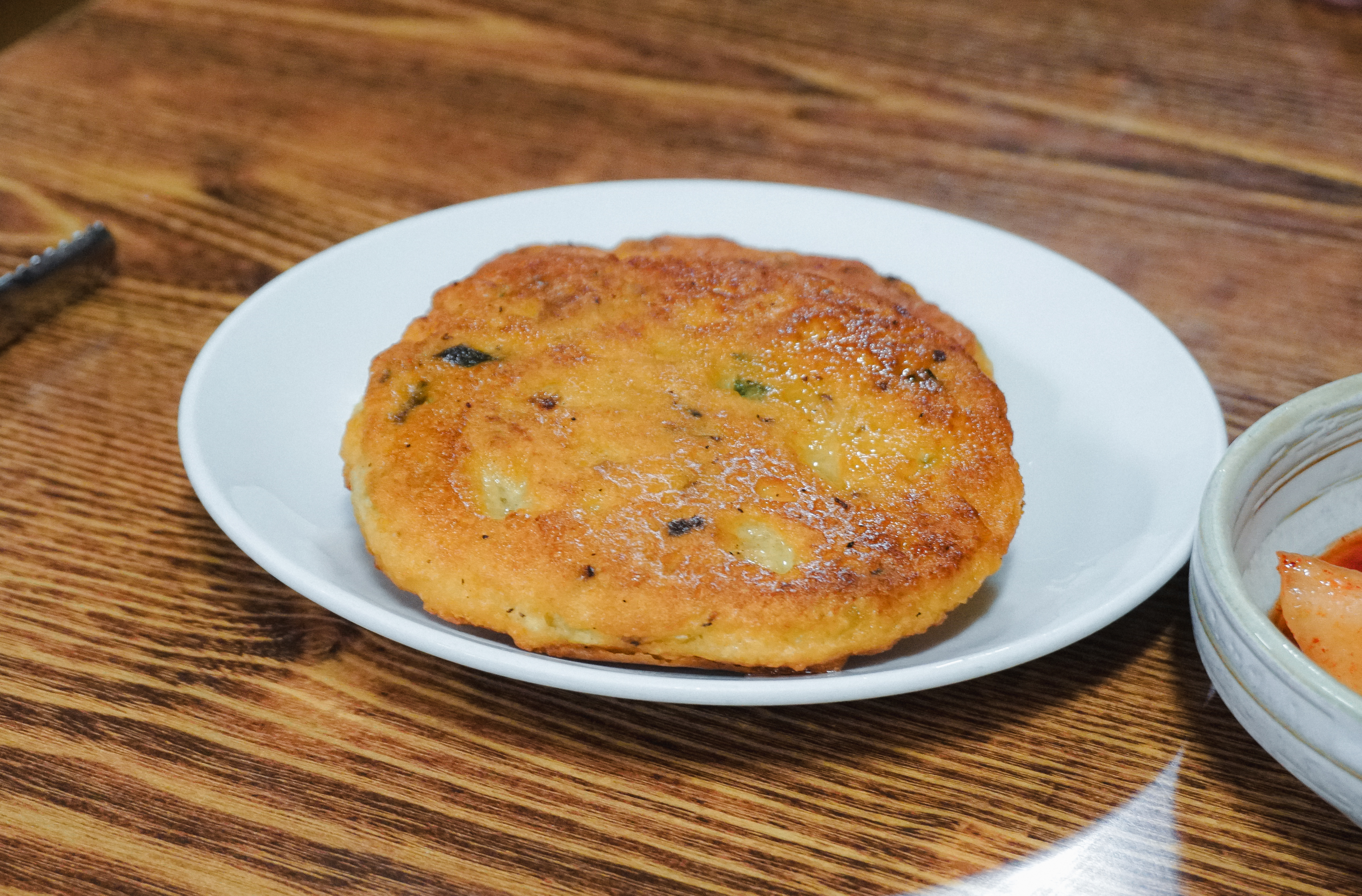 빈대떡은 조금 두툼한 편이었는데, 저는 개인적으로 약간 더 기름지게 부쳐도 맛있었을 것 같은데, 좀 퍽퍽한 느낌이라 아쉬운 느낌이 들었습니다. 빈대떡만 따로 먹기에는 조금 퍽퍽해서 김치와 곁들여서 먹어야 했습니다.