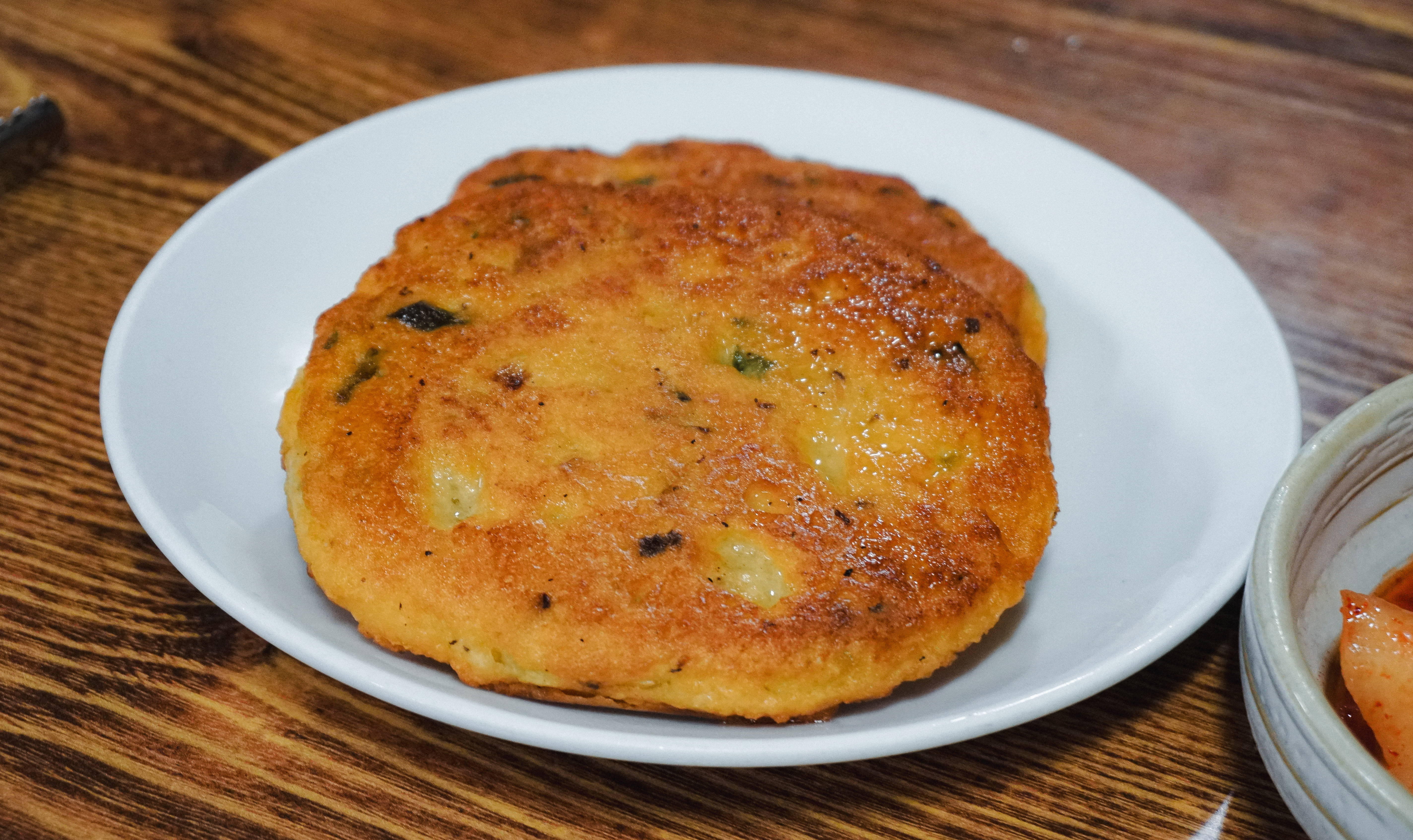 빈대떡은 조금 두툼한 편이었는데, 저는 개인적으로 약간 더 기름지게 부쳐도 맛있었을 것 같은데, 좀 퍽퍽한 느낌이라 아쉬운 느낌이 들었습니다. 빈대떡만 따로 먹기에는 조금 퍽퍽해서 김치와 곁들여서 먹어야 했습니다.