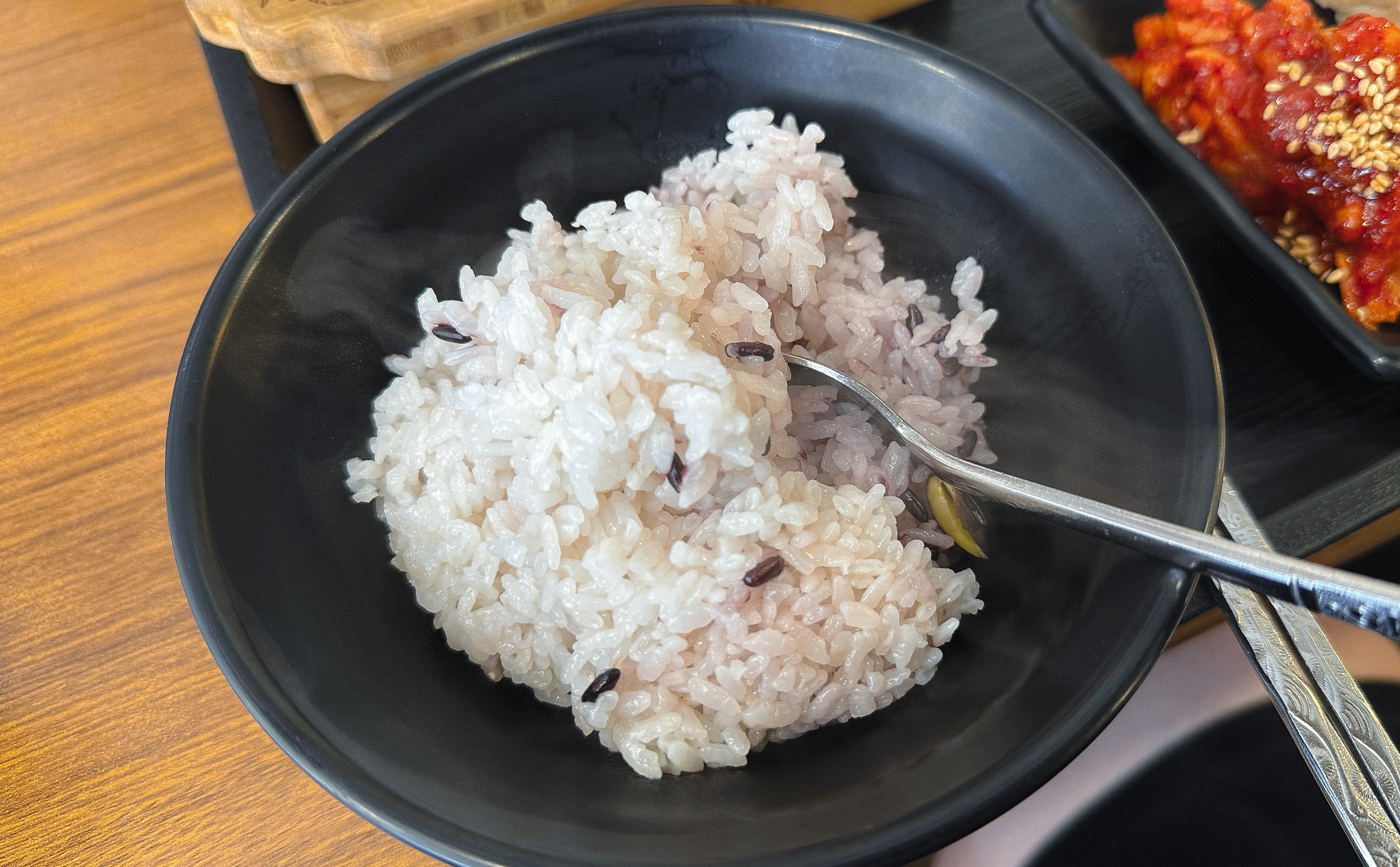 가마솥밥보쌈반상은 위와 같이 나왔고, 돌솥밥에 보쌈과 해물된장찌개 그리고 4가지 밑반찬이 나왔습니다. 먼저 가마솥 밥을 공기에 덜어내고, 나머지 밥에는 따뜻한 물을 부어주었습니다.