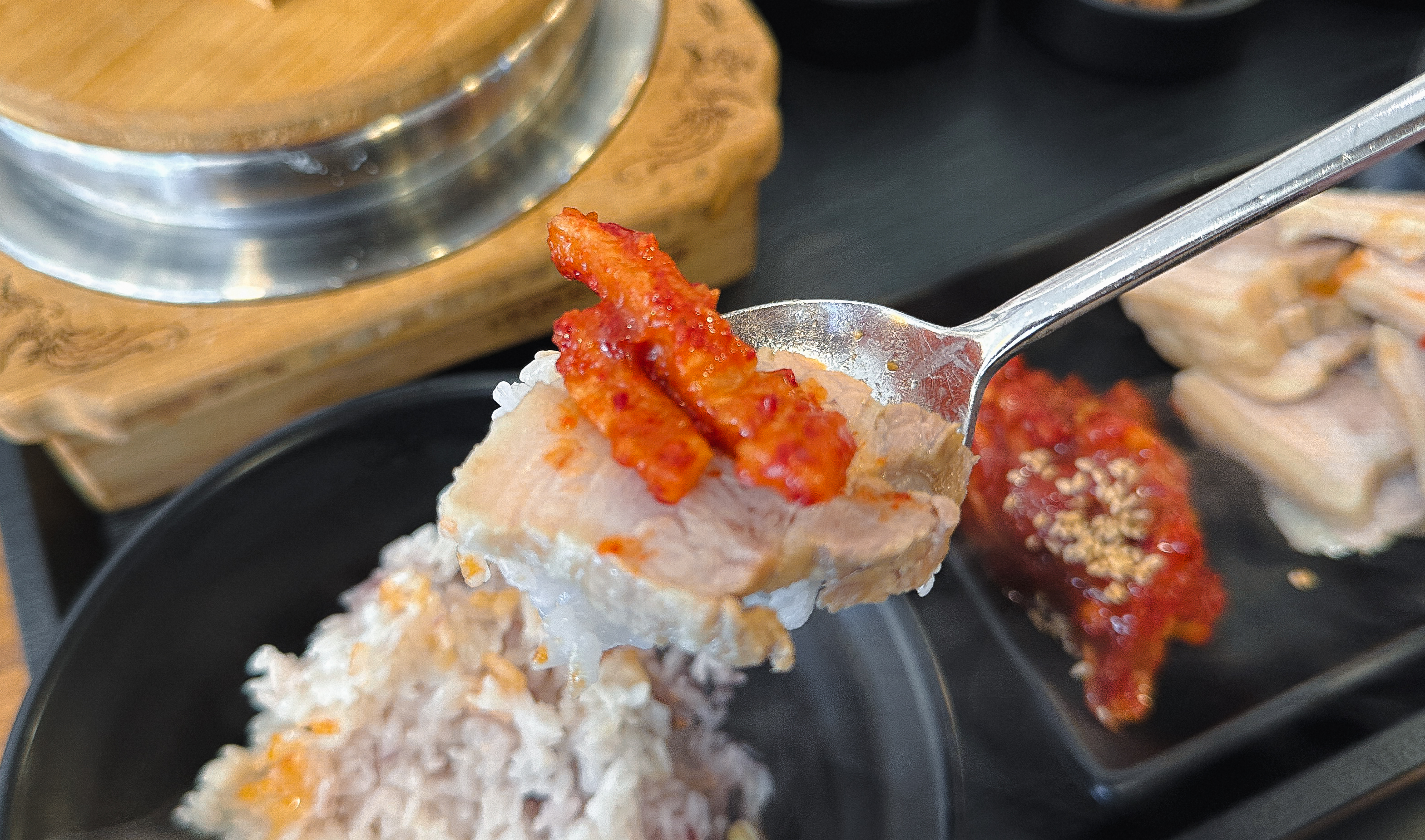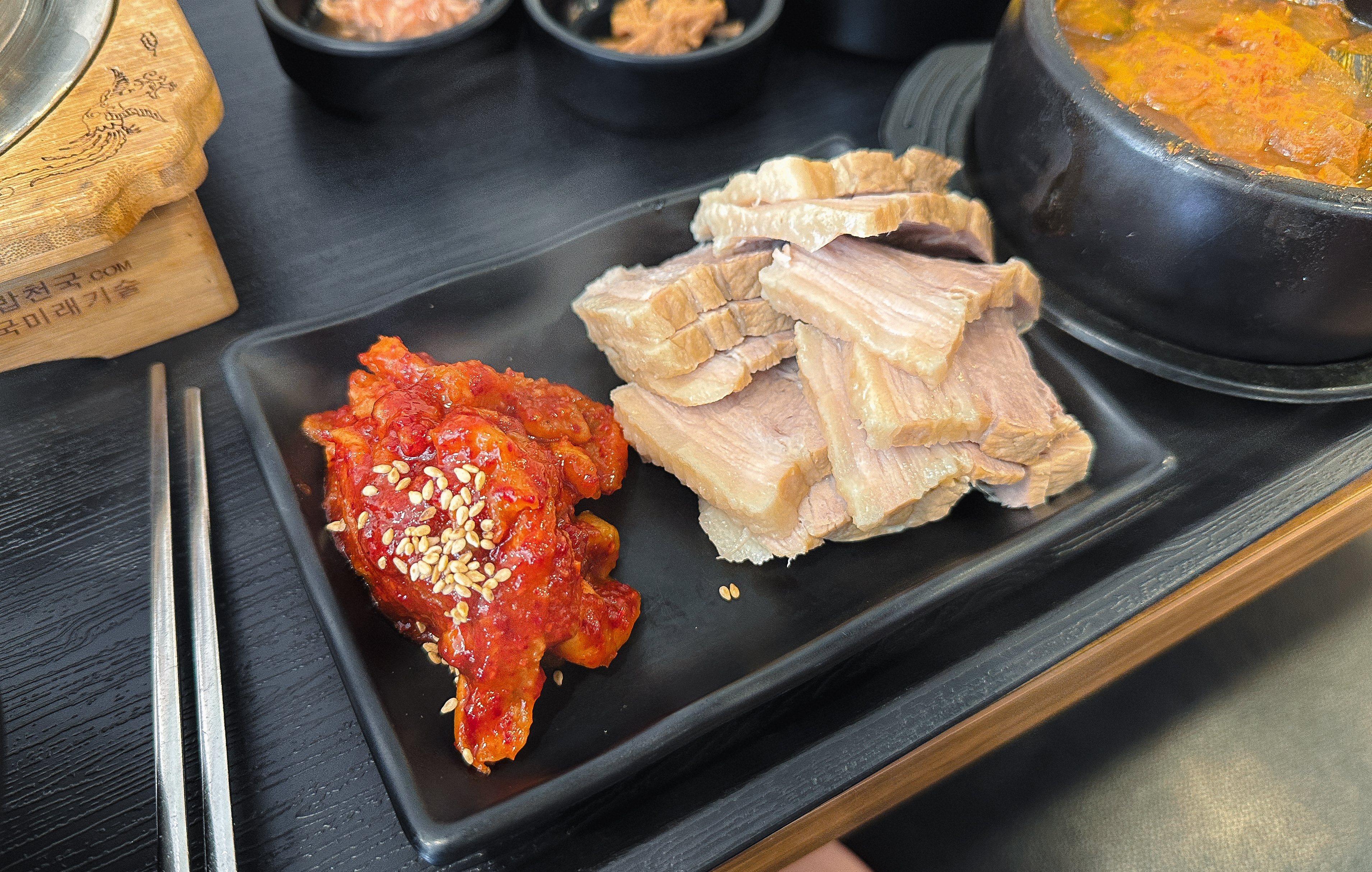메인 메뉴인 보쌈은 부드럽게 잘 삶아졌고, 누린내나 잡내가 나지 않아서 좋았습니다. 같이 나온 달달한 무김치와 곁들여 먹어도 맛있었고요. 글쎄 이전에 갔을 때는 뭔가 아쉬운 느낌이 강했는데, 요즘은 나름 분발하는 모습입니다.