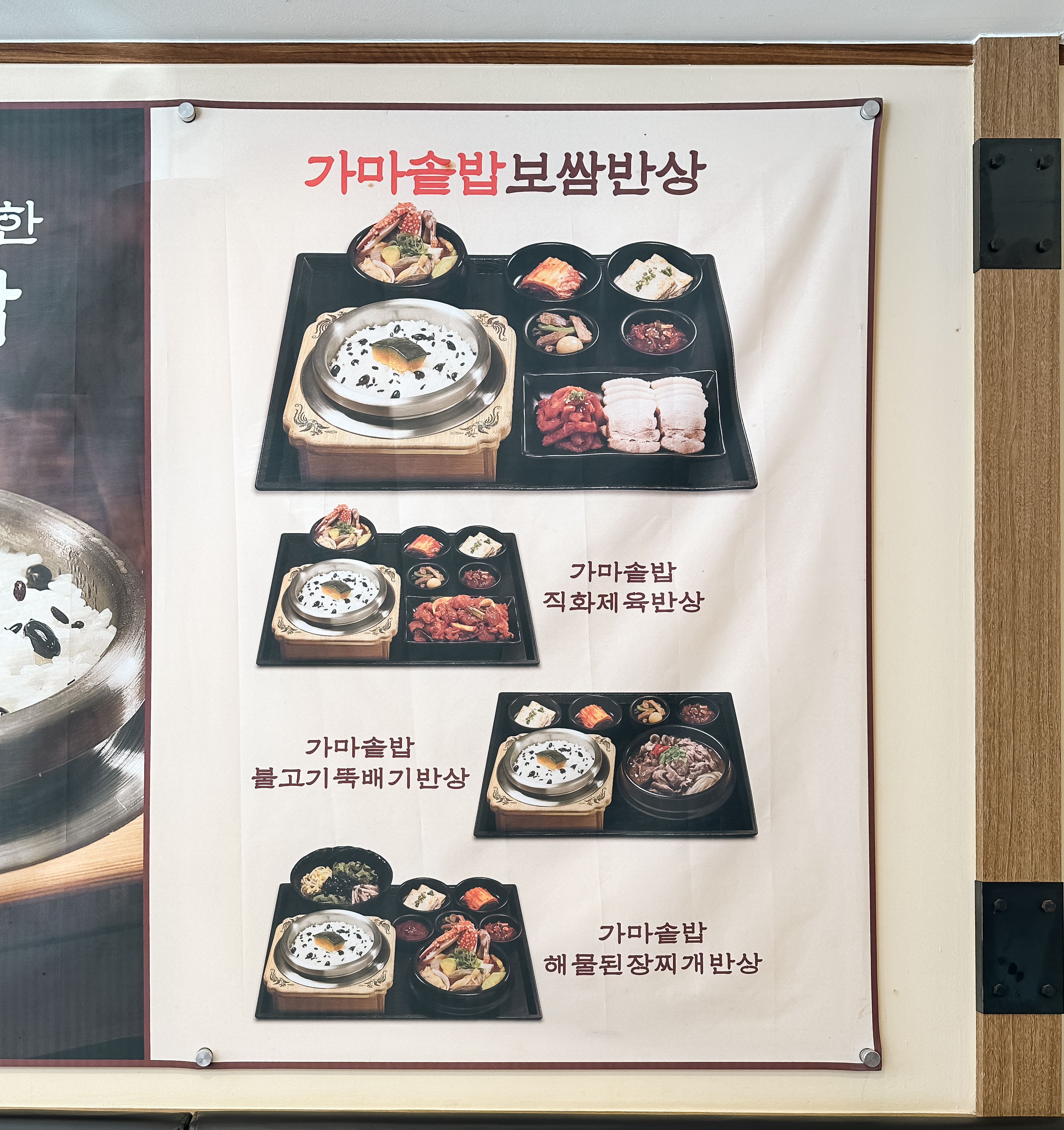 제가 식사했던 거여동 원할머니보쌈의 메뉴입니다. '가마솥밥보쌈반상'이라는 메뉴이며, 관련 메뉴로는 가마솥밥직화제육반상, 가마솥밥불고기뚝배기반상, 가마솥밥해물된장찌개반상이 있었습니다.