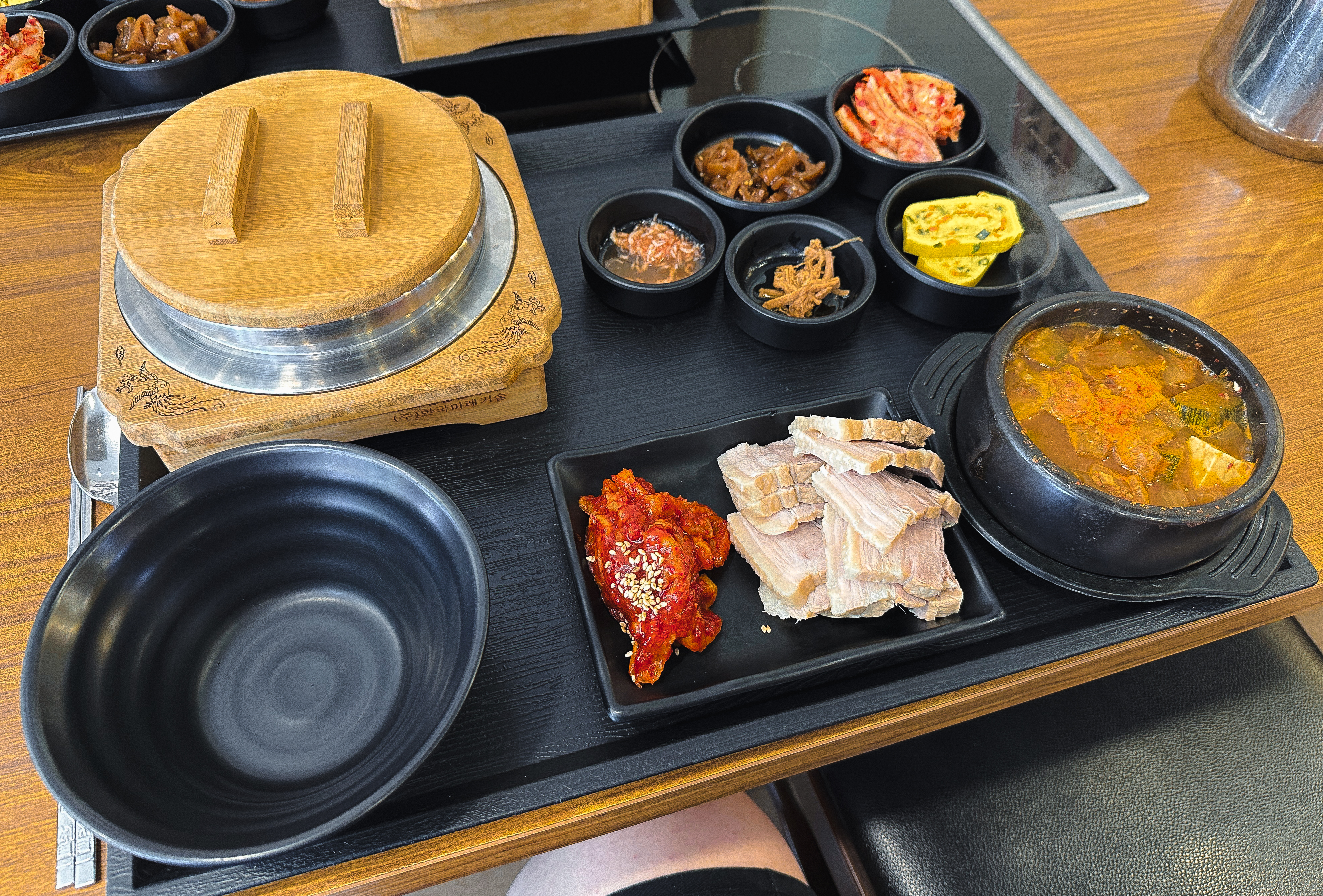 반찬으로 나오는 보쌈과 해물된장찌개 그리고 밑반찬들의 모습입니다. 제법 구성이 괜찮지 않나요? 보쌈도 양이 꽤 많았고, 해물된장찌개도 먹을만했고, 나머지 반찬까지 정갈하게 나오는 메뉴였습니다.