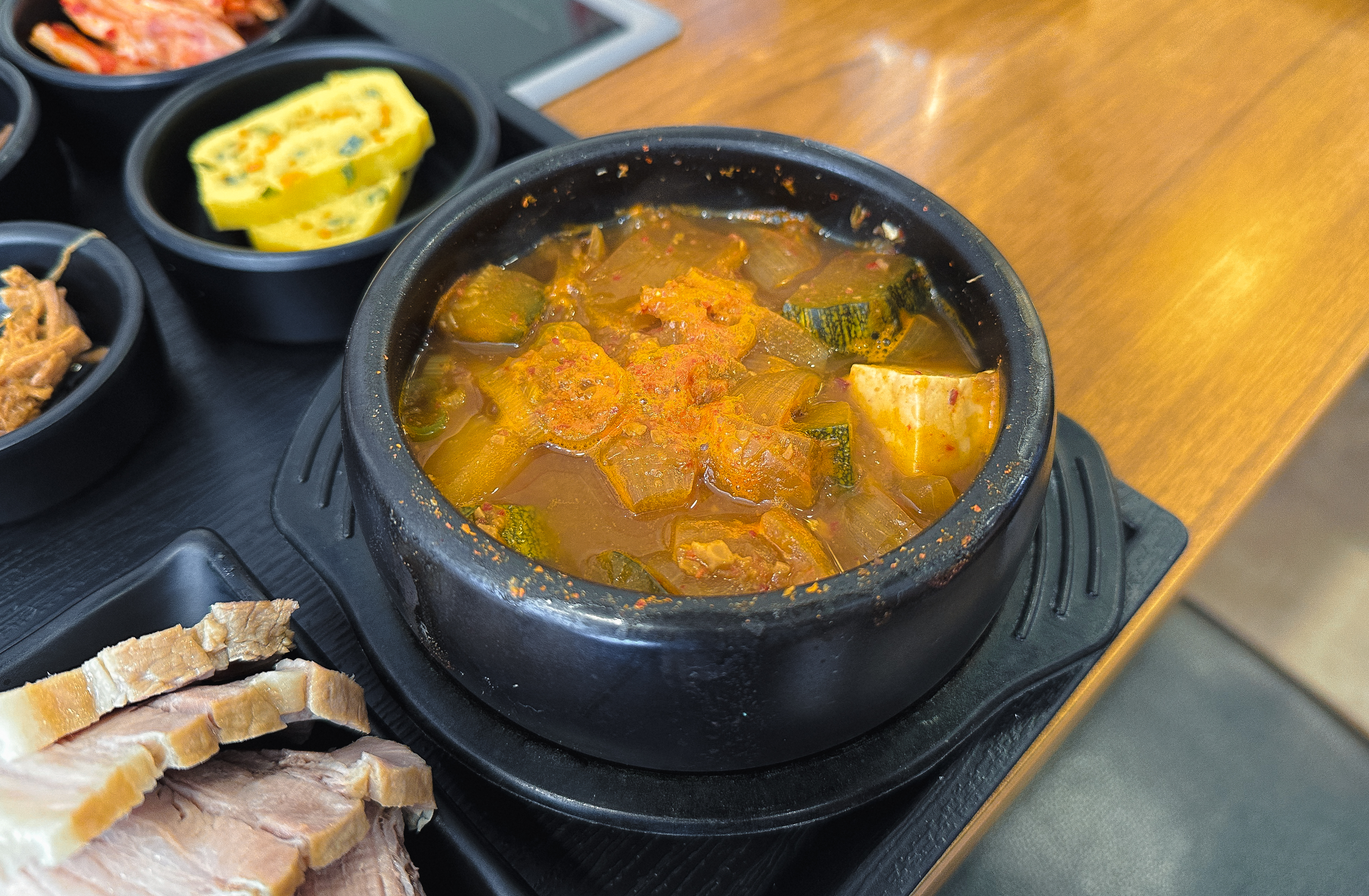 반찬으로 나오는 보쌈과 해물된장찌개 그리고 밑반찬들의 모습입니다. 제법 구성이 괜찮지 않나요? 보쌈도 양이 꽤 많았고, 해물된장찌개도 먹을만했고, 나머지 반찬까지 정갈하게 나오는 메뉴였습니다.