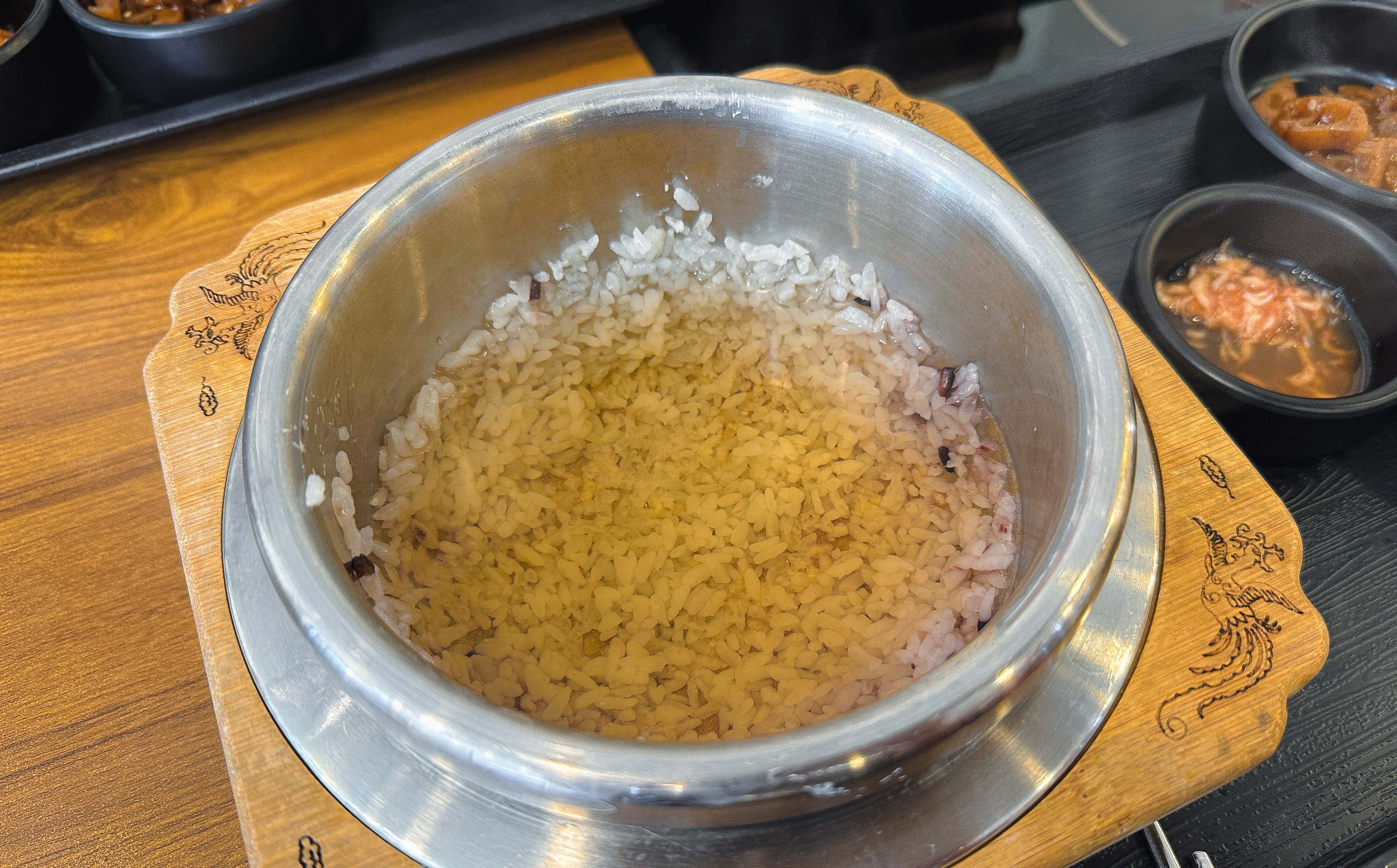 가마솥밥보쌈반상은 위와 같이 나왔고, 돌솥밥에 보쌈과 해물된장찌개 그리고 4가지 밑반찬이 나왔습니다. 먼저 가마솥 밥을 공기에 덜어내고, 나머지 밥에는 따뜻한 물을 부어주었습니다.