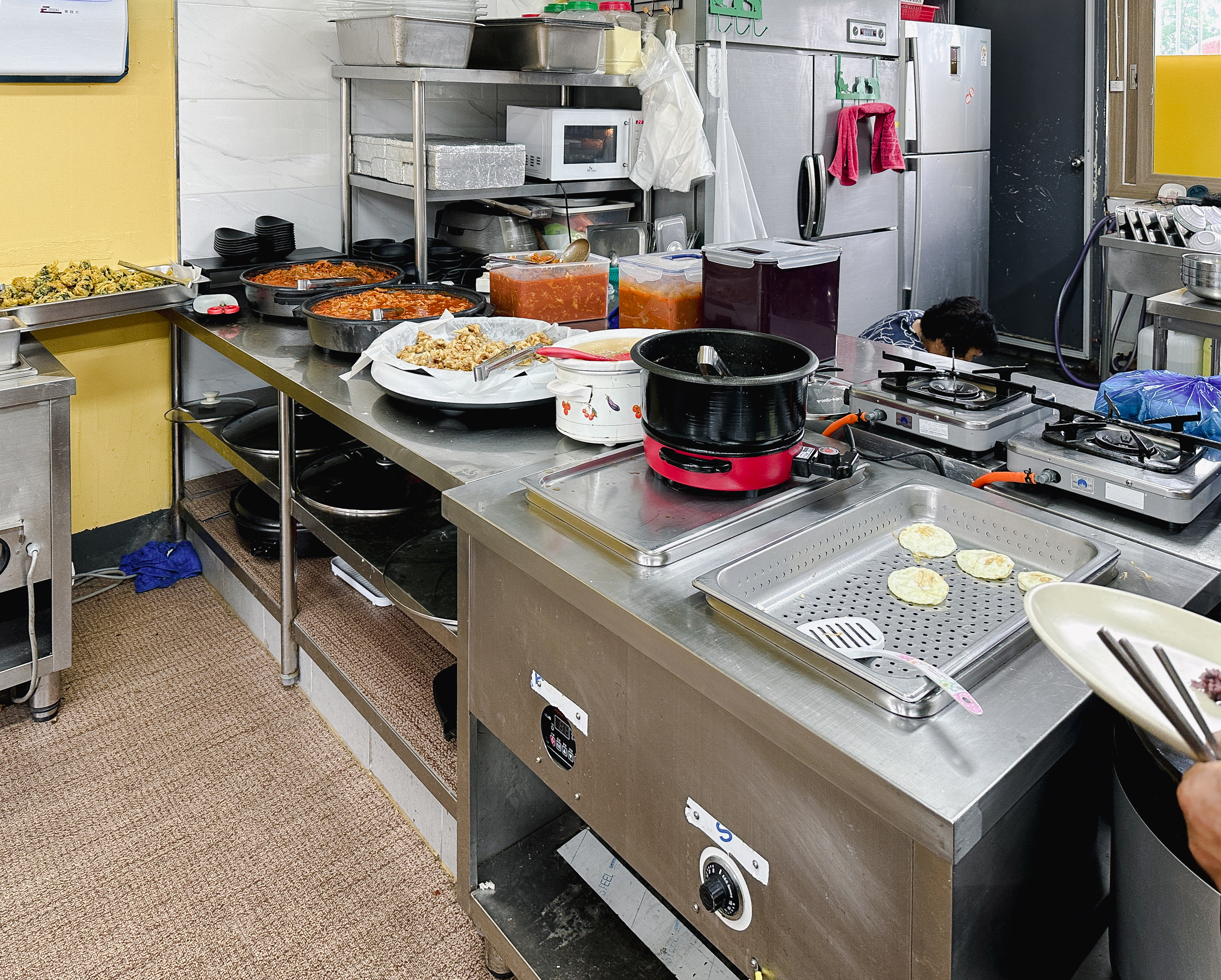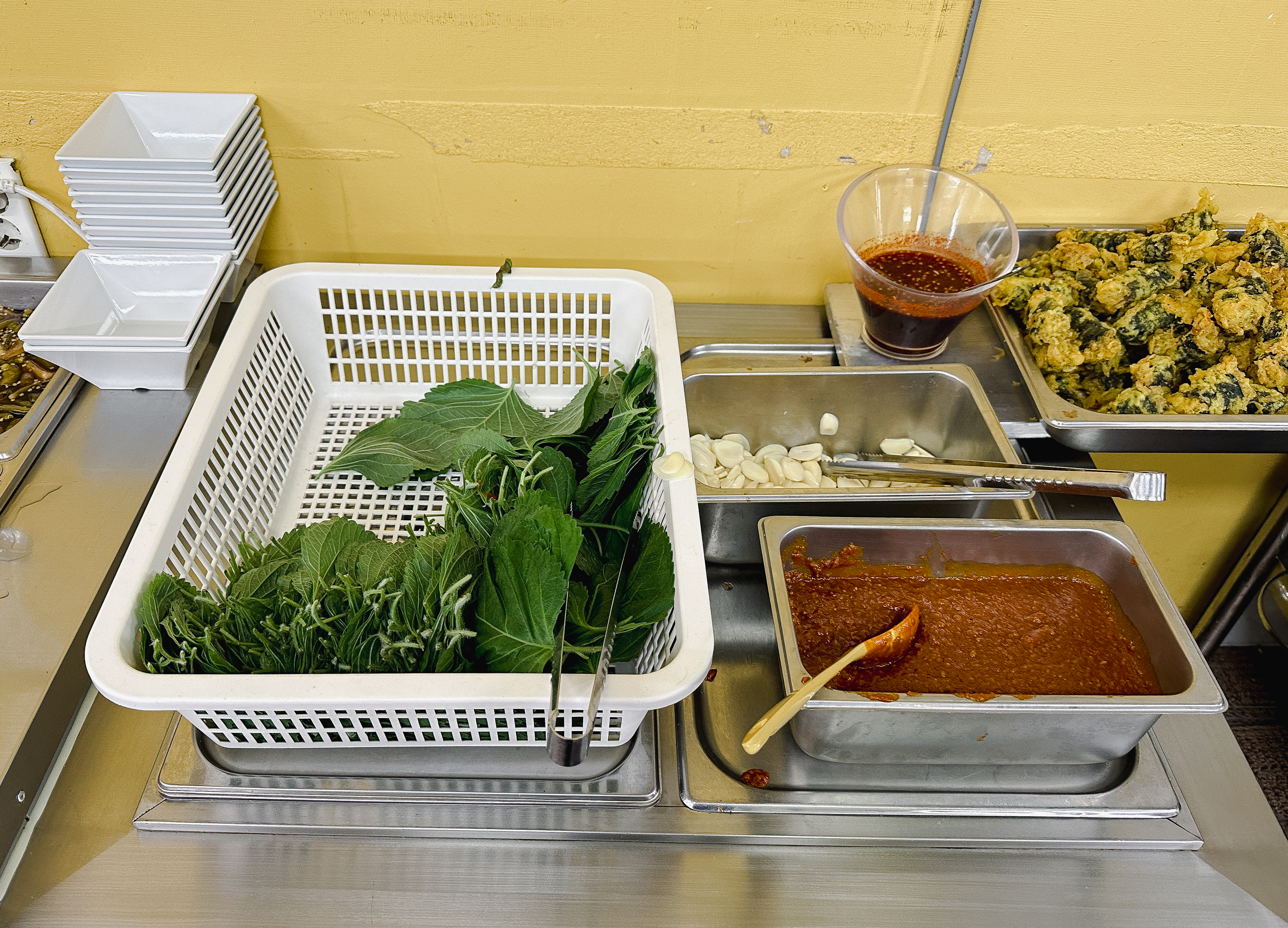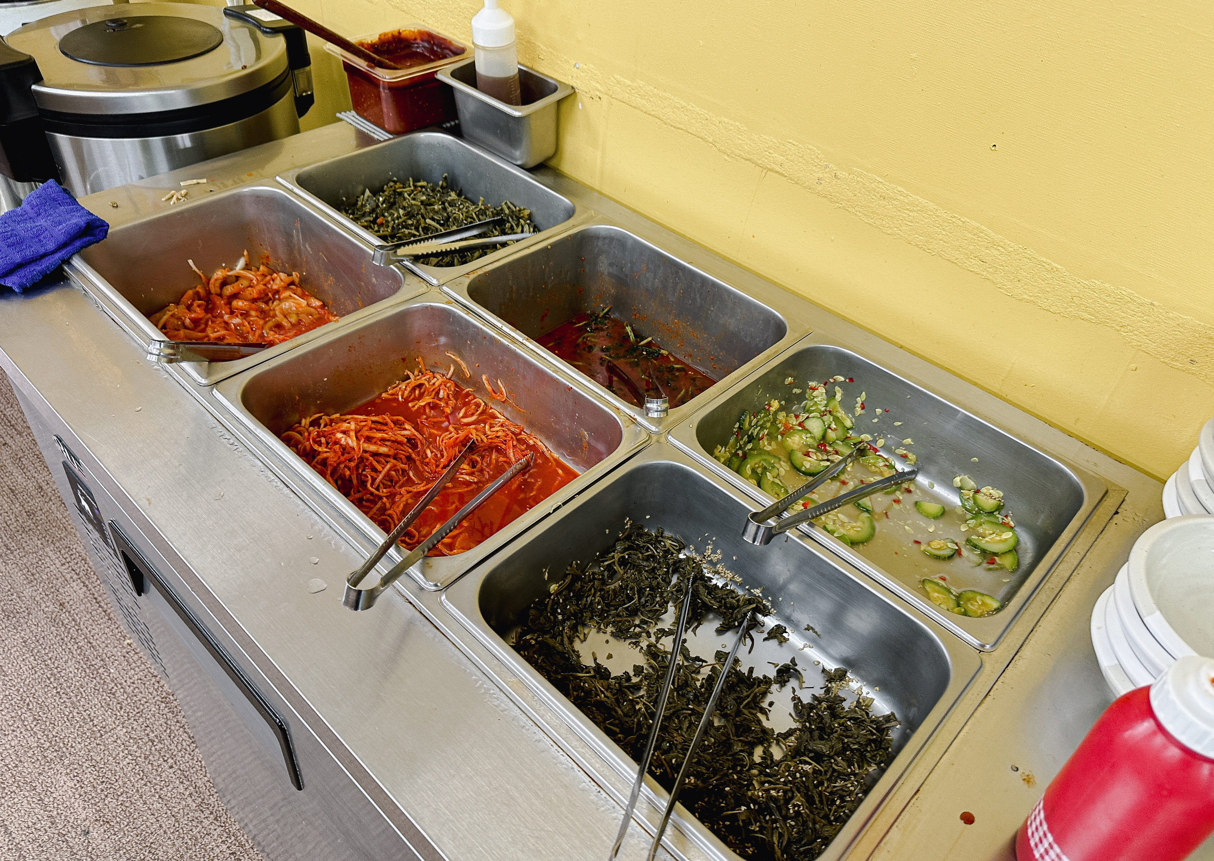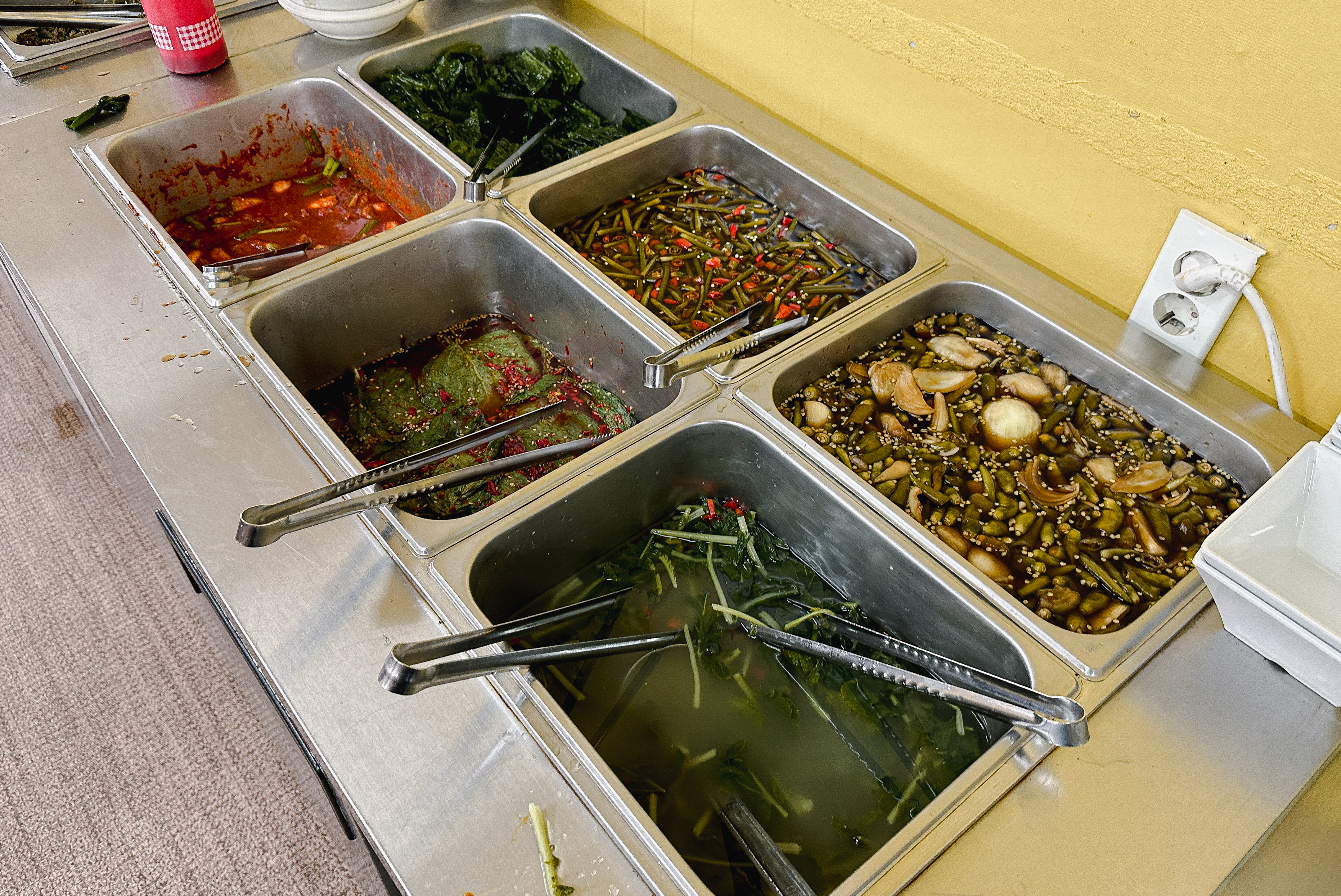 제가 방문한 날은 목요일로 제육볶음, 탕수육, 김말이튀김이 나왔고, 그밖에 달걀프라이, 족발, 쌈채소, 쌈장, 마늘, 그밖에 각종 절임반찬과 나물들이 있었습니다. 기호에 따라서 비빔밥도 해 먹을 수 있도록 재료들을 제공하고 있었고 후식으로는 식혜와 매실음료를 가져다 먹을 수 있었습니다. 반찬들은 기성품 없이 가게에서 모든 반찬을 만드는 듯하더라고요. 맛은 전체적으로 나쁘지 않았습니다.