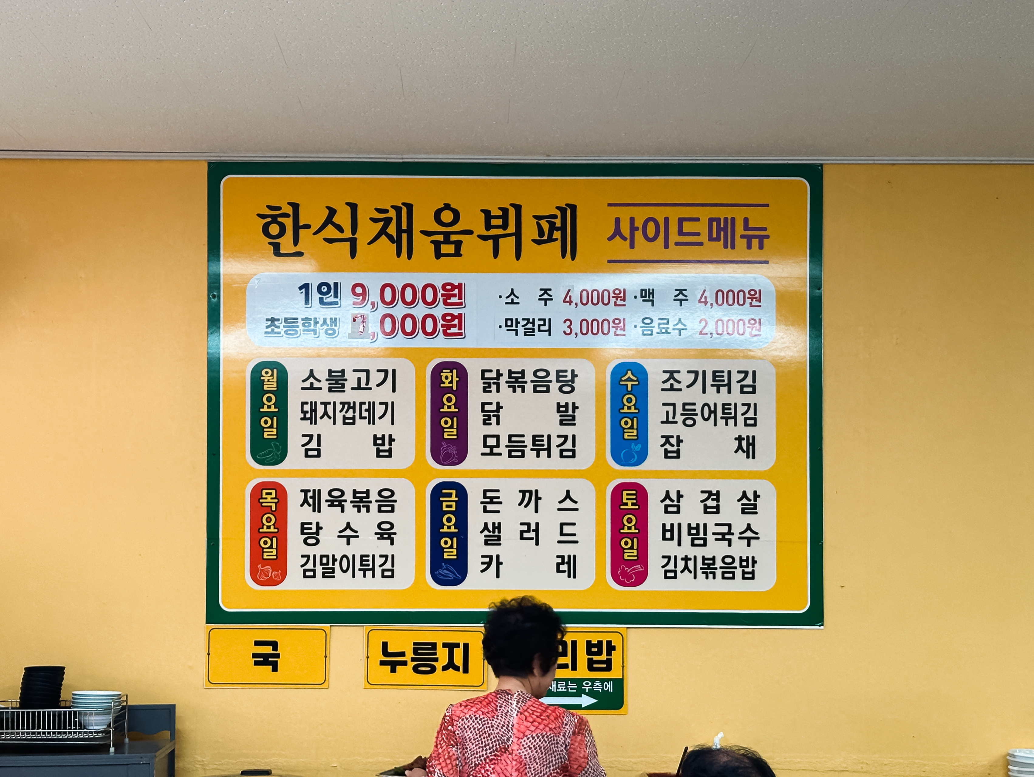 서산 채움뷔페의 1인 가격은 9,000원이었고, 월요일부터 토요일까지 메뉴들이 상이했습니다. 각 요일별 소불고기, 닭볶음탕, 조기튀김, 제육볶음, 돈까스, 삼겹살 등 괜찮은 메뉴들이 포함되어 있었습니다.