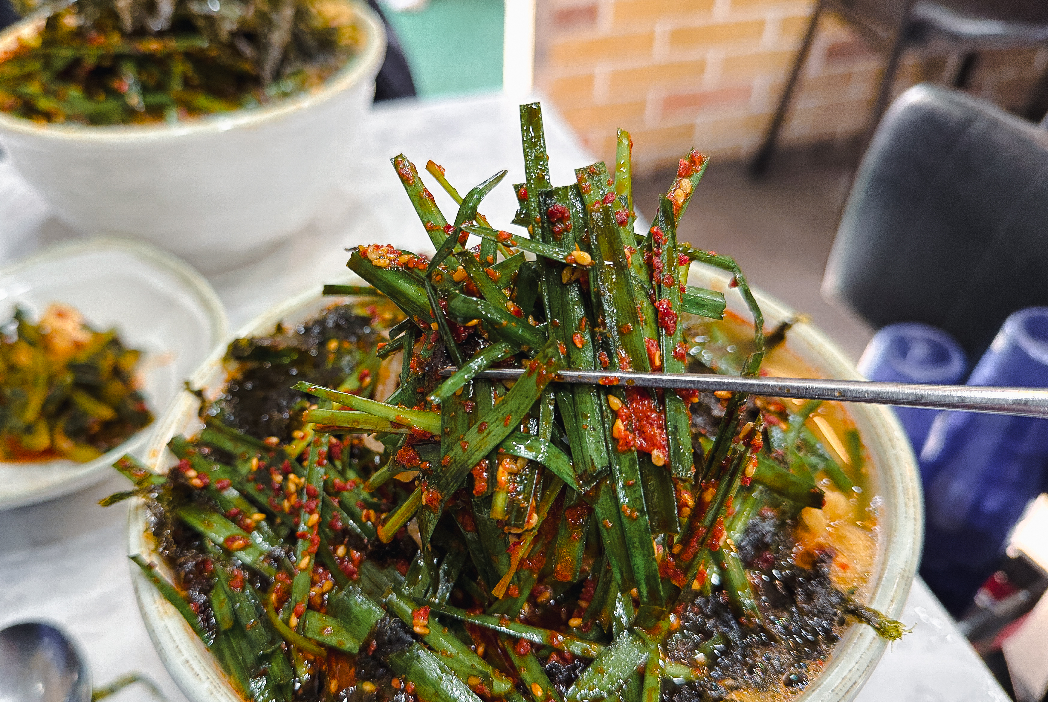 가이오국수의 얼큰부추국수가 나왔습니다. 얼큰부추국수에는 산더미 같은 양의 부추와 다이어트사이즈임에도 벅찰 정도로 많은 양의 소면이 들어있었습니다. 부추나 국수, 국물 같은 경우에도 추가를 원하시면 추가해 주시고, 별도의 말씀을 드리지 않아도 더 챙겨주시기도 하더라고요.