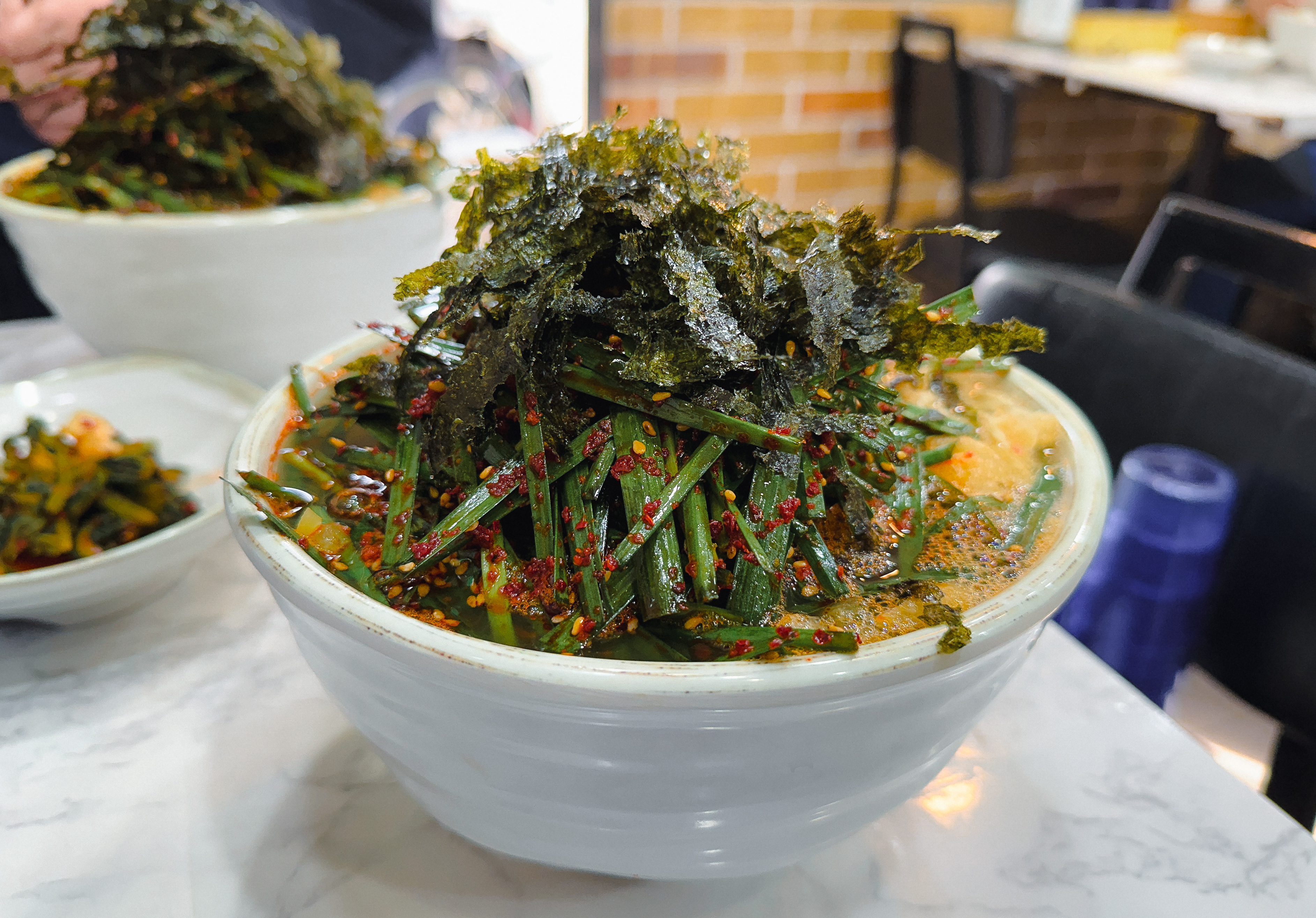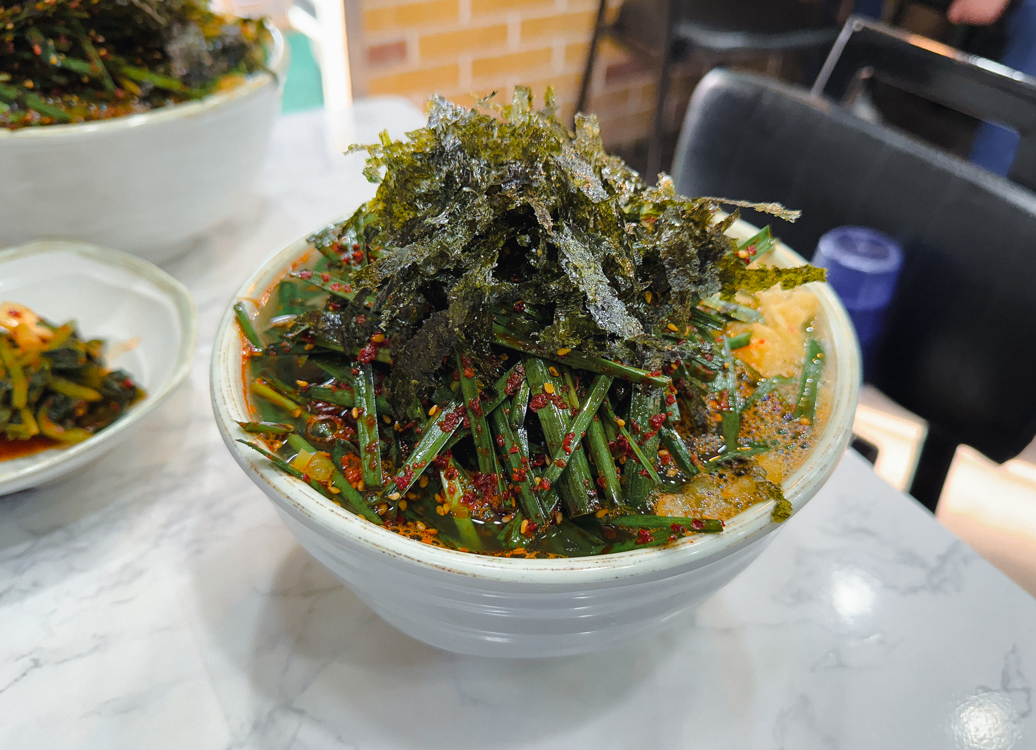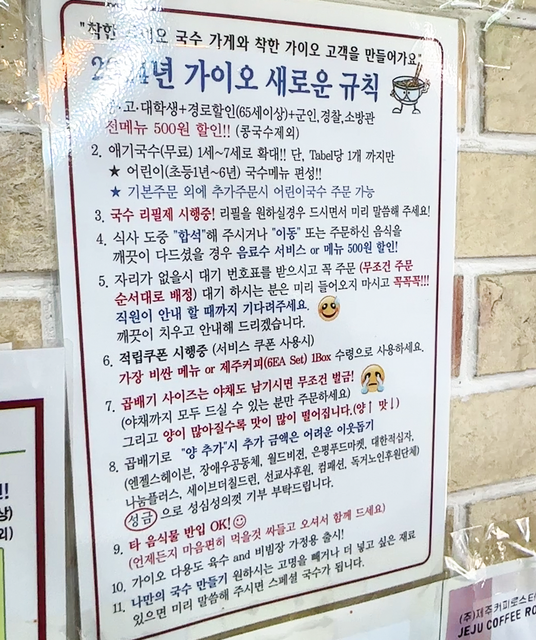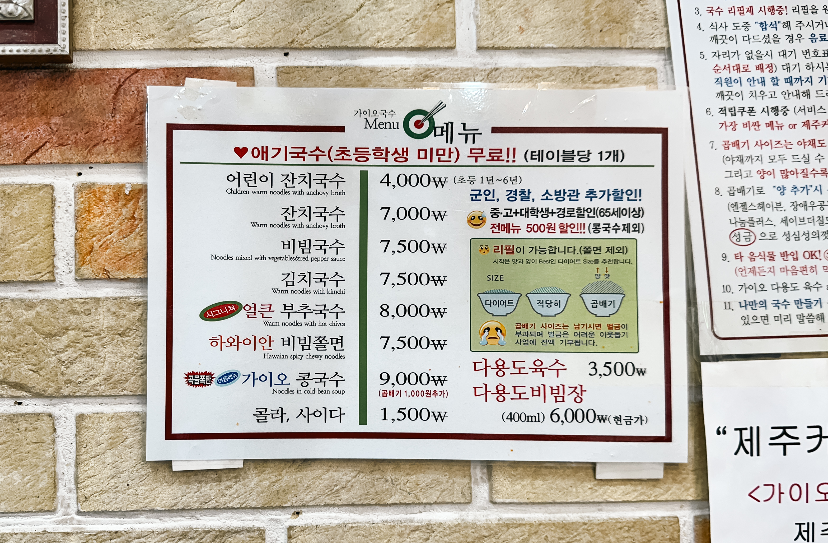 이곳은 특히 국수 양이 작거든 리필을 할 수 있었습니다. 그 밖에도 메뉴를 남김없이 다 먹을 경우 음료수서비스나 500원 할인을 하고 있었고, 채소 같은 경우도 추가를 원하시면 가게 사장님께 말씀드리면 더 주고 계셨습니다. 저는 양이 많을 것이 걱정되어 다이어트 사이즈의 얼큰부추국수를 주문했습니다.