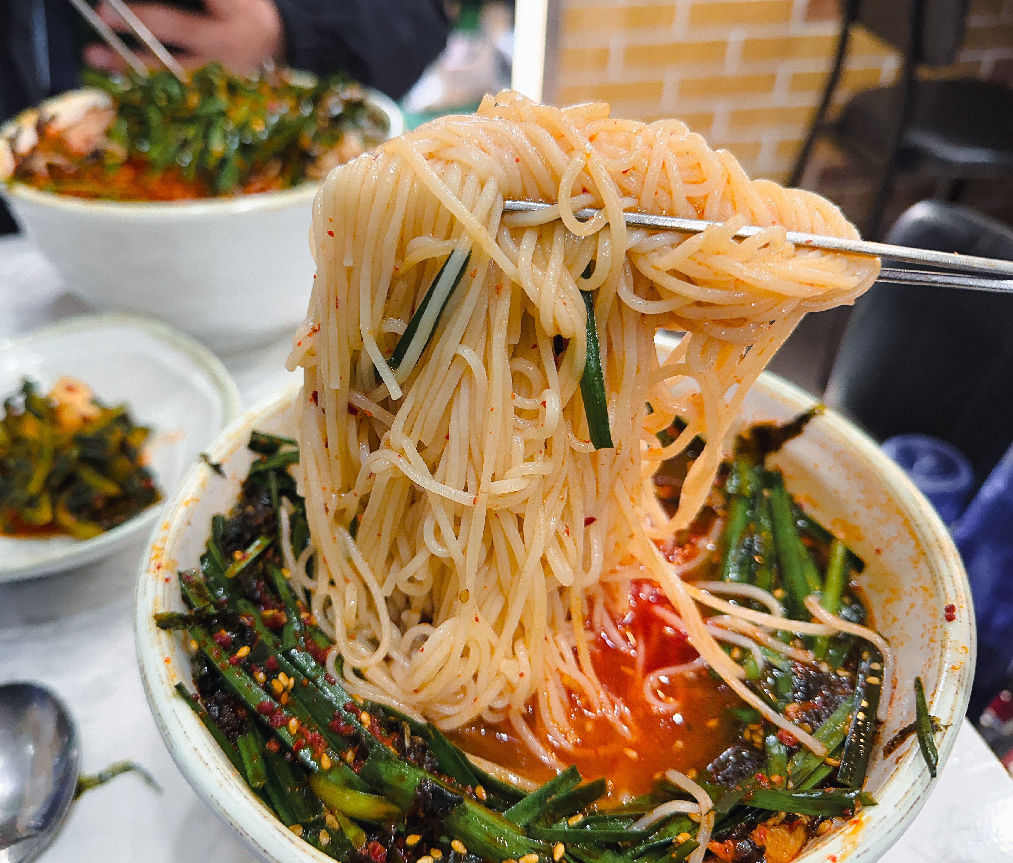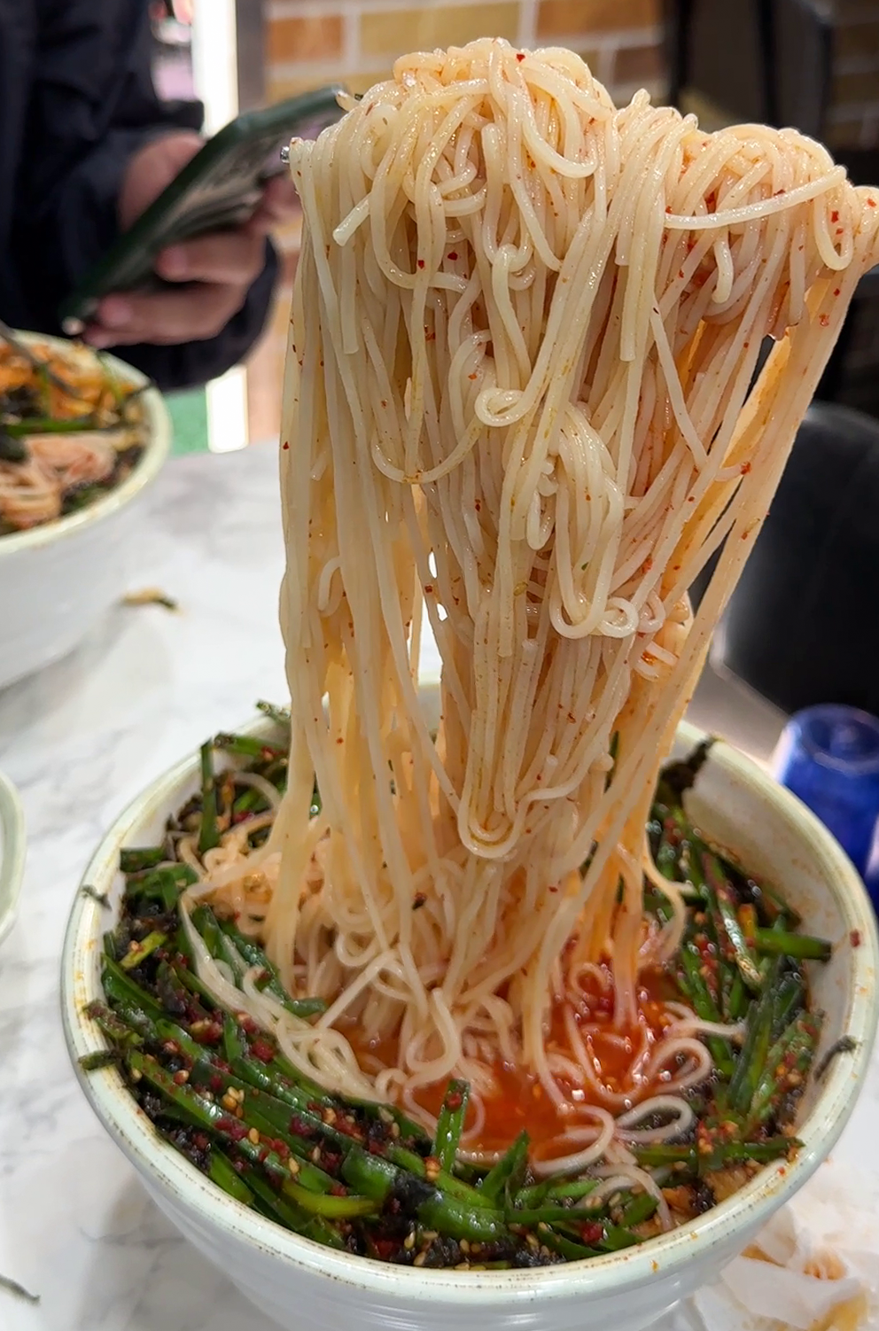 가이오국수의 얼큰부추국수가 나왔습니다. 얼큰부추국수에는 산더미 같은 양의 부추와 다이어트사이즈임에도 벅찰 정도로 많은 양의 소면이 들어있었습니다. 부추나 국수, 국물 같은 경우에도 추가를 원하시면 추가해 주시고, 별도의 말씀을 드리지 않아도 더 챙겨주시기도 하더라고요.