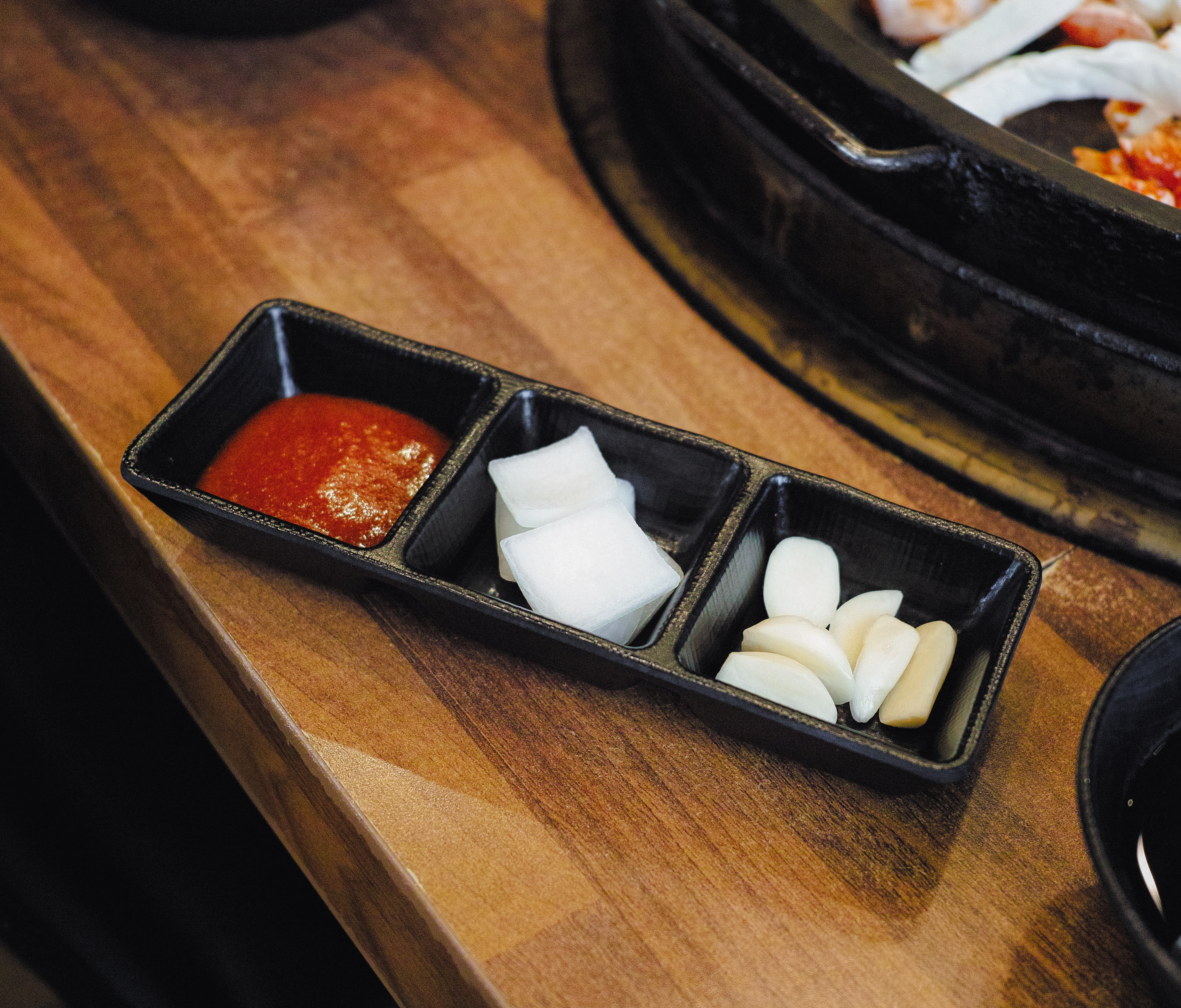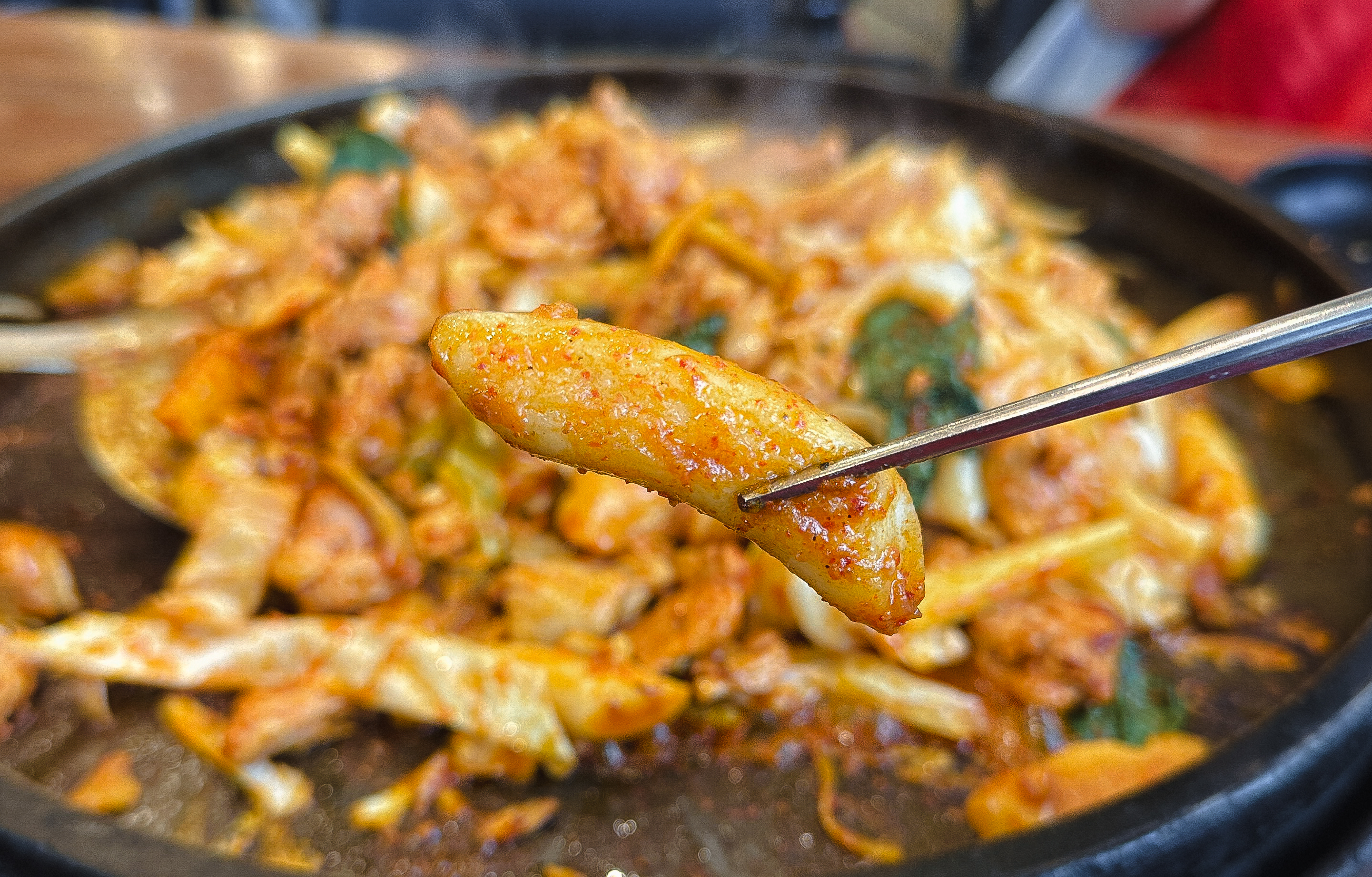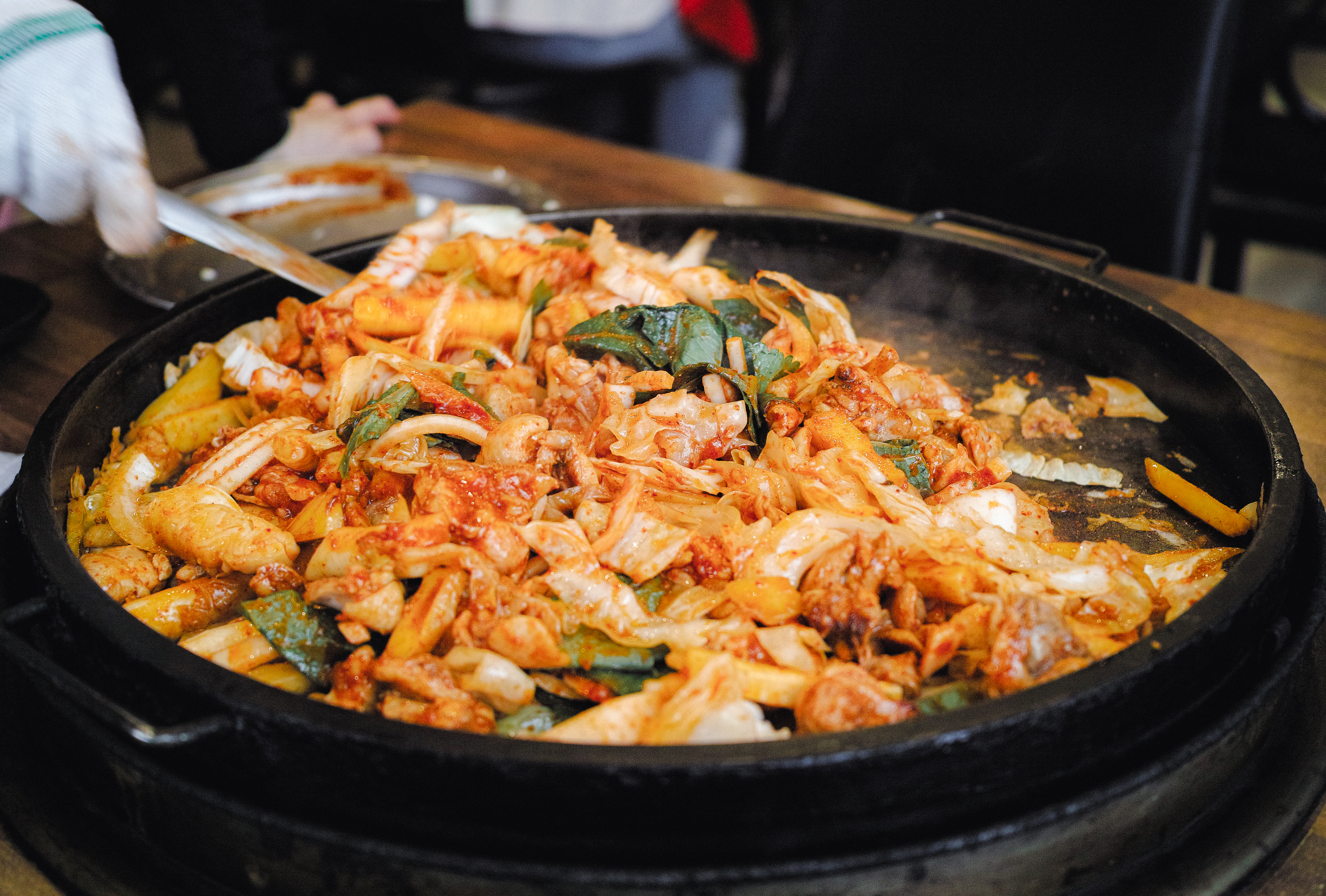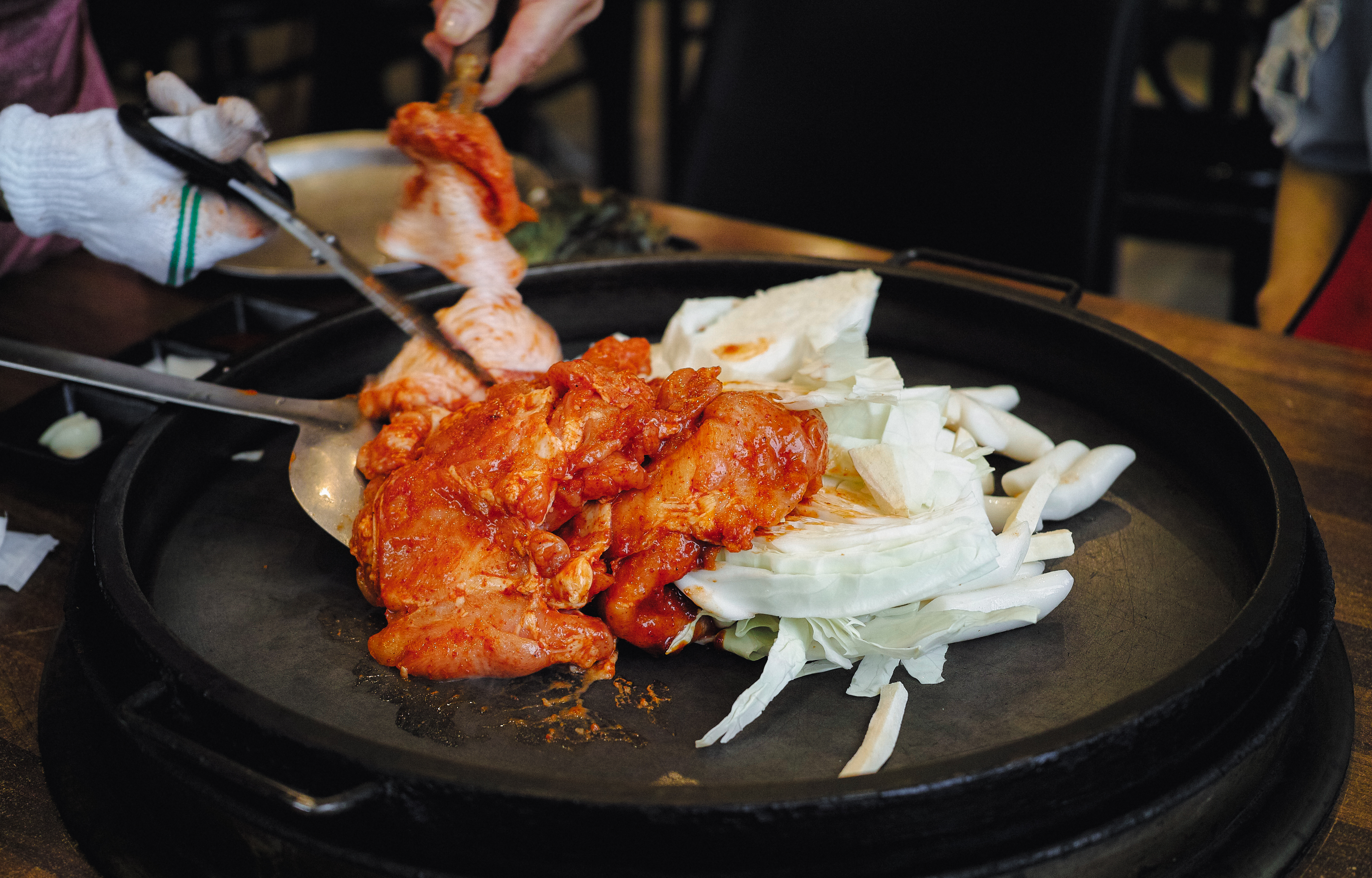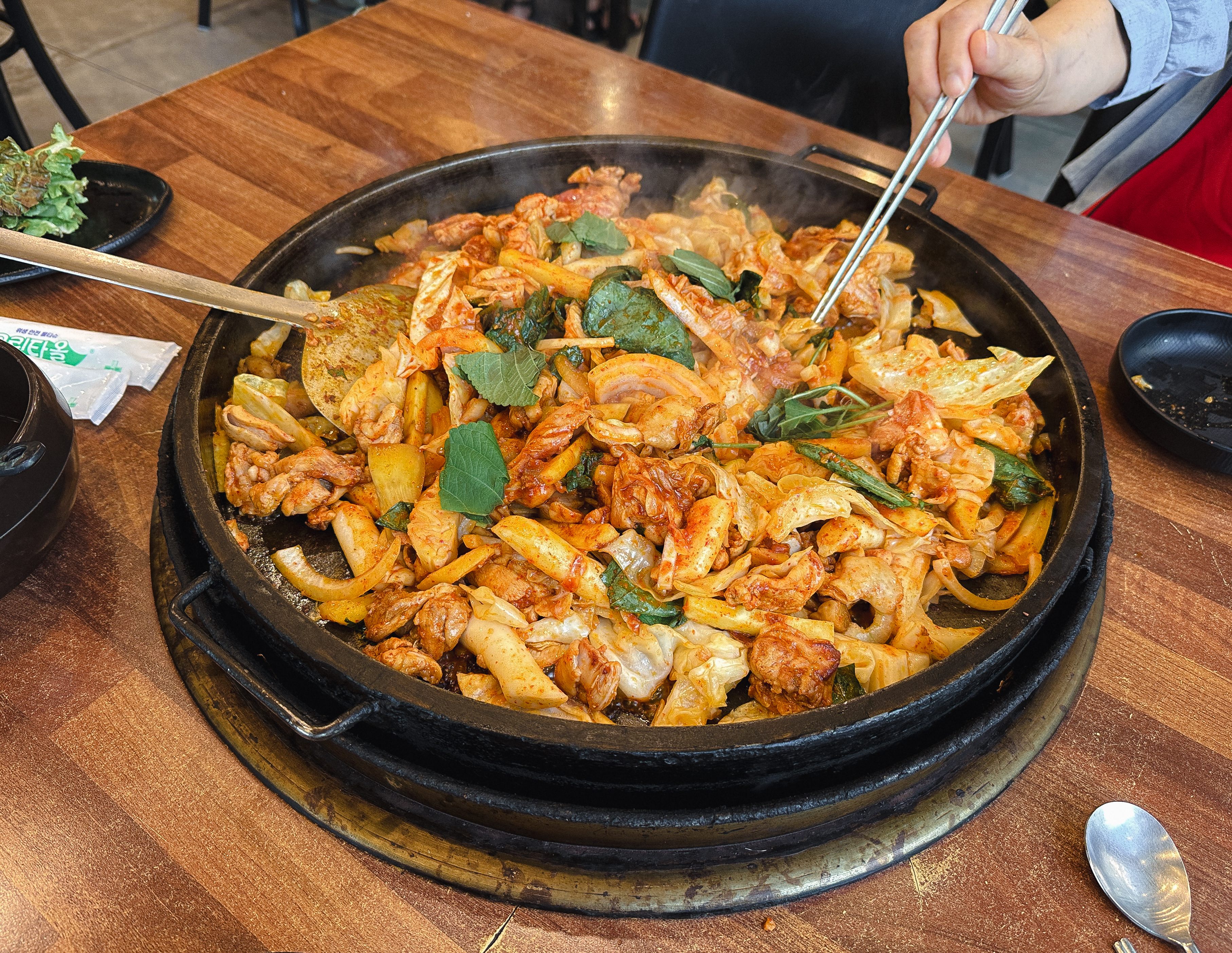 우성닭갈비는 닭갈비를 주문하면 가게의 점원분이 직접 볶아주고 계셨는데, 닭고기가 익으면 별도로 안내를 해주시고 계셨기 때문에 조금 시간이 걸리더라도 기다리다 보면 맛있는 닭갈비를 먹을 수 있었습니다. 닭갈비에 같이 나오는 반찬은 동치미, 상추, 깻잎, 마늘, 양파, 초고추장이 나왔습니다.