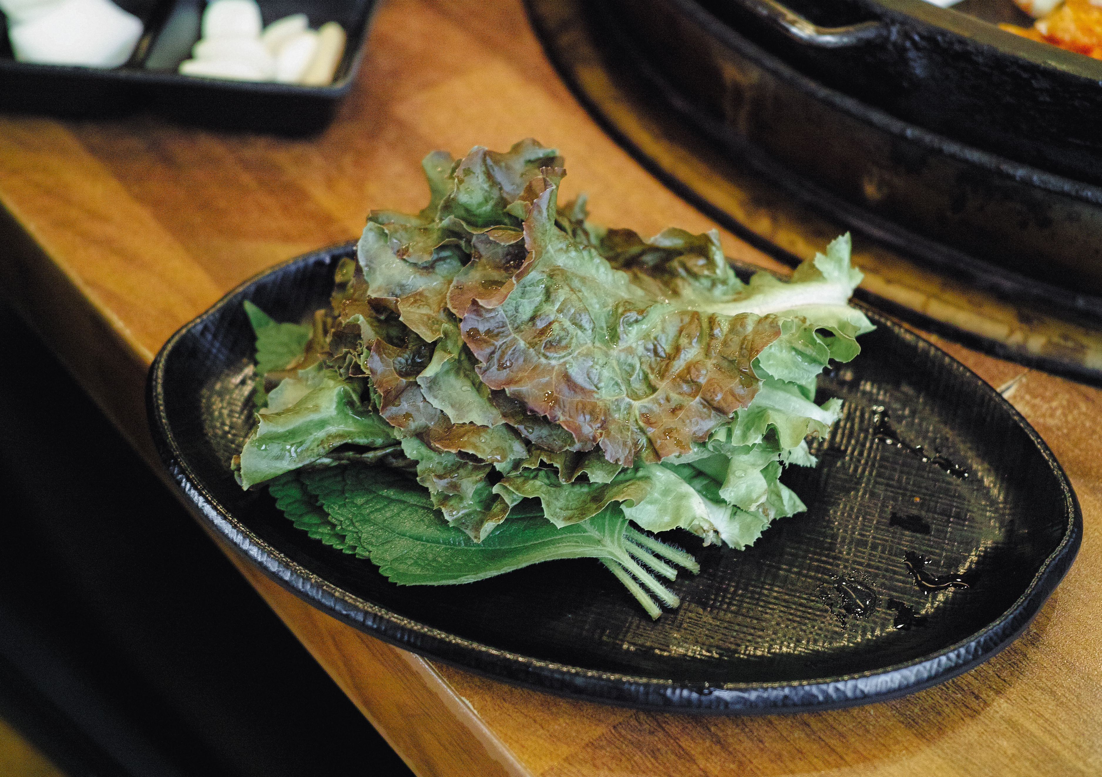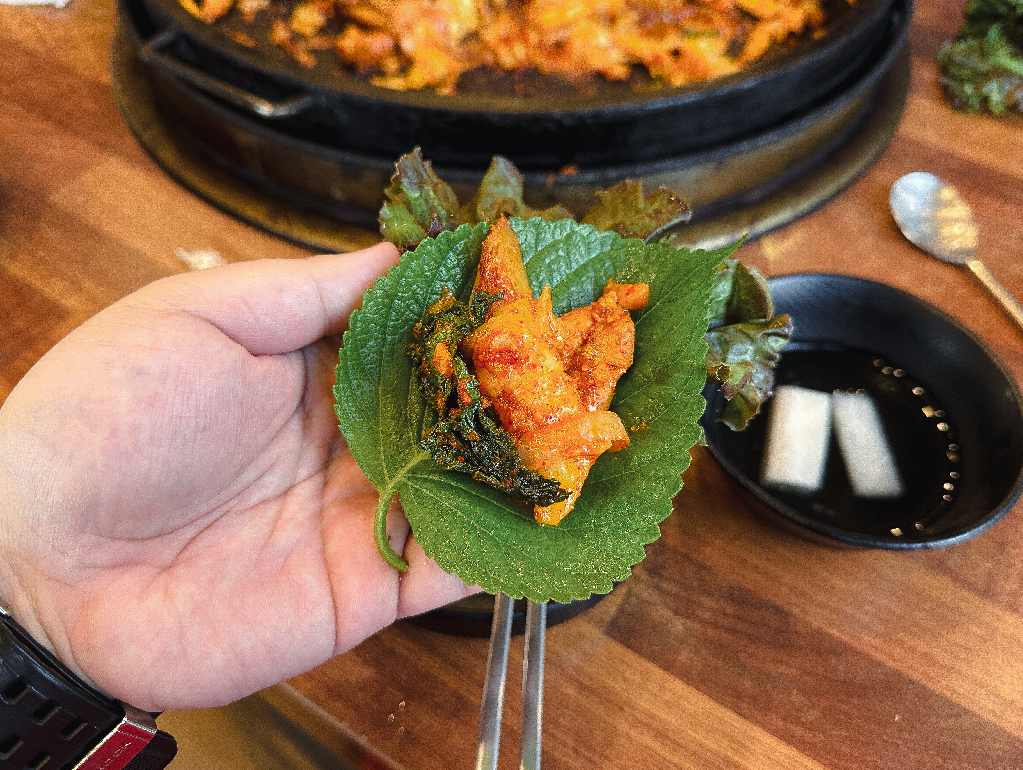 잘 익은 닭갈비는 그냥 먹어도 좋지만, 쌈채소에 곁들여 먹어도 맛있었습니다. 우성닭갈비는 쌈채소나 마늘, 양파 같은 추가반찬은 셀프바에서 직접 가져다 먹을 수 있었습니다. 우성닭갈비는 여러 과정에 걸쳐서 볶아내어 그런지 더 부드러운 닭고기에 진한 양념이 배어있어 맛있었습니다.