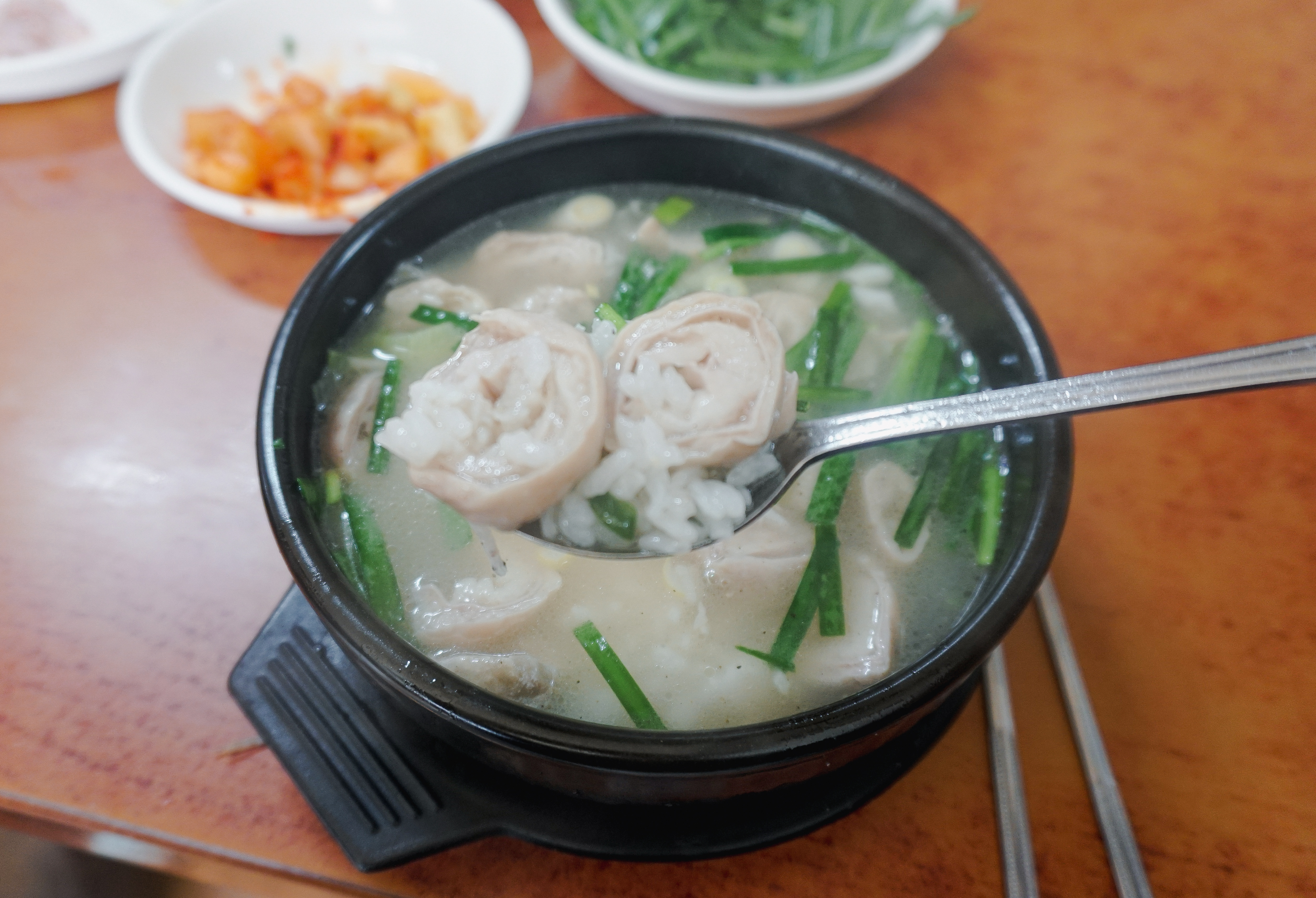 내장국밥에 경상도 쪽에서 '정구지'라 불리는 '부추'를 잔뜩 넣어 섞어주었고, 기호에 따라서 새우젓이나 양념장을 추가하여 먹으면 되었습니다. 저는 개인적으로 깔끔하게 먹는 것을 좋아하기 때문에 추가양념 없이 새우젓으로만 간을 해서 먹었습니다. 간간하면서 담백한 국물과 고소하면서 야들야들한 막창이 맛있었고, 잡내도 없었습니다.
