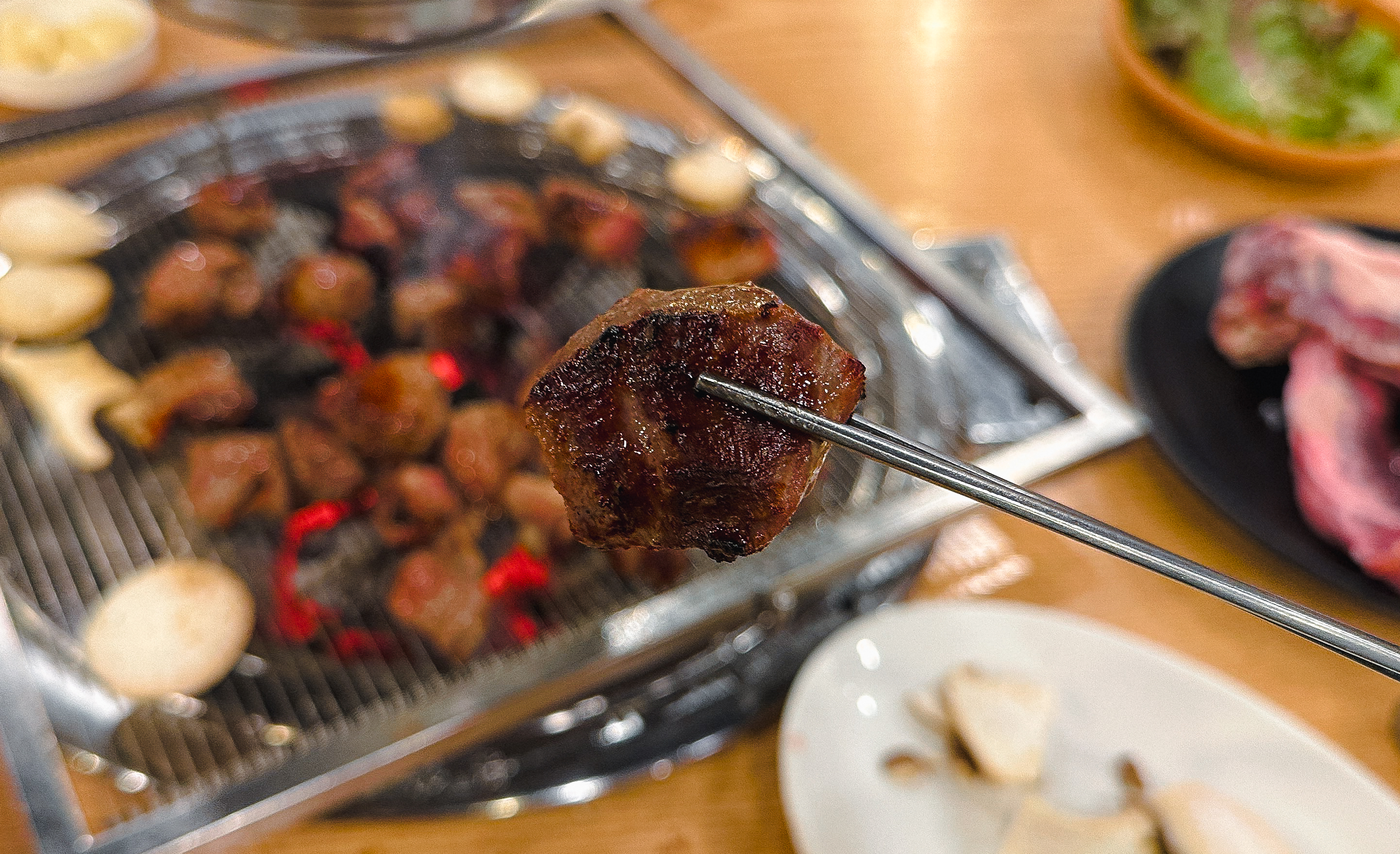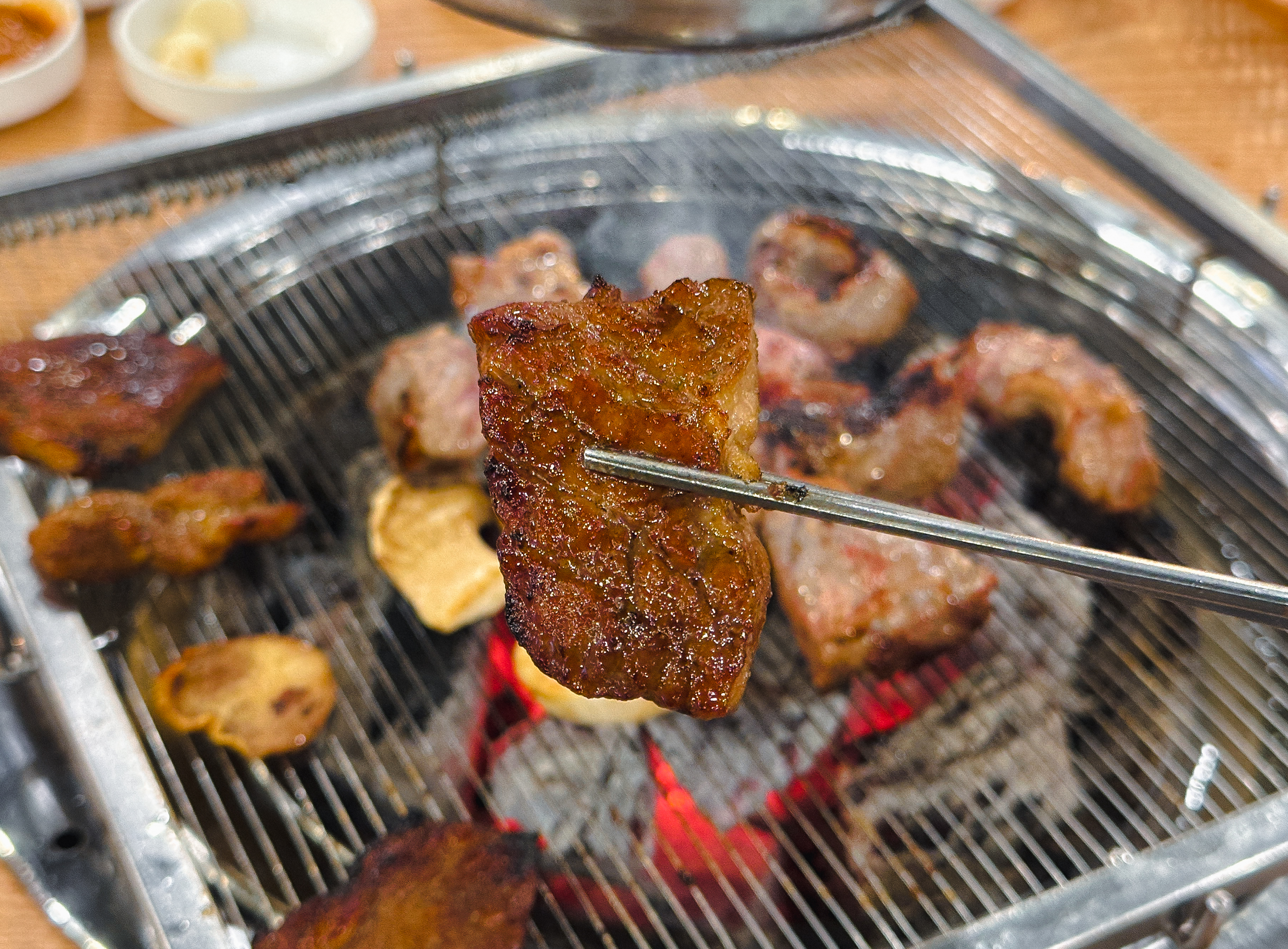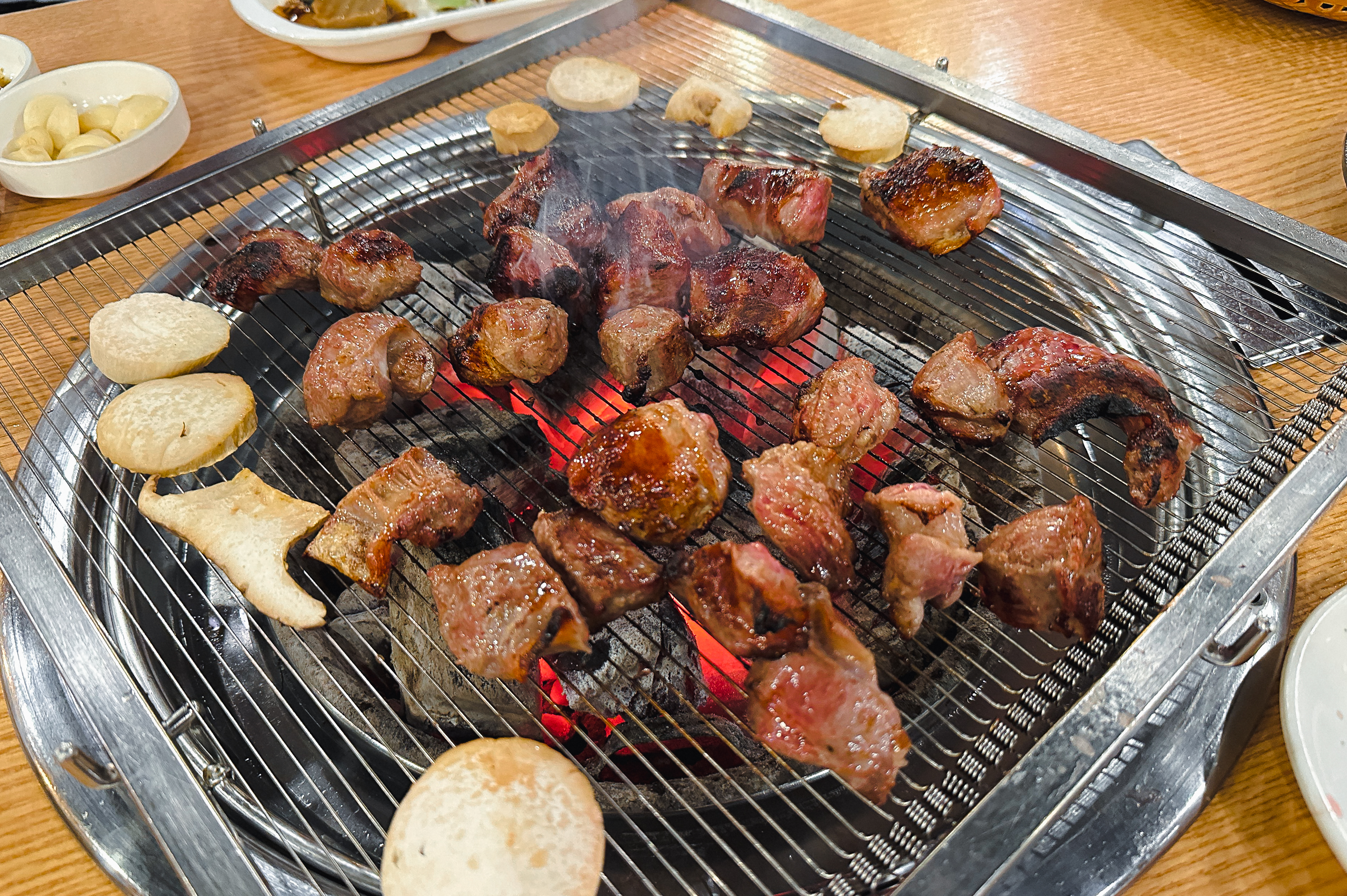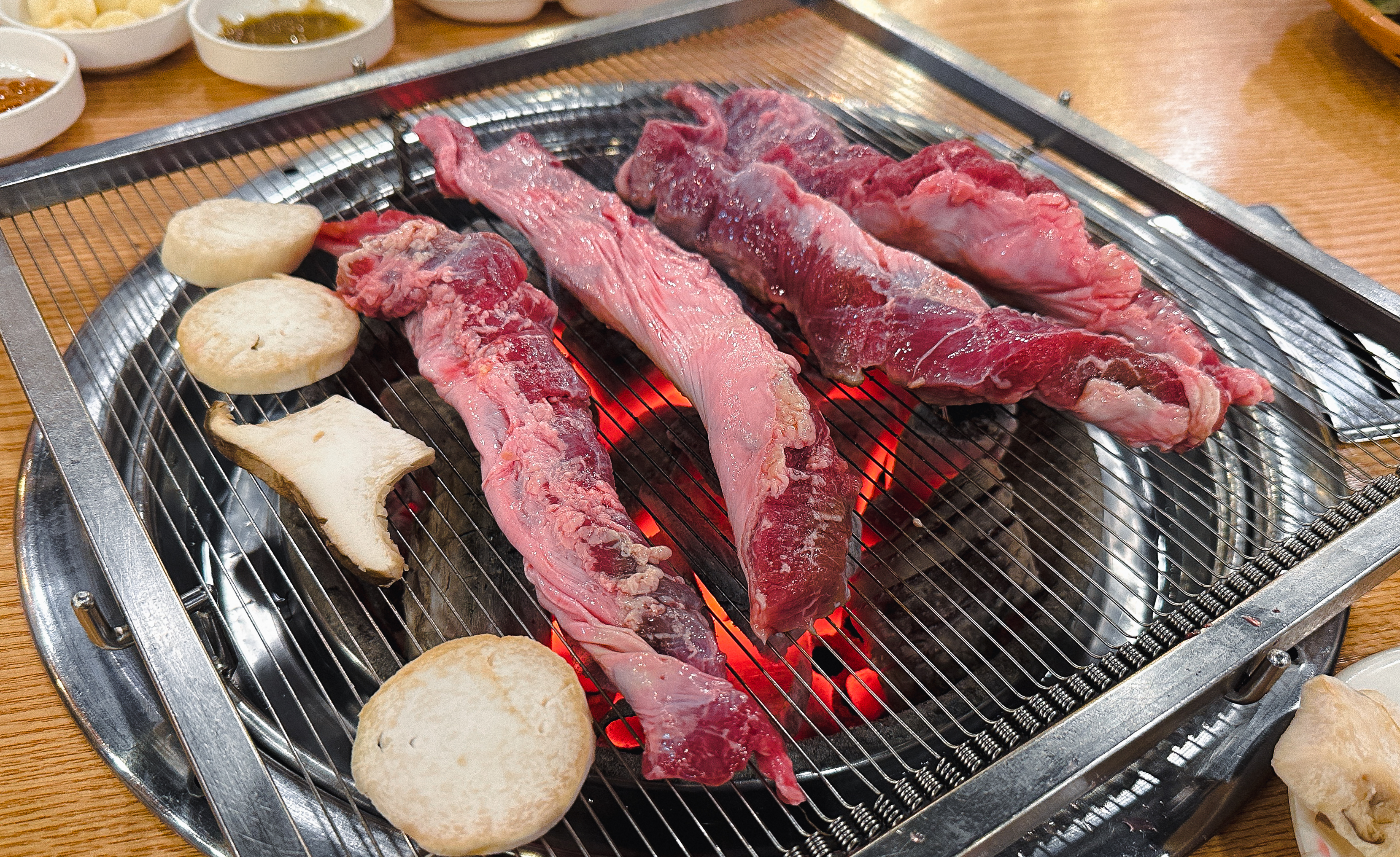 갈비 양념을 한 고기도 구워줬는데, 지방이 적은 부위여서 그런지 고기를 굽다 보면 조금 퍽퍽한 느낌이 들더라고요. 부족한 수분은 양파와 같이 곁들이거나 채소와 곁들여 먹으면 괜찮았습니다. 그래도 저는 태능참숯화로구이의 갈매기살이 가장 무난하고 맛있더라고요.