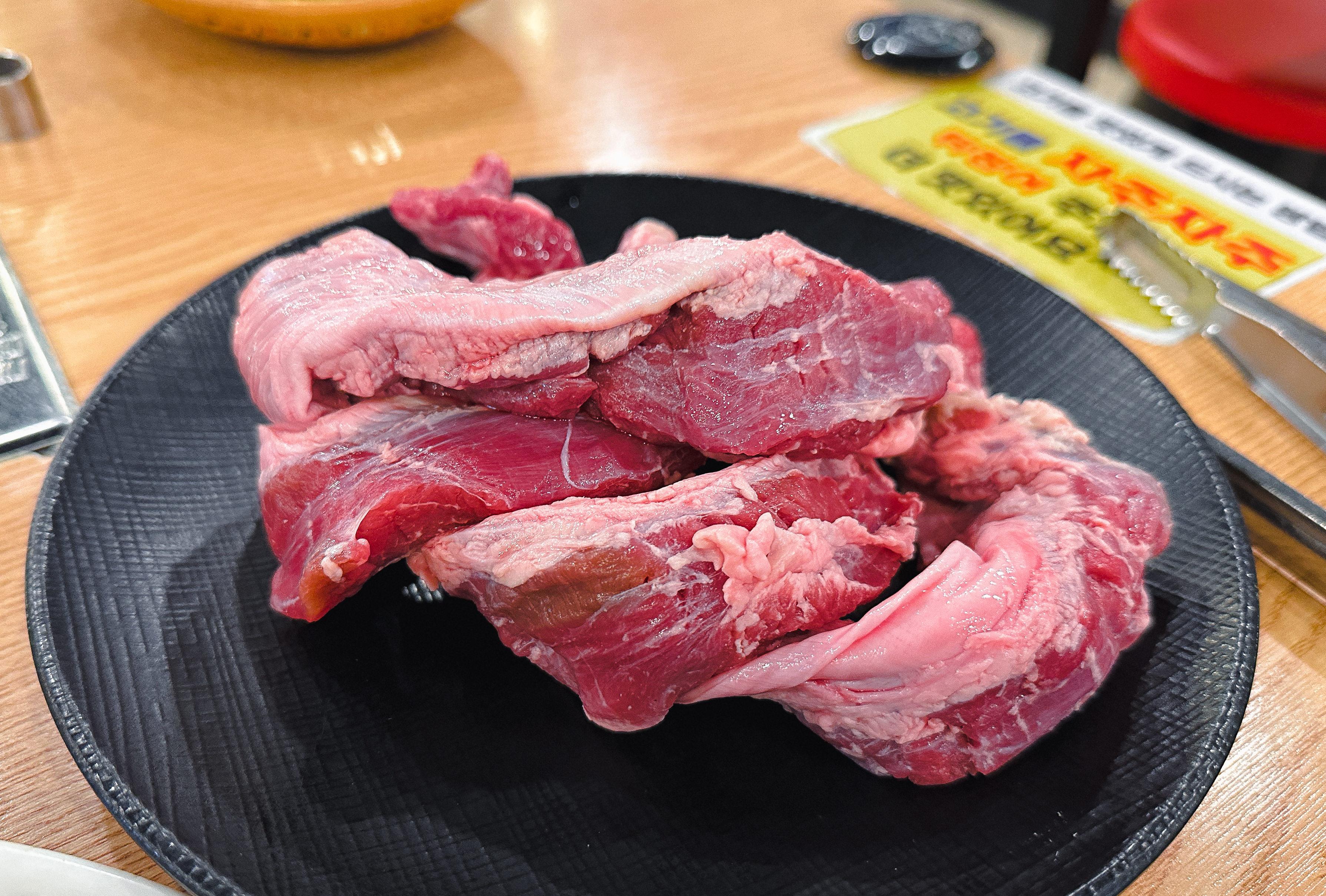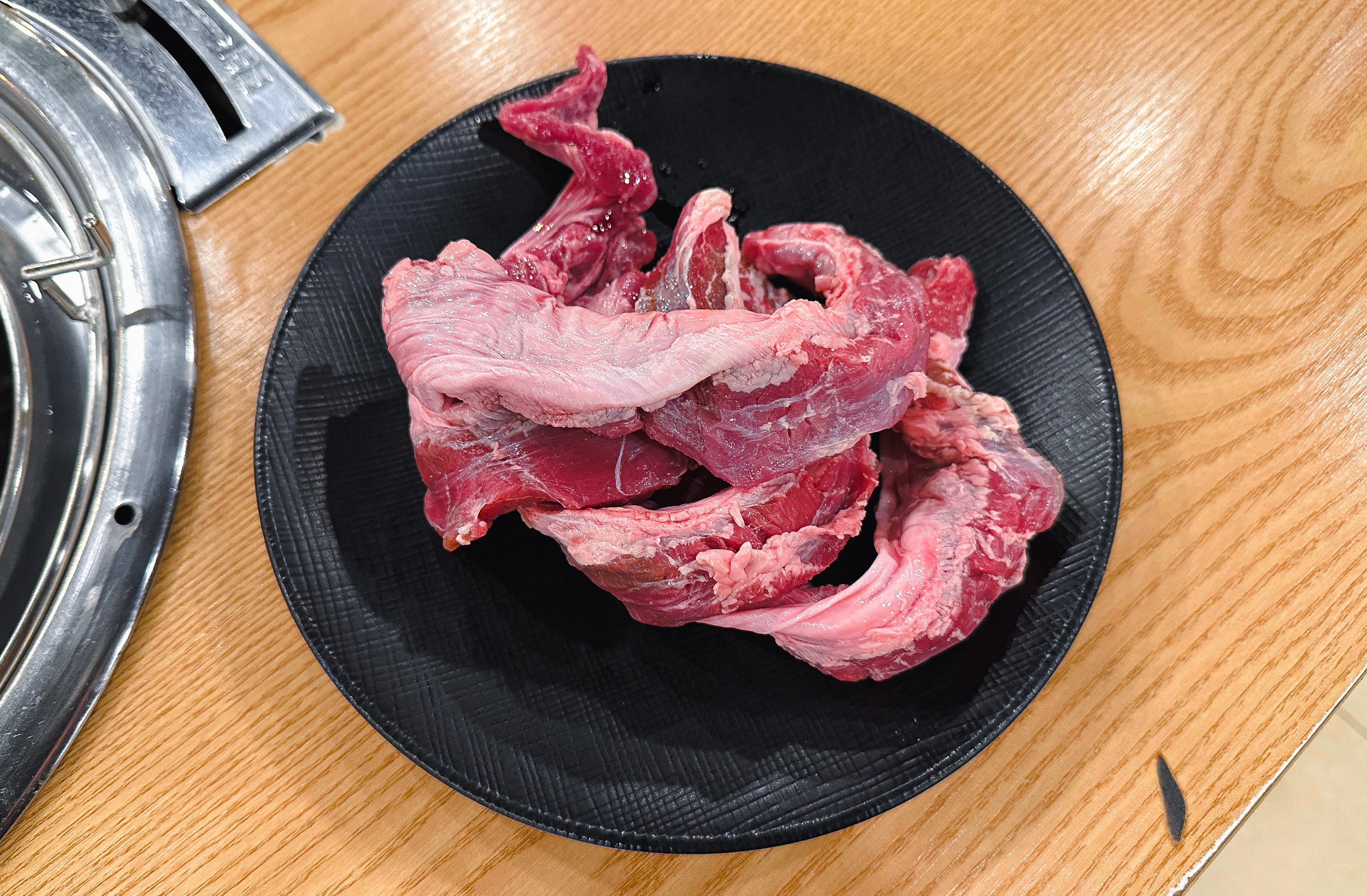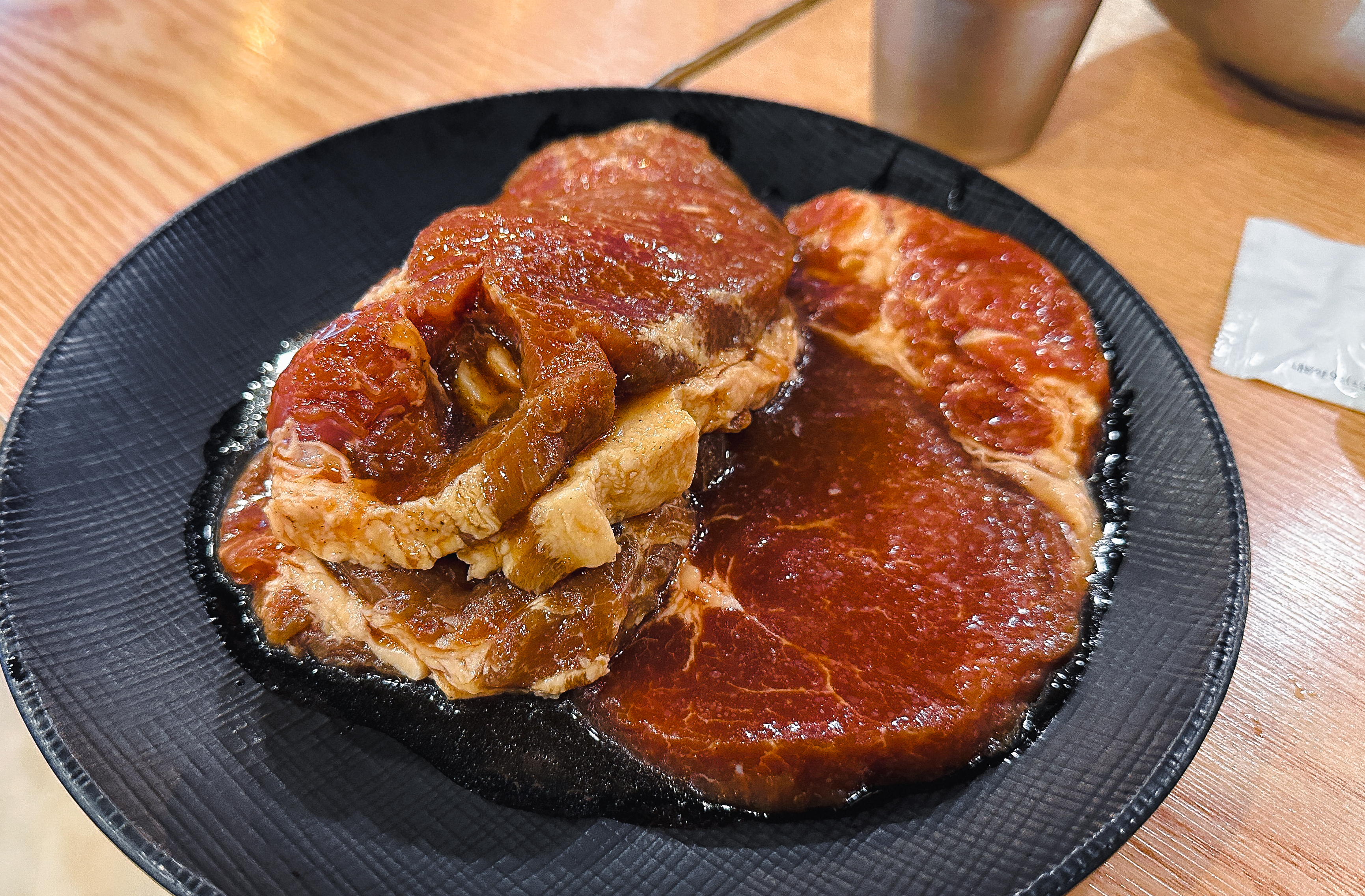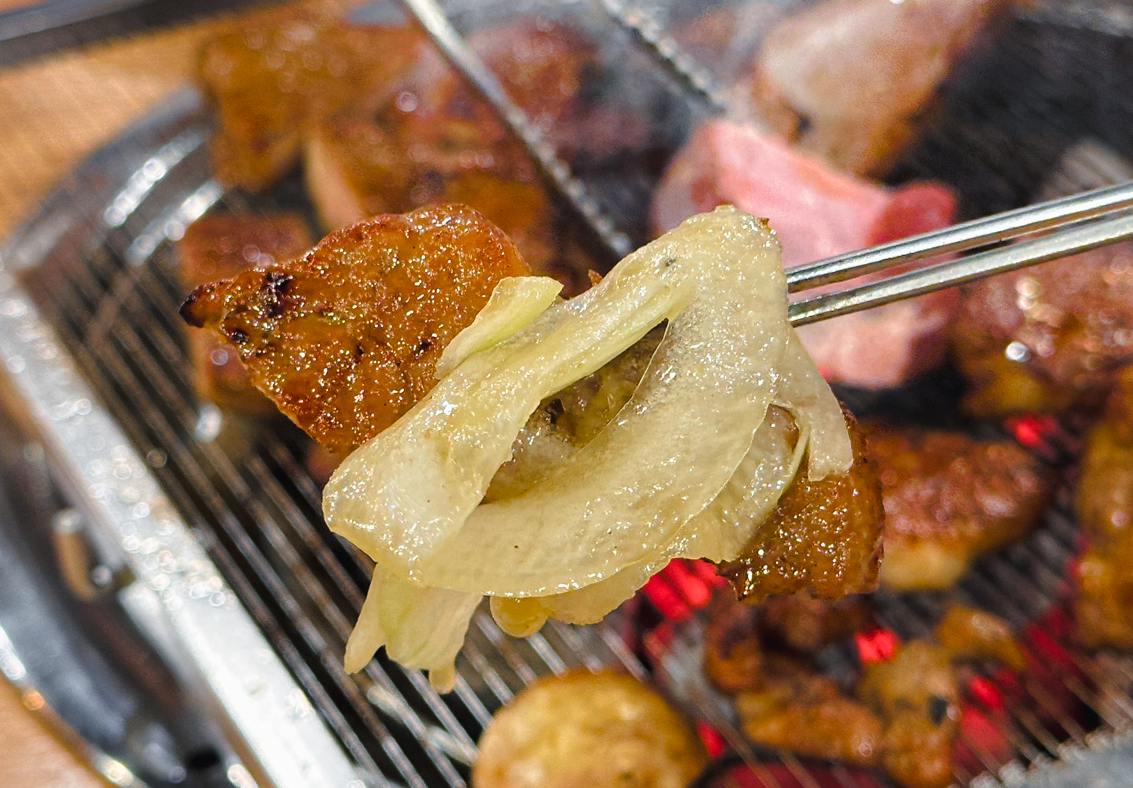 갈비 양념을 한 고기도 구워줬는데, 지방이 적은 부위여서 그런지 고기를 굽다 보면 조금 퍽퍽한 느낌이 들더라고요. 부족한 수분은 양파와 같이 곁들이거나 채소와 곁들여 먹으면 괜찮았습니다. 그래도 저는 태능참숯화로구이의 갈매기살이 가장 무난하고 맛있더라고요.