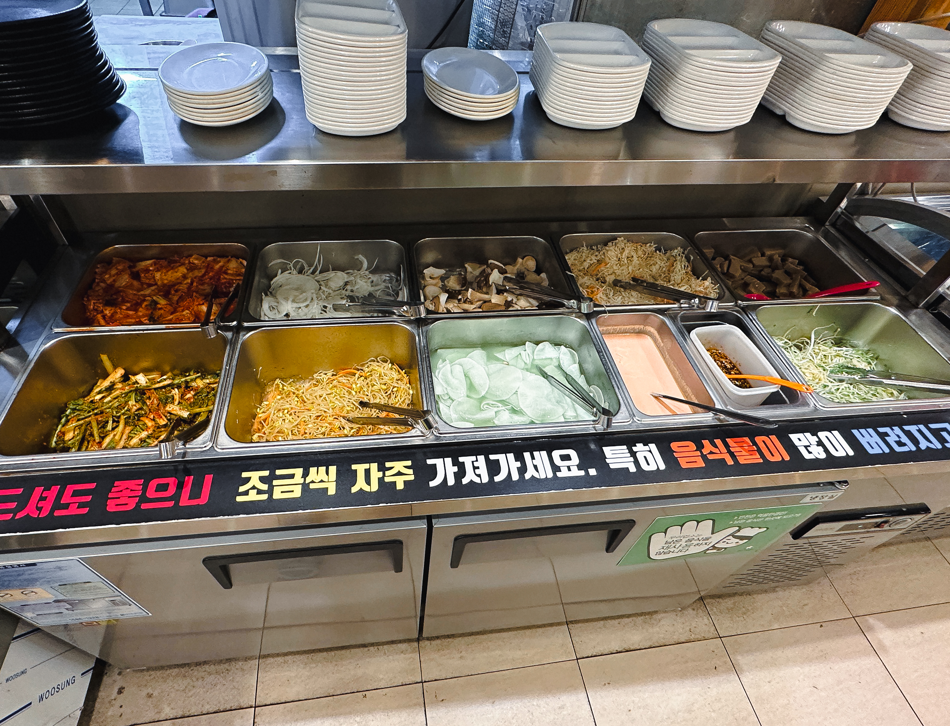 갈매기살을 비롯한 다양한 고기들은 고기냉장고에서 직접 가져다 먹을 수 있었고, 전체적으로 식기류부터 집게 가위 같은 집기까지 깔끔하게 잘 유지되고 있었습니다. 반찬 역시 직접 덜어먹을 수 있었는데, 반찬들은 나물과 김치, 버섯, 샐러드 등이 있었습니다.