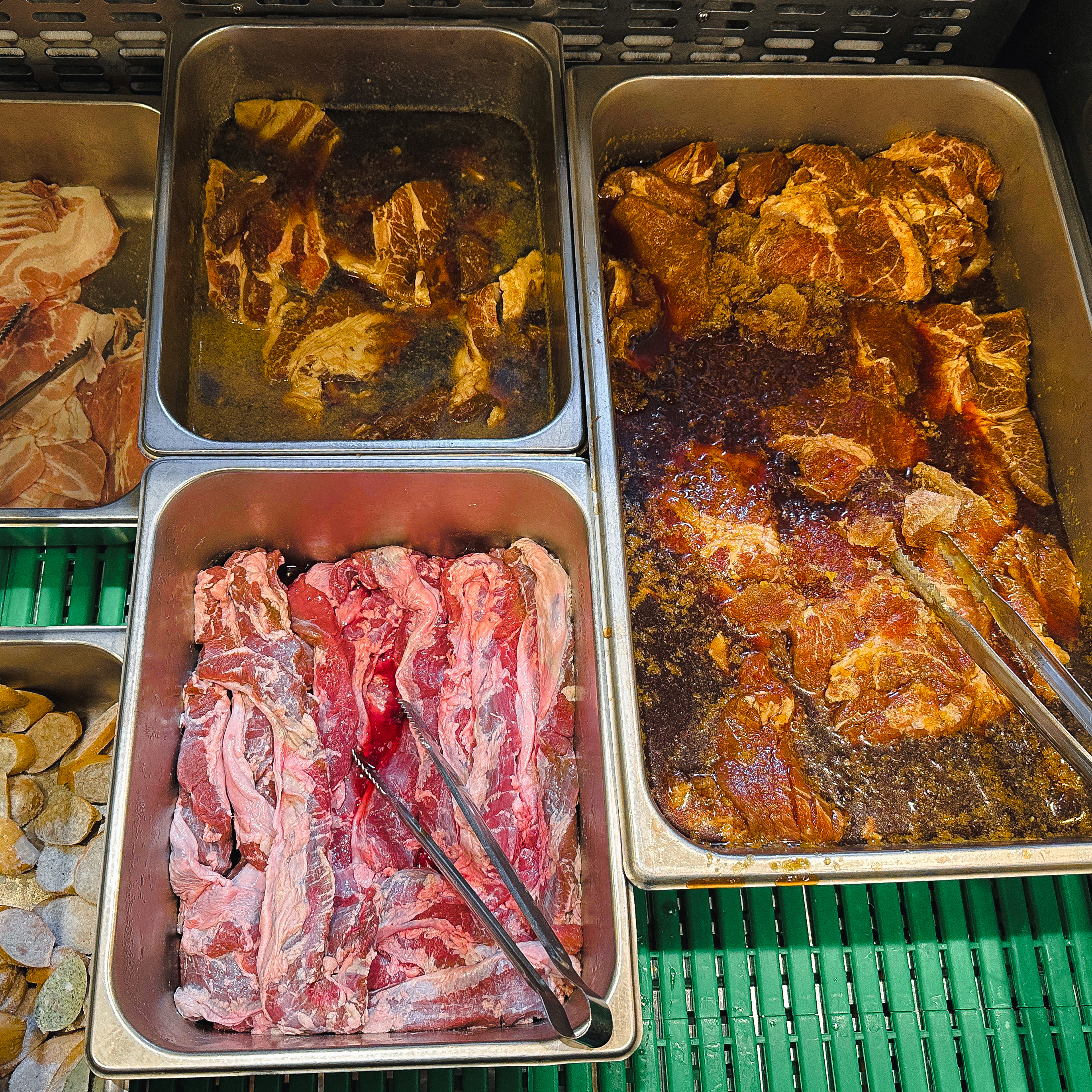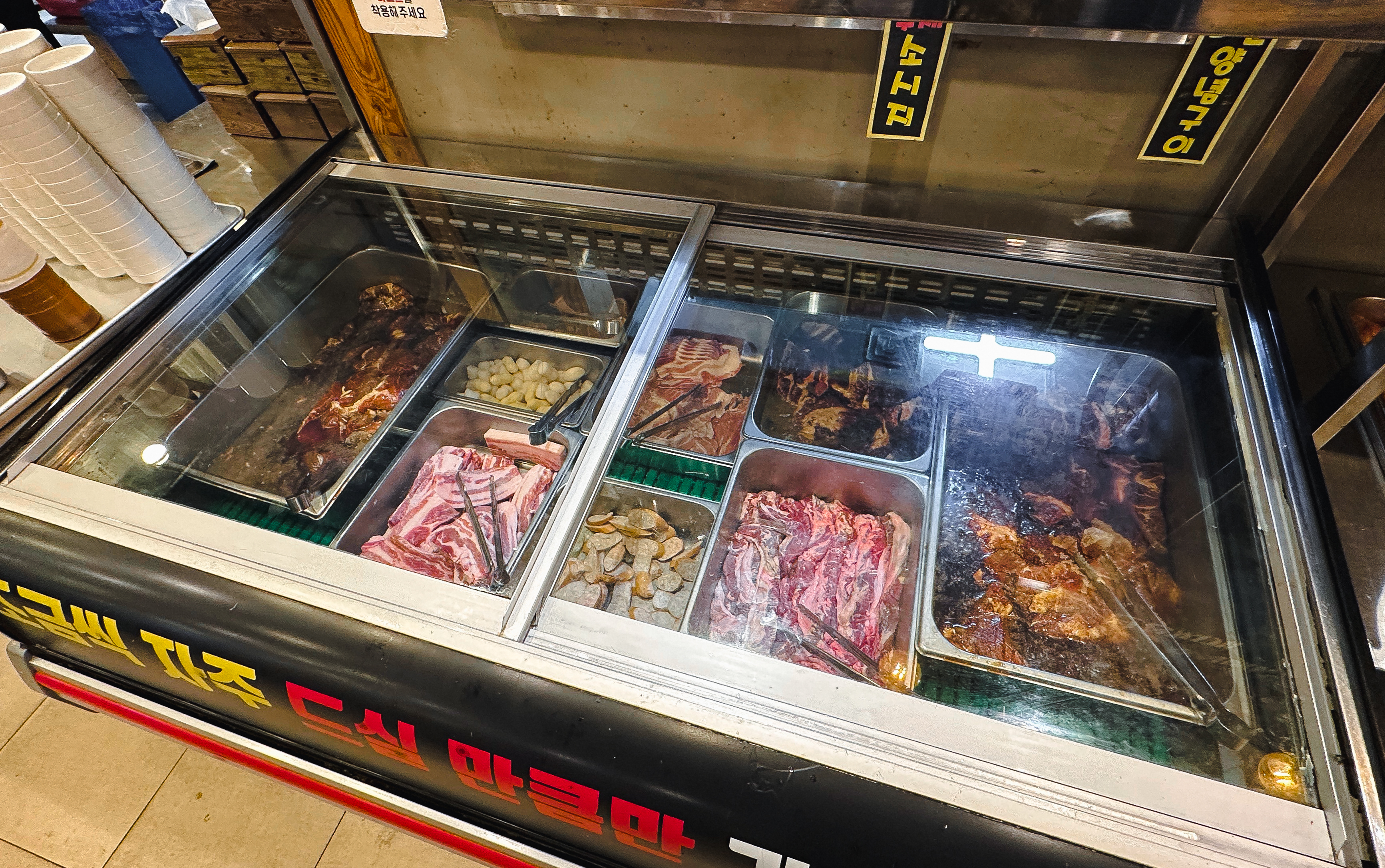 고기의 종류는 주로 양념갈비, 껍데기, 떡, 소시지, 삼겹살, 갈매기살 등이 있었습니다. 종류가 다양하지는 않았지만, 가게의 주력인 갈매기살과 양념갈비 위주로 골라먹을 수 있도록 되어있었습니다.
