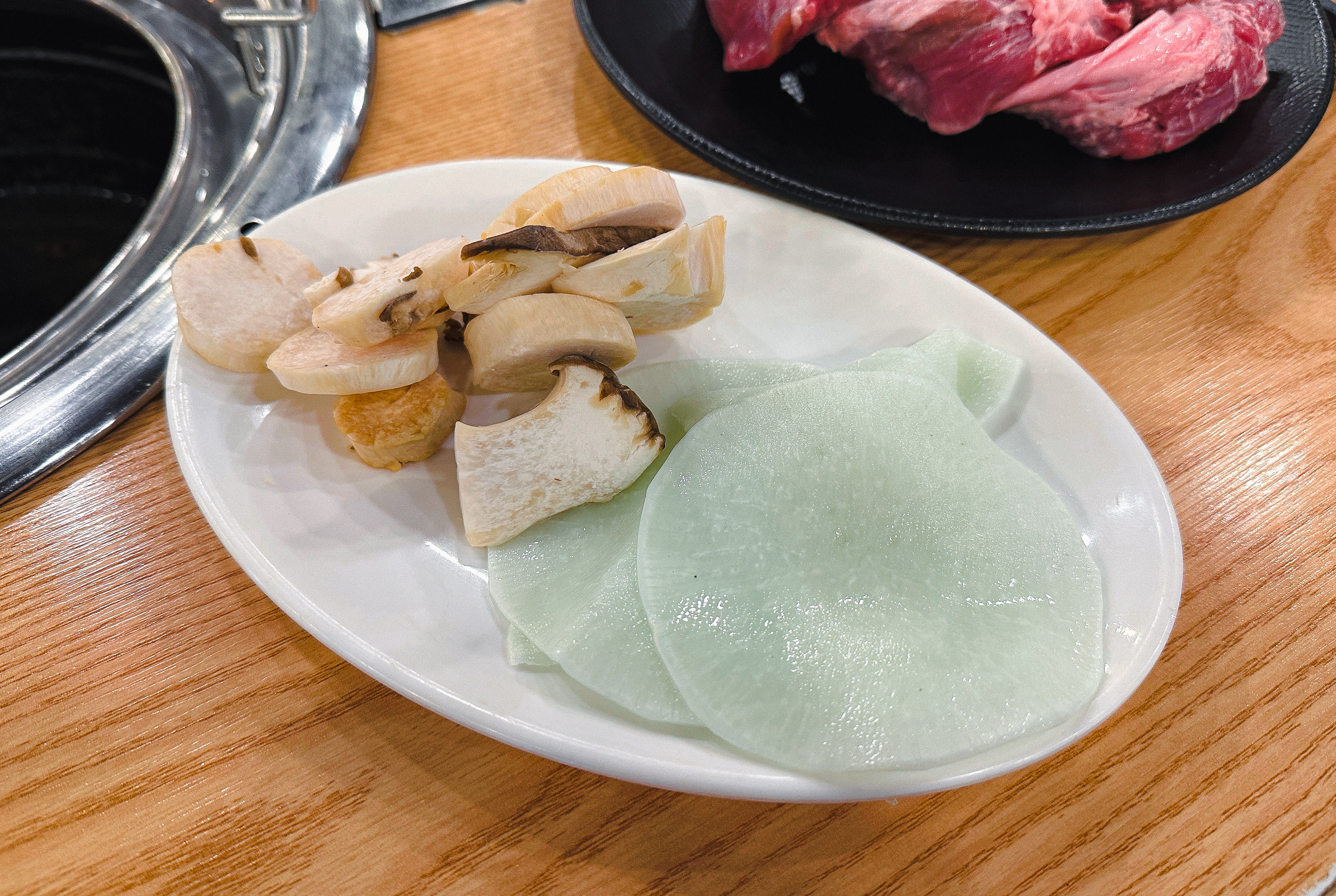 먹고 싶었던 고기와 반찬을 접시에 덜어서 자리에 가져왔습니다. 기본적으로 상추와 양파는 제공해주고 있었고 나머지 반찬들을 가져다 먹었습니다. 저희는 처음으로 갈매기살을 구웠고, 나중에 양념갈비를 추가로 구웠습니다.