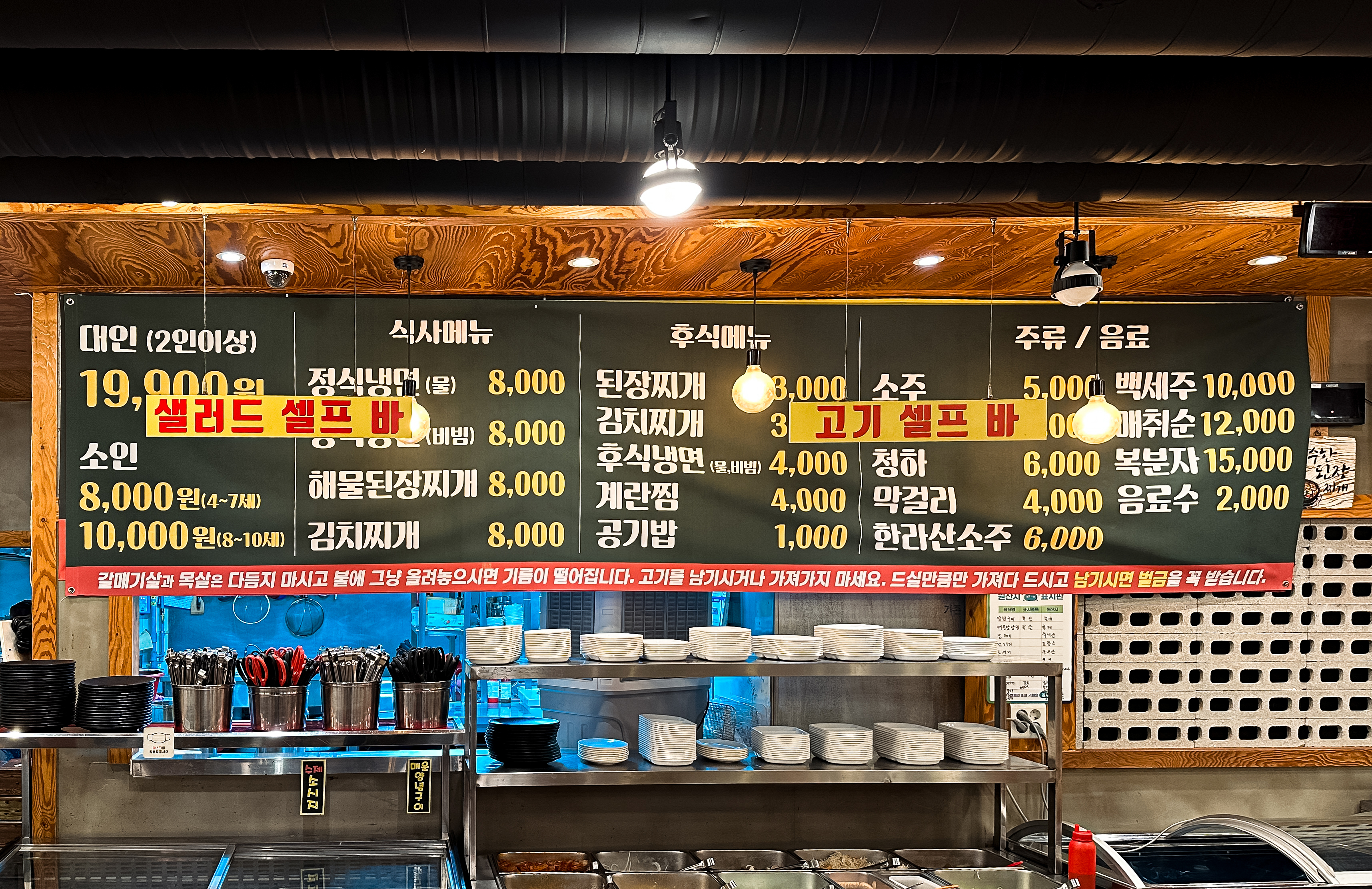 태능참숯화로구이 모란점은 이용료로 성인 19,900원, 어린이 8,000~10,000원을 받고 있었습니다. 기본적으로 고기뷔페가 제공되며, 곁들이는 메뉴로 정식냉면(물/비빔), 해물된장찌개, 김치찌개, 계란찜 등을 선택할 수 있었습니다.