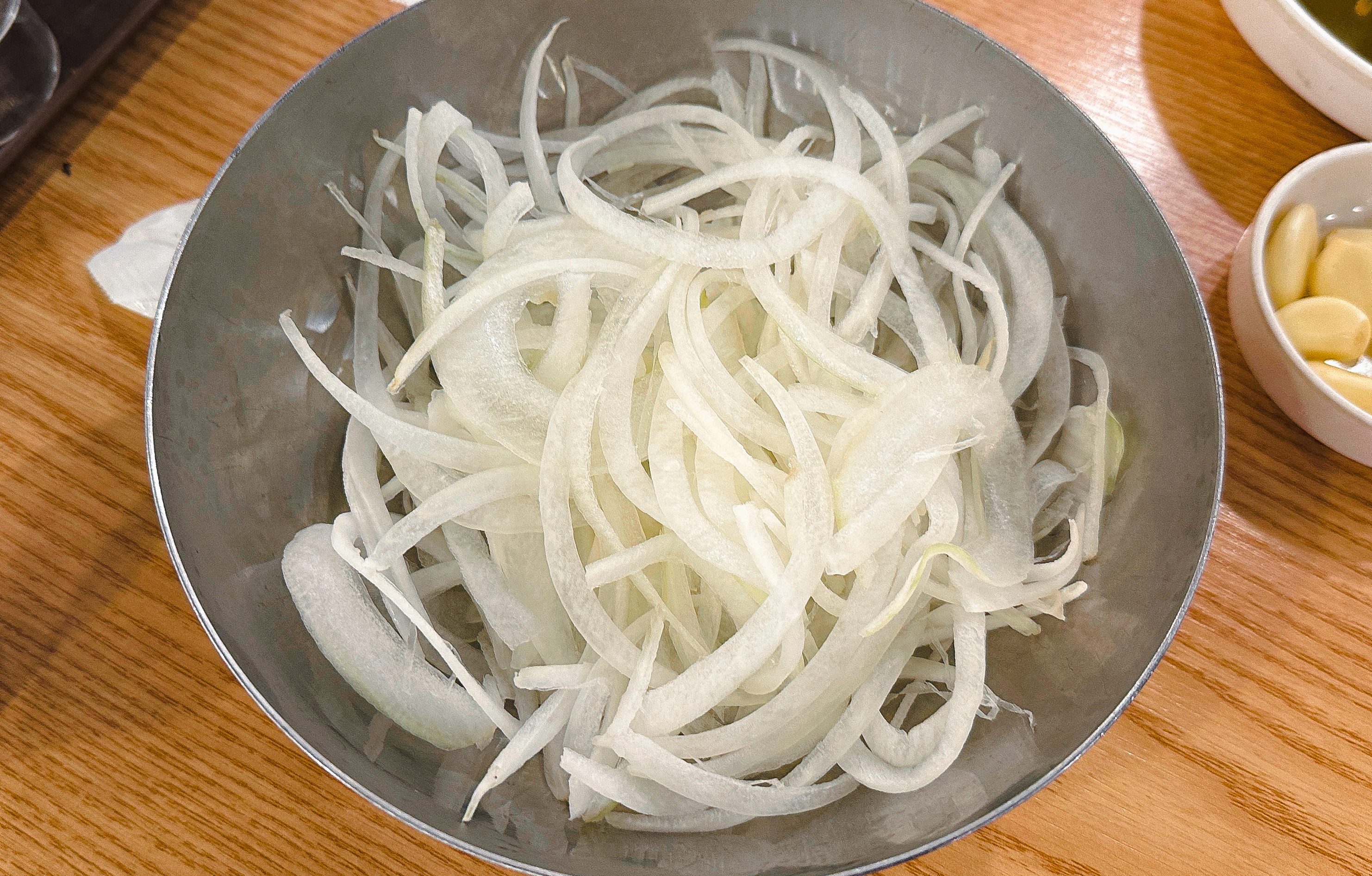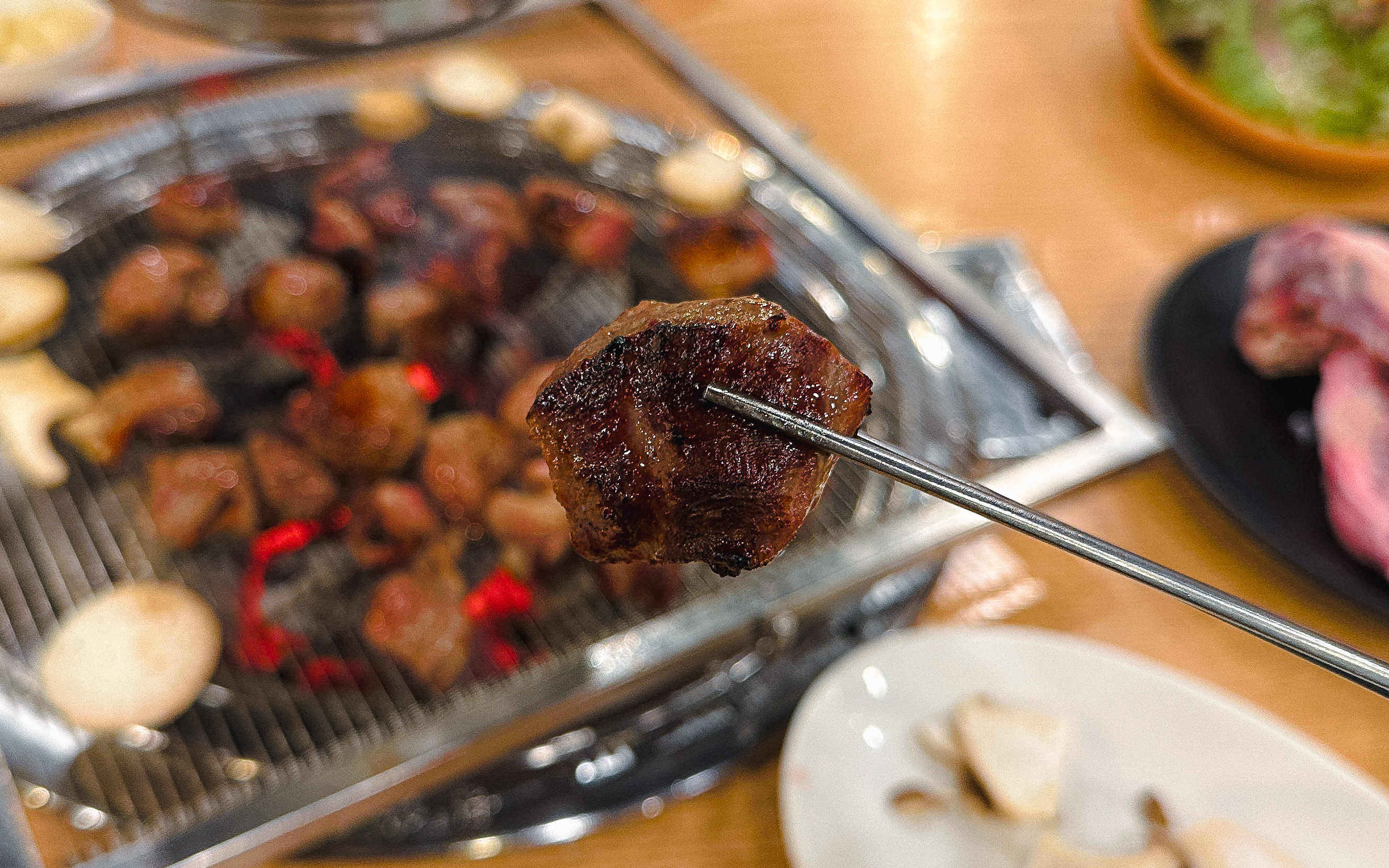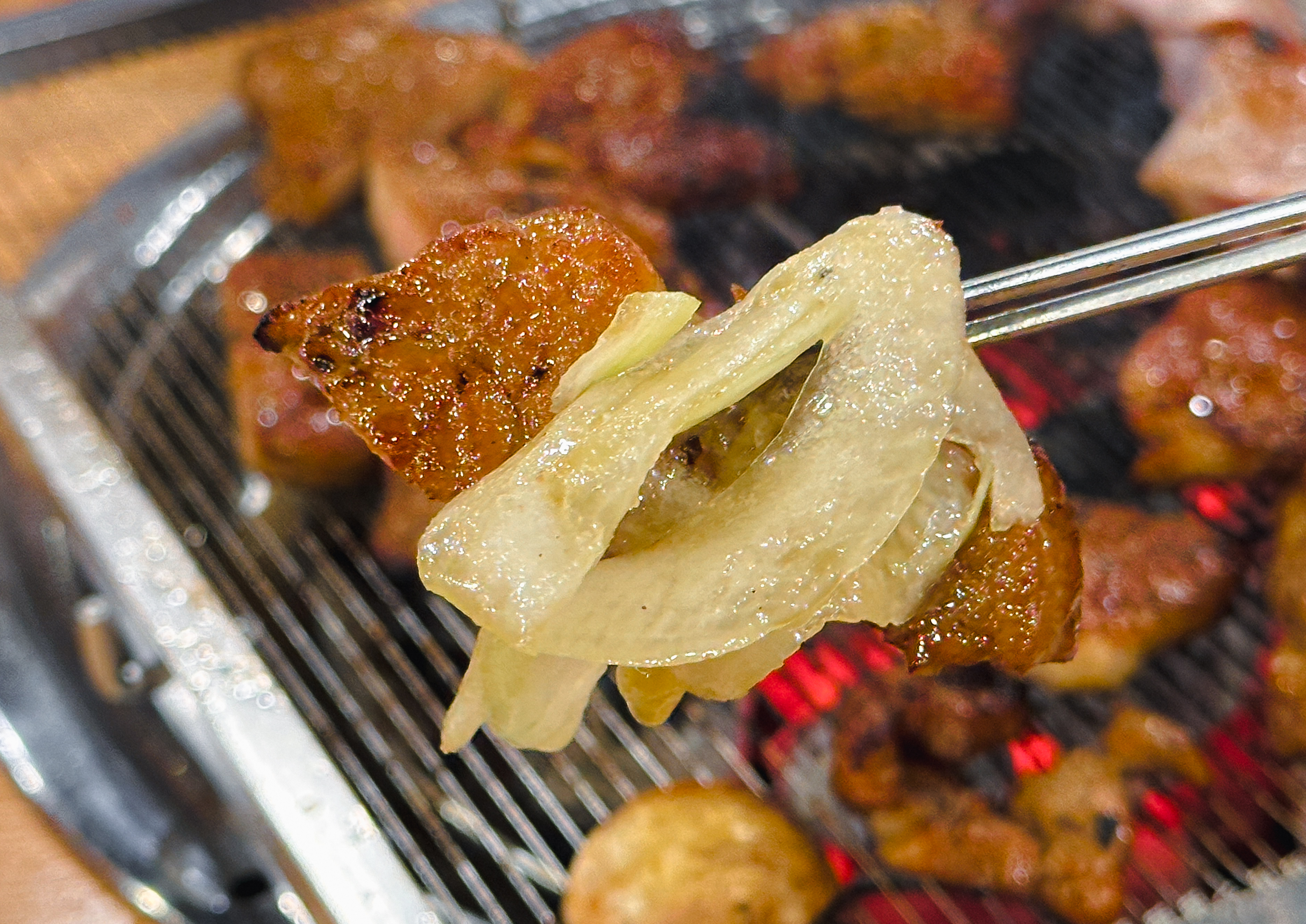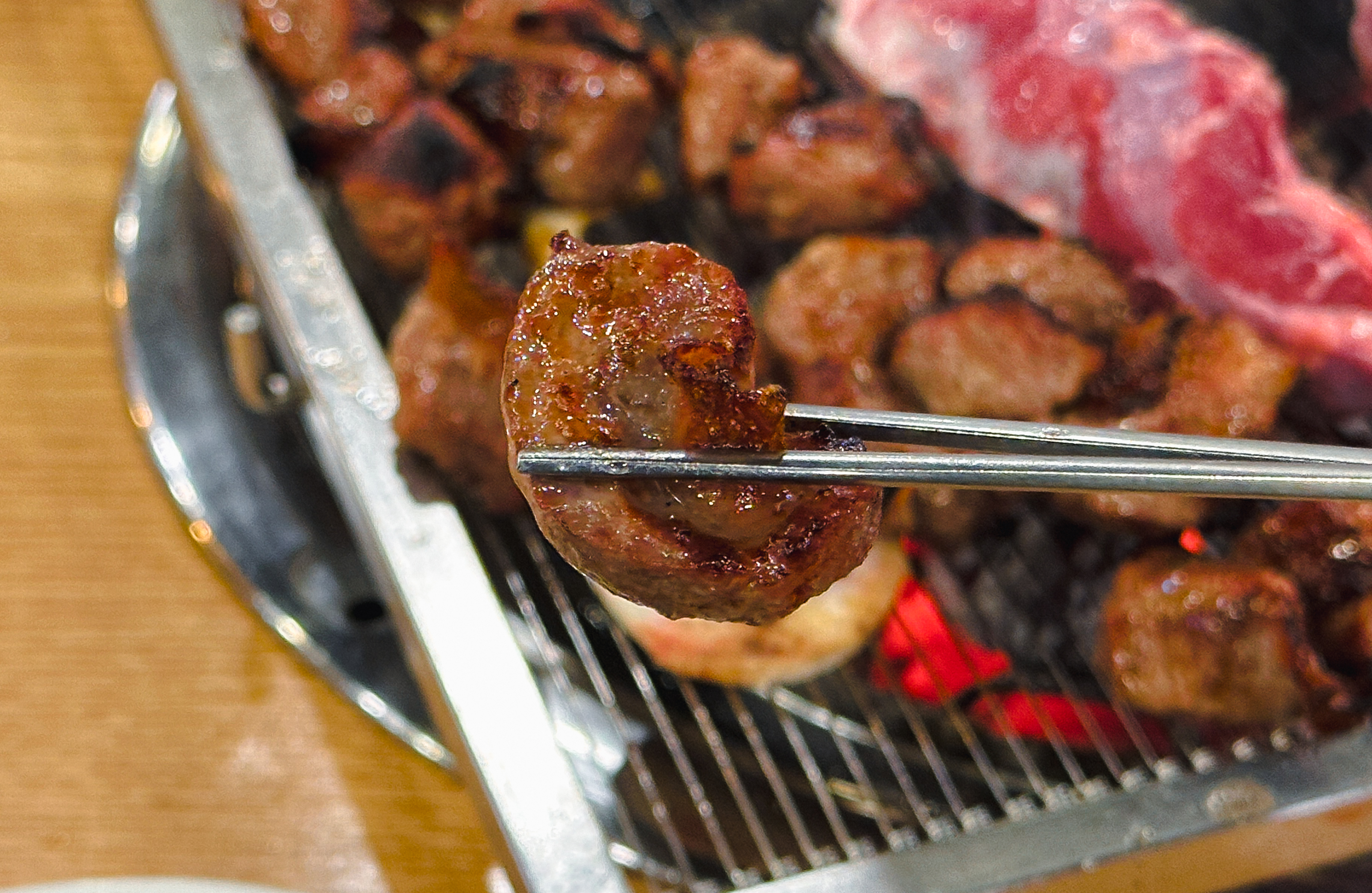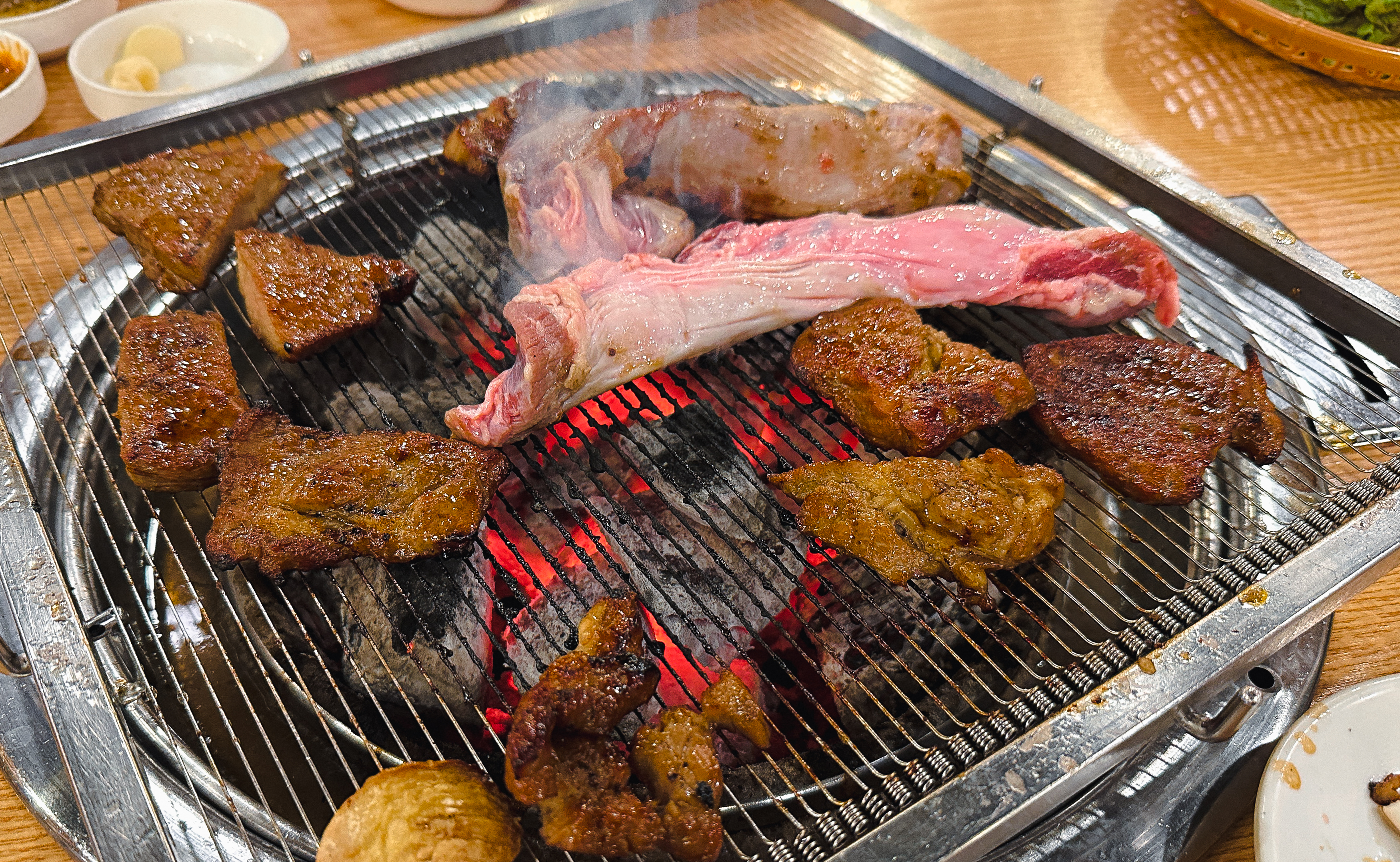 갈비 양념을 한 고기도 구워줬는데, 지방이 적은 부위여서 그런지 고기를 굽다 보면 조금 퍽퍽한 느낌이 들더라고요. 부족한 수분은 양파와 같이 곁들이거나 채소와 곁들여 먹으면 괜찮았습니다. 그래도 저는 태능참숯화로구이의 갈매기살이 가장 무난하고 맛있더라고요.